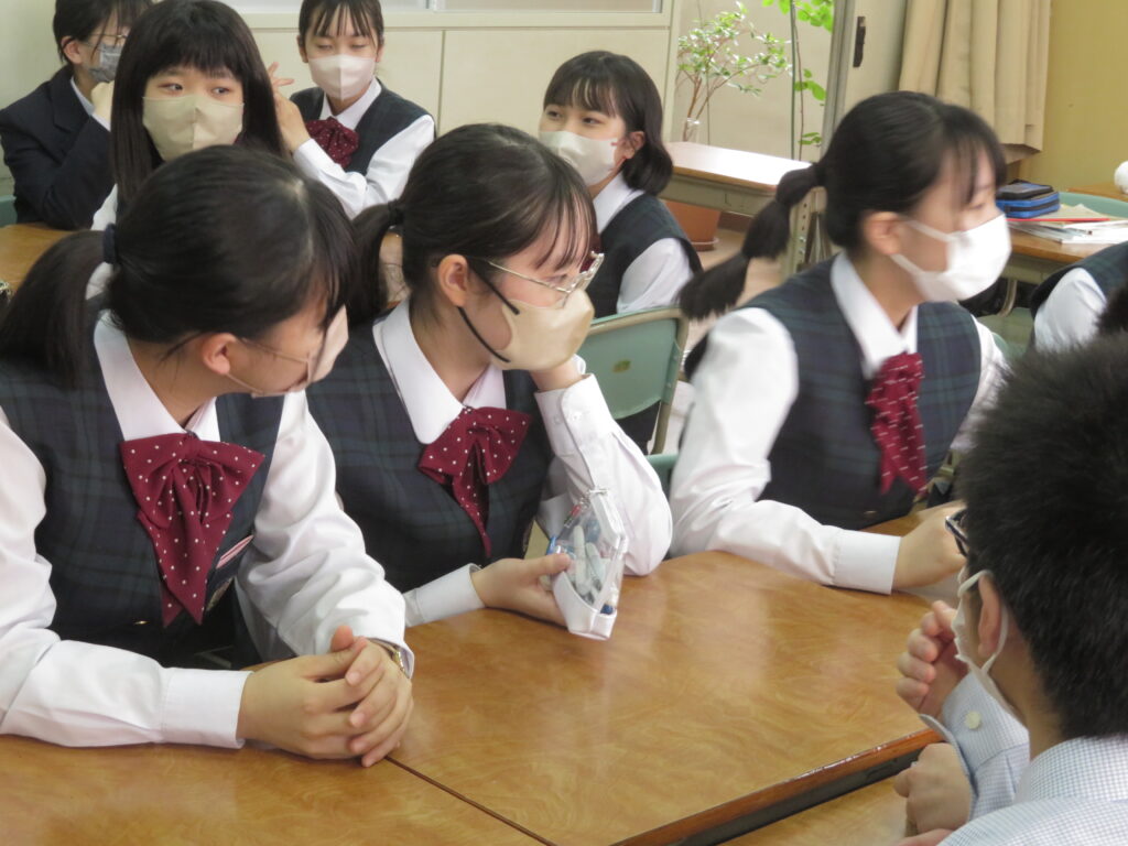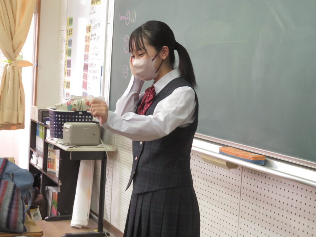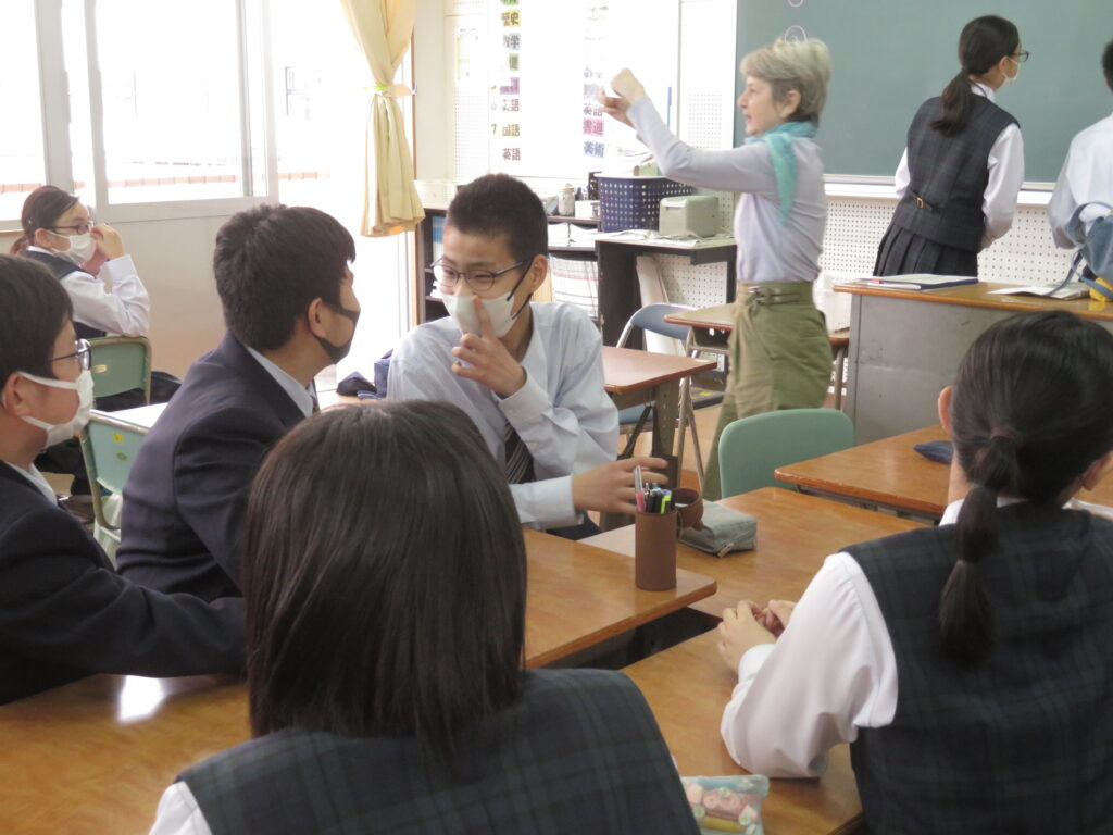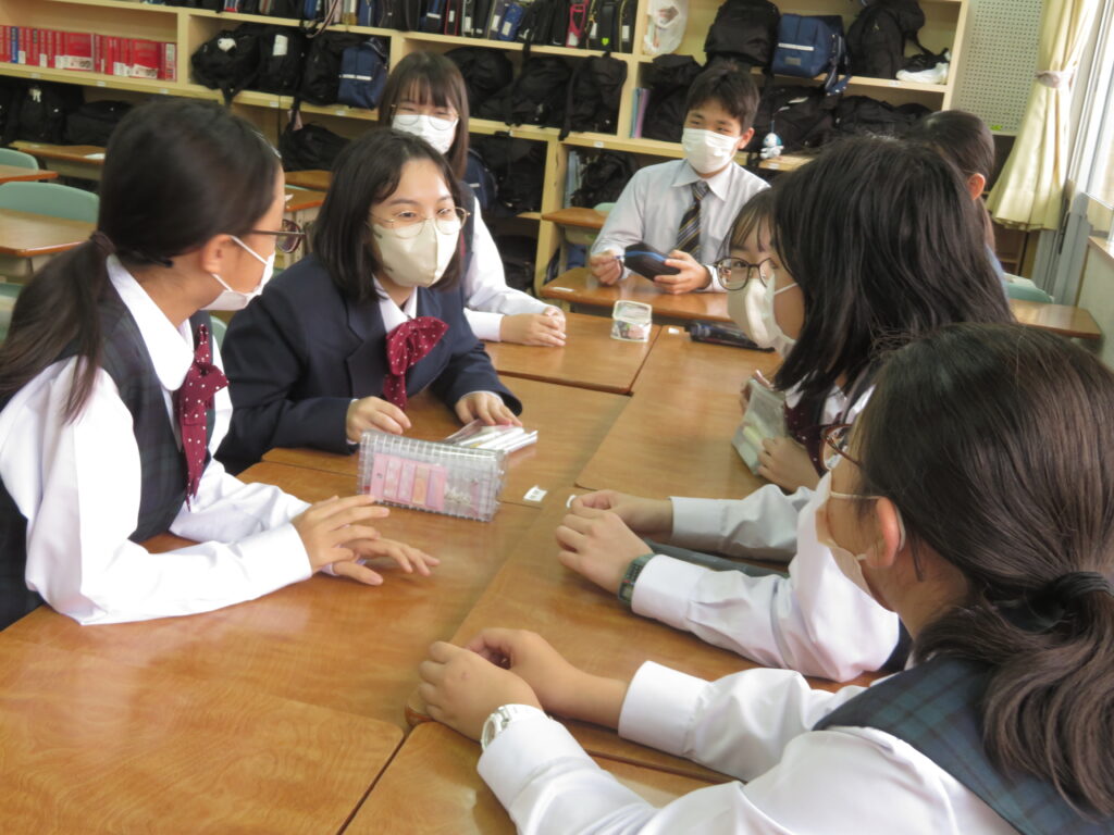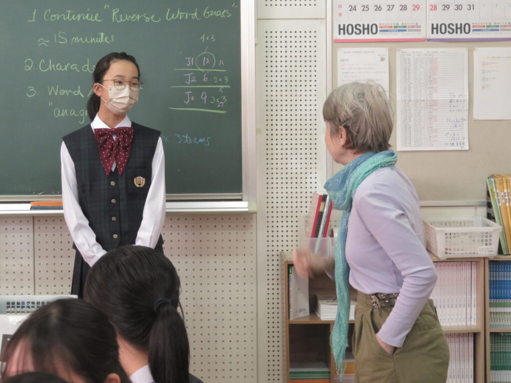 トンプソン先生から出されたお題となる英単語をその単語そのものを言わずに説明をします。解答者はその英単語が何なのか考えると言うゲームです。J1生も英語の学習が始まったばかりですが、先輩たちに教えてもらいながら必死に考え、説明をしようと頑張っています。
