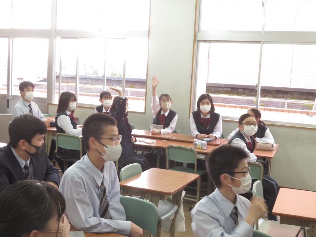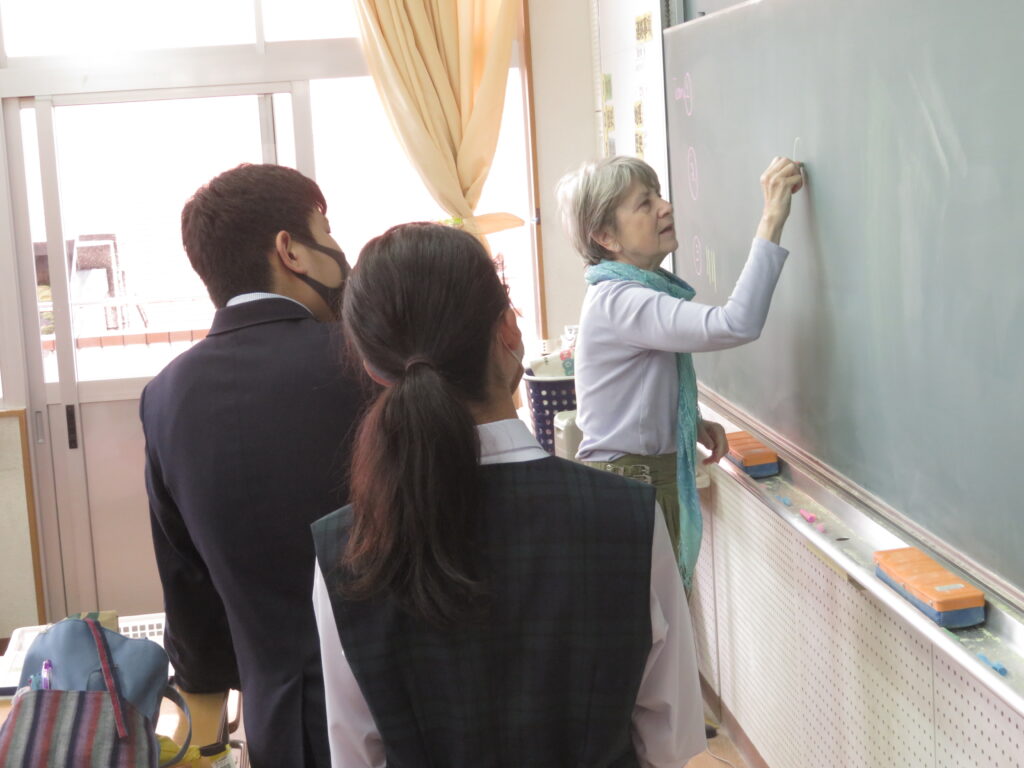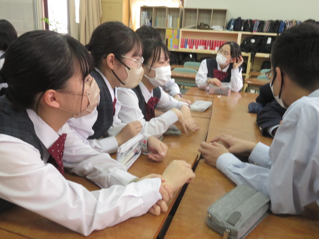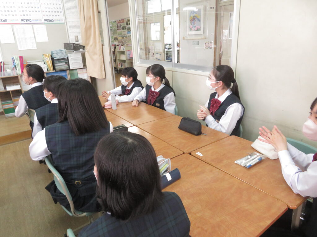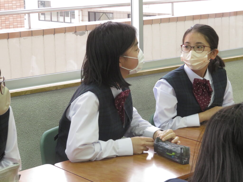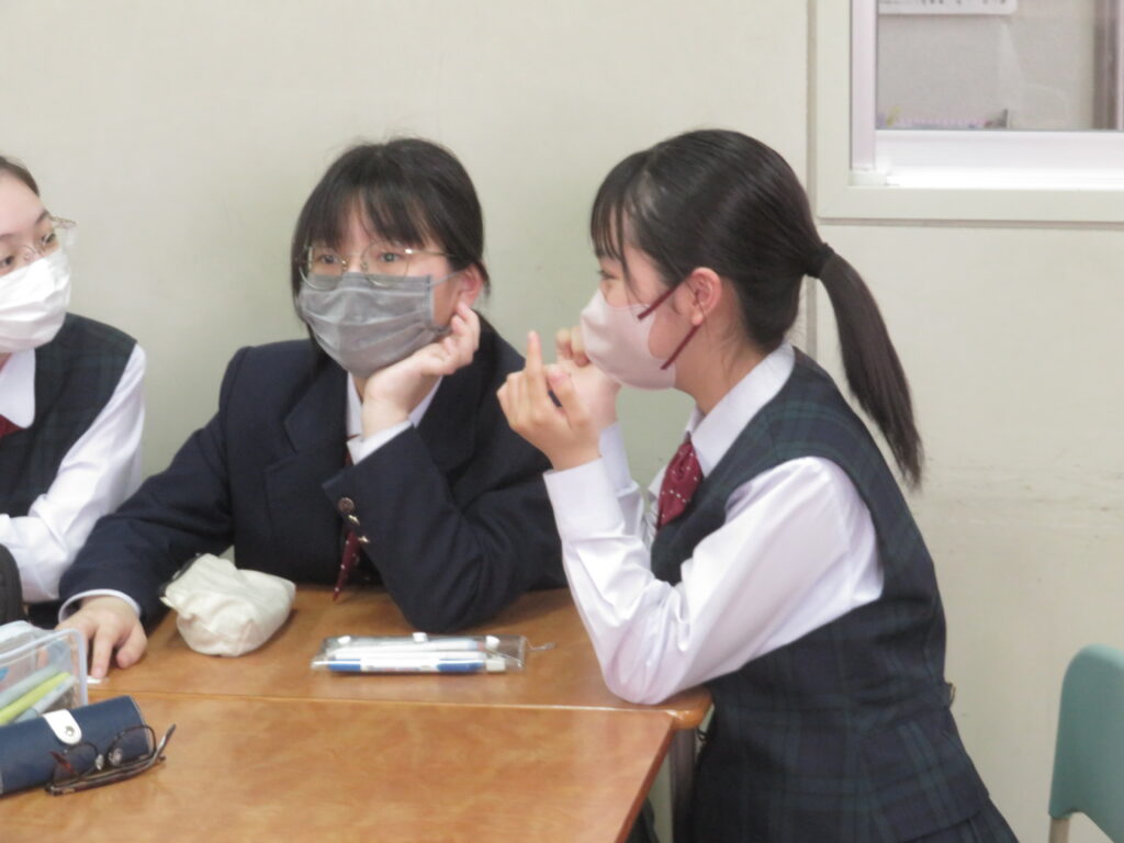 トンプソン先生から出されたお題となる英単語をその単語そのものを言わずに説明をします。解答者はその英単語が何なのか考えると言うゲームです。J1生も英語の学習が始まったばかりですが、先輩たちに教えてもらいながら必死に考え、説明をしようと頑張っています。