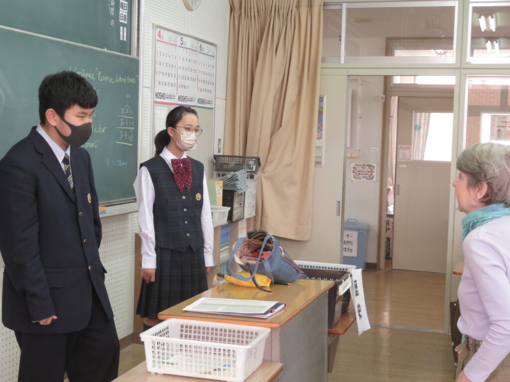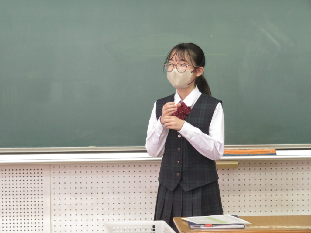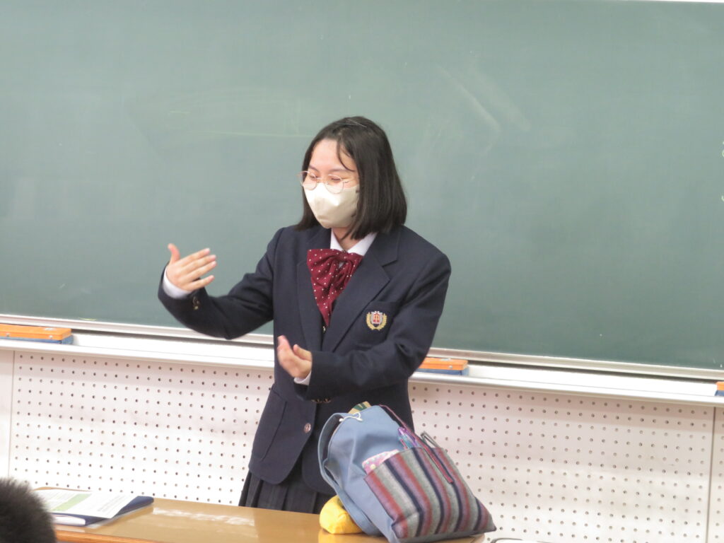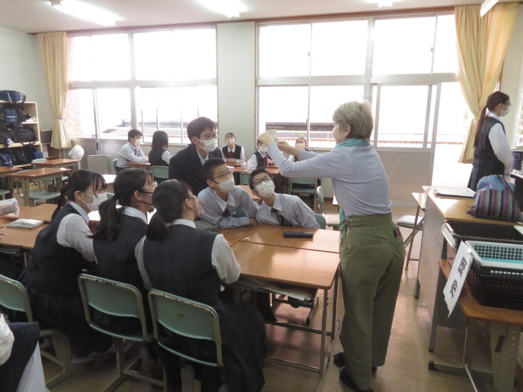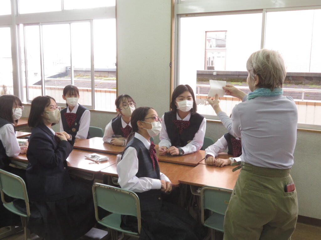 トンプソン先生から出されたお題となる英単語をその単語そのものを言わずに説明をします。解答者はその英単語が何なのか考えると言うゲームです。J1生も英語の学習が始まったばかりですが、先輩たちに教えてもらいながら必死に考え、説明をしようと頑張っています。