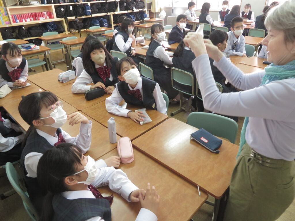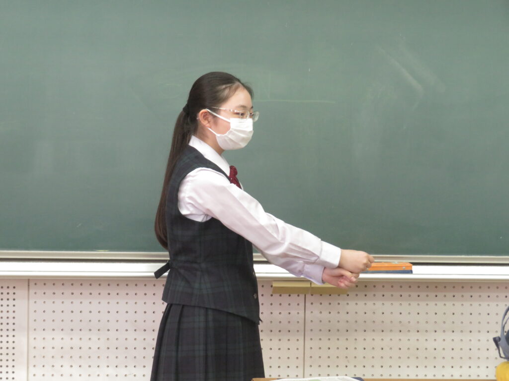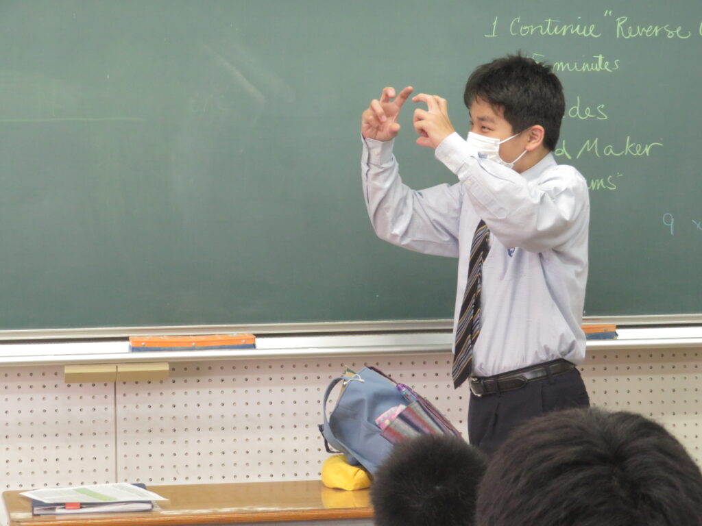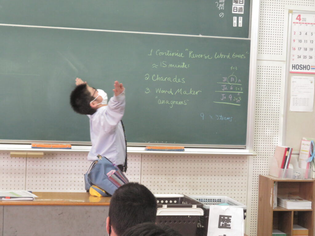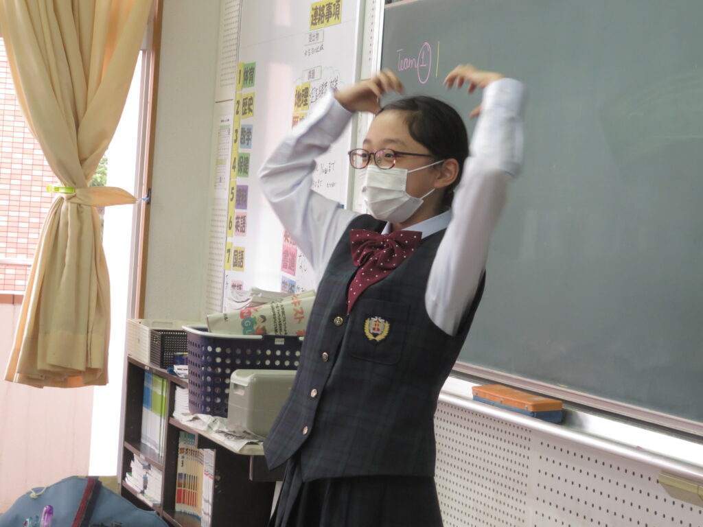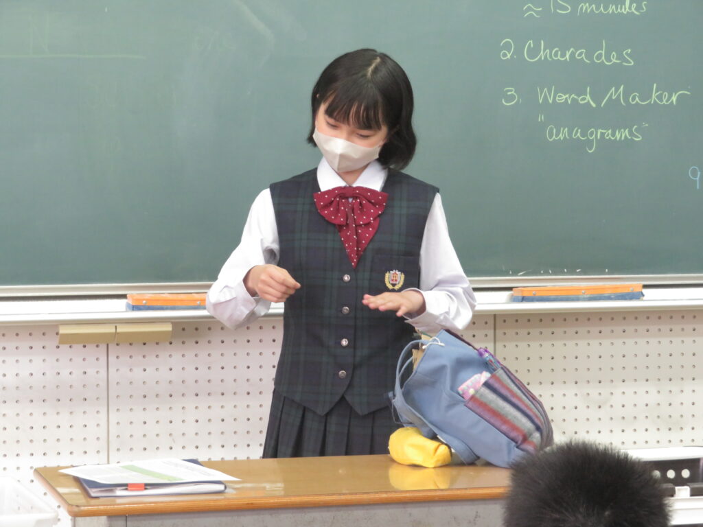お題となる英単語を声に出すことなく身振り手振りでお題を表現し、それが何かを答えるゲームです。簡単な英単語もいざジェスチャーで表現しようとすると難しかったようですが、特徴を捉え、上手に伝えることが出来ていました。