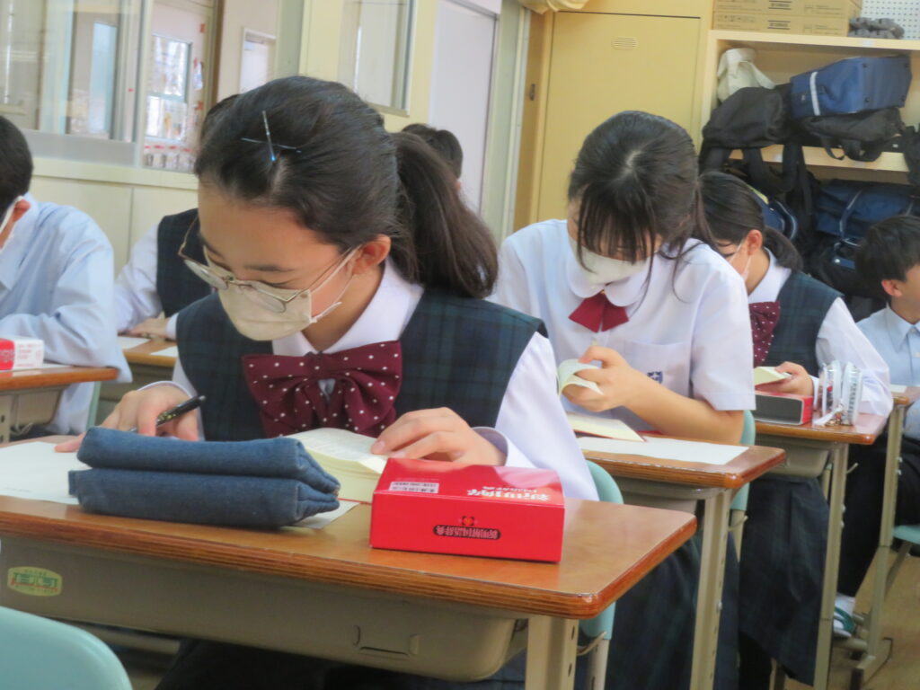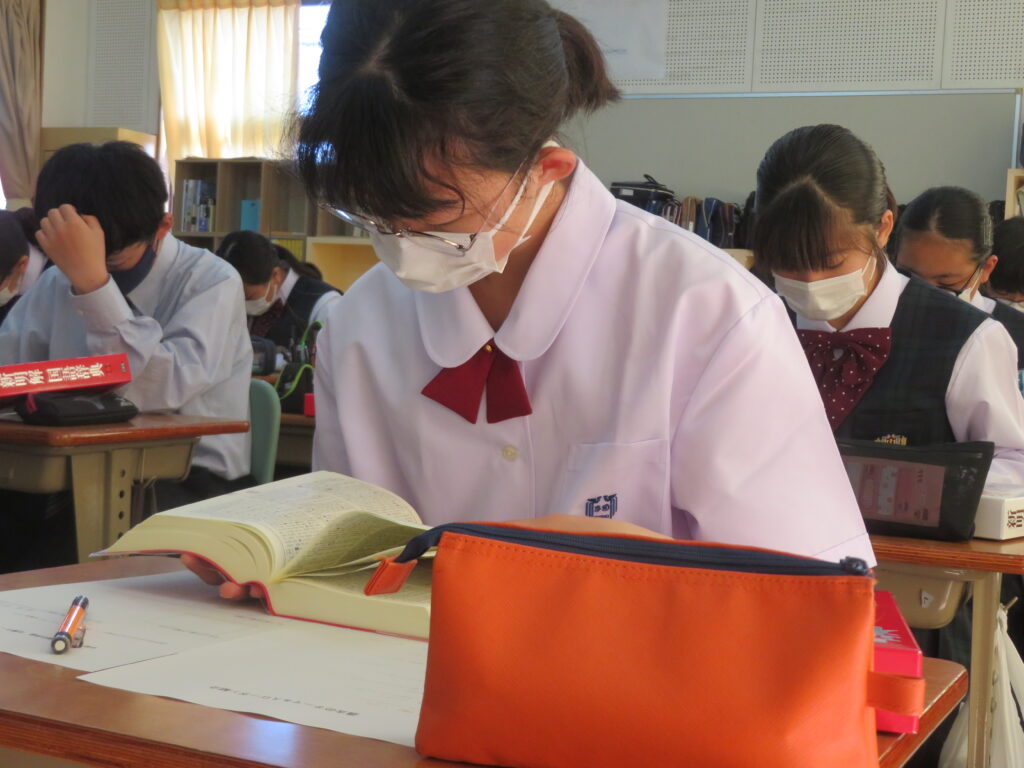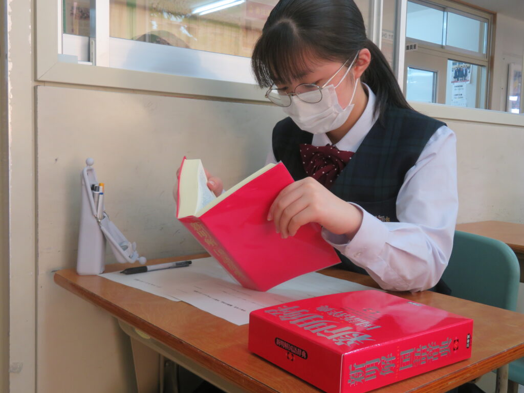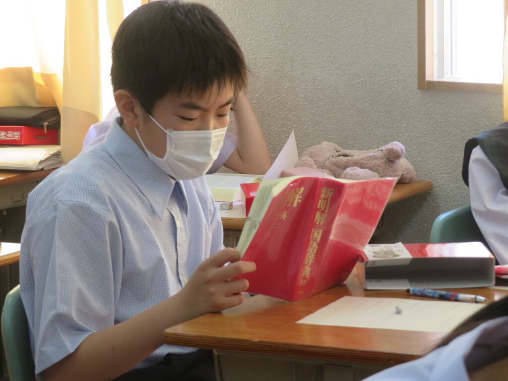 説明を聞いた後、国語辞典等を用いて漢字1字とスローガンを考えていました。