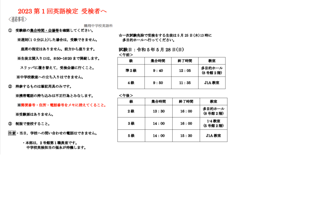 明日は第1回英語検定です。受検をする生徒は集合時間に遅れないよう、安全に登校してきてください!
