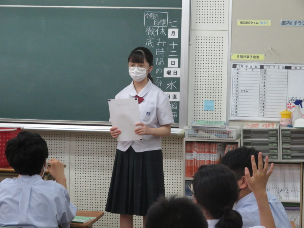 帰りの会の様子です。帰りの会では、明日の時間割や宿題、持って来るものの連絡等が各担当生徒からあります。また、先生から配付物や諸連絡があります。生徒たちは、忘れ物をしないように生活の記録に記入します。