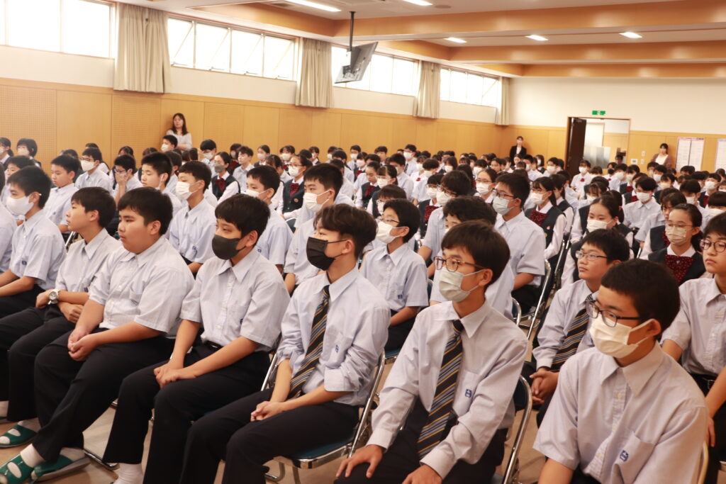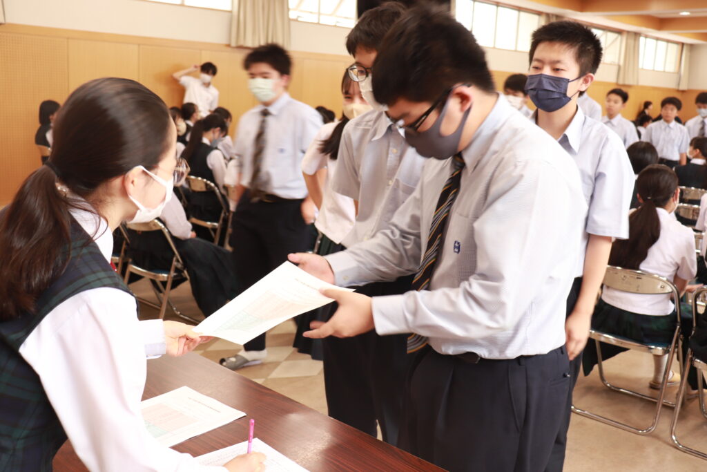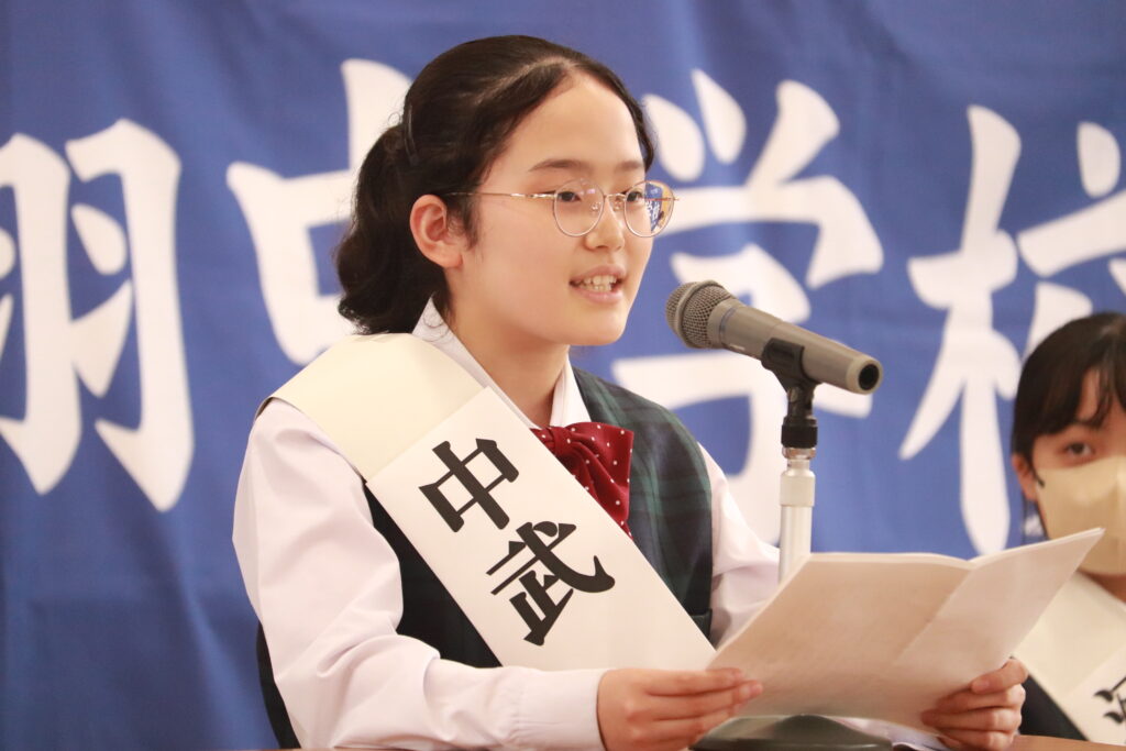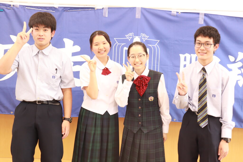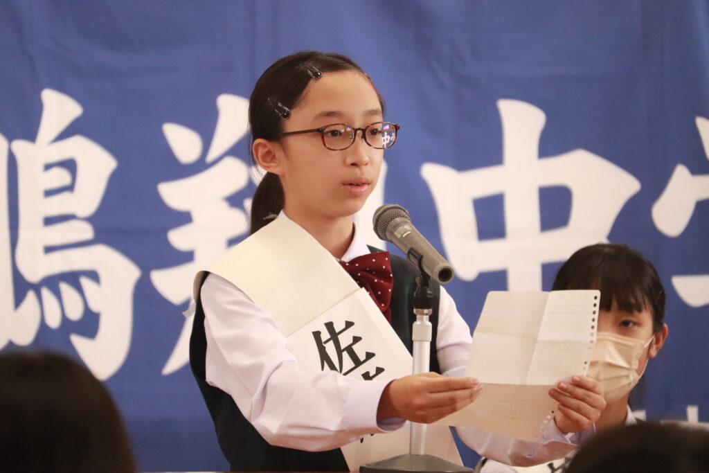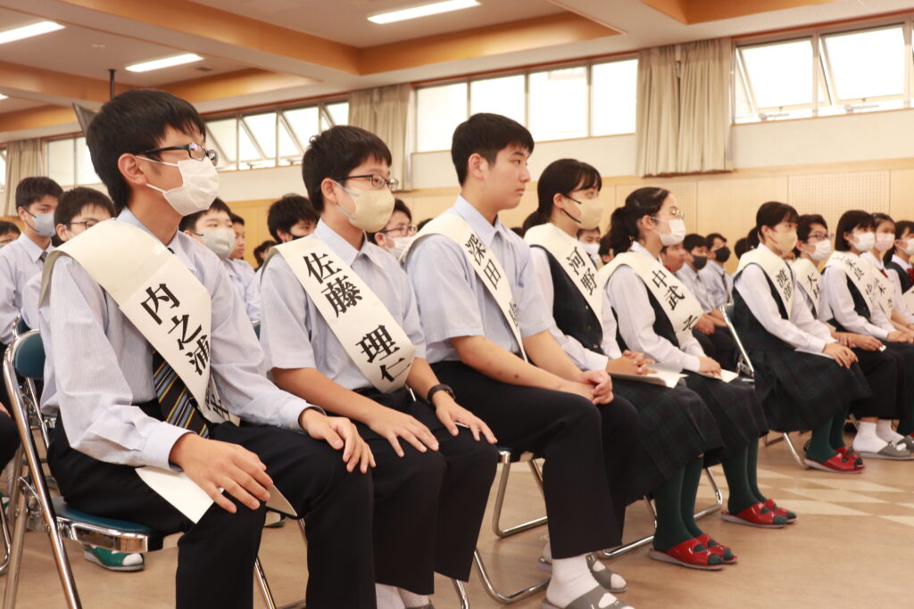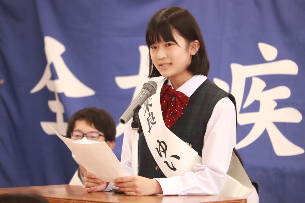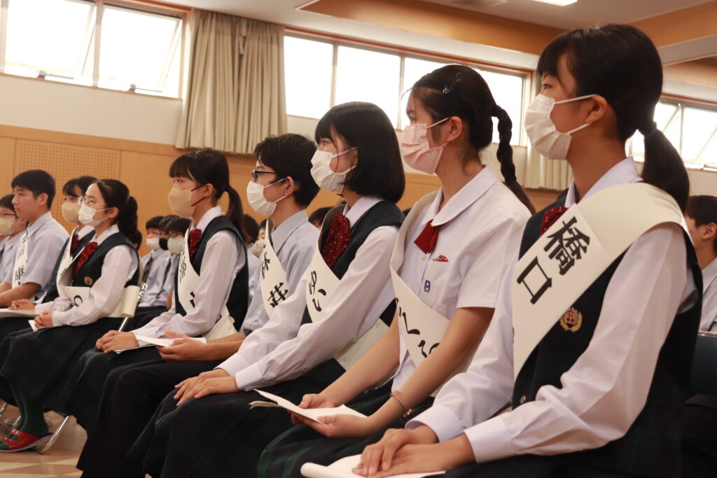 また、演説の中でたびたび登場してきた人物がいます。それは現生徒会の先輩方です。普段は後輩達とも友達のように楽しく過ごしている先輩達もいつの間にか憧れられる存在になっていたのですね。今回の選挙まで運営を行っていた現生徒会の3年生は、演説を聞きながら褒められている気がしたのか、誇らしげな表情に見えました。今までの先輩たちから受け継いだ鵬翔中学校生徒会の伝統あるバトンを土曜日の新旧交代式で後輩たちに託してくれると思います。