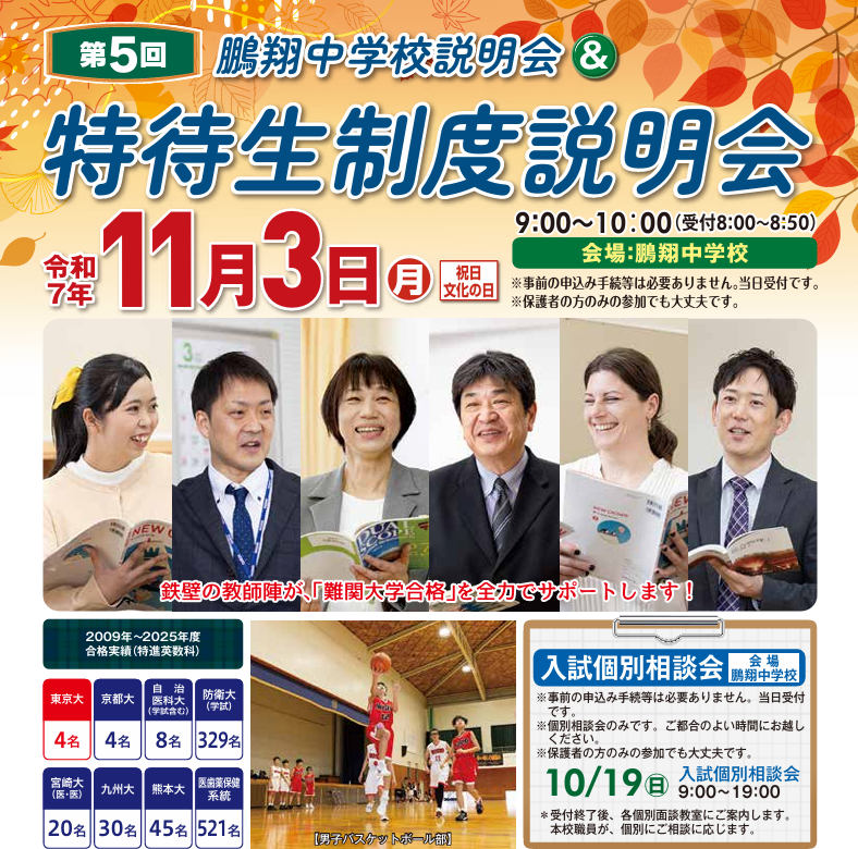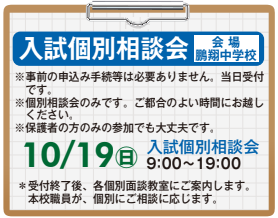 それに伴い、10月19日(日)に鵬翔中学校にて、「個別相談会」も実施いたします。