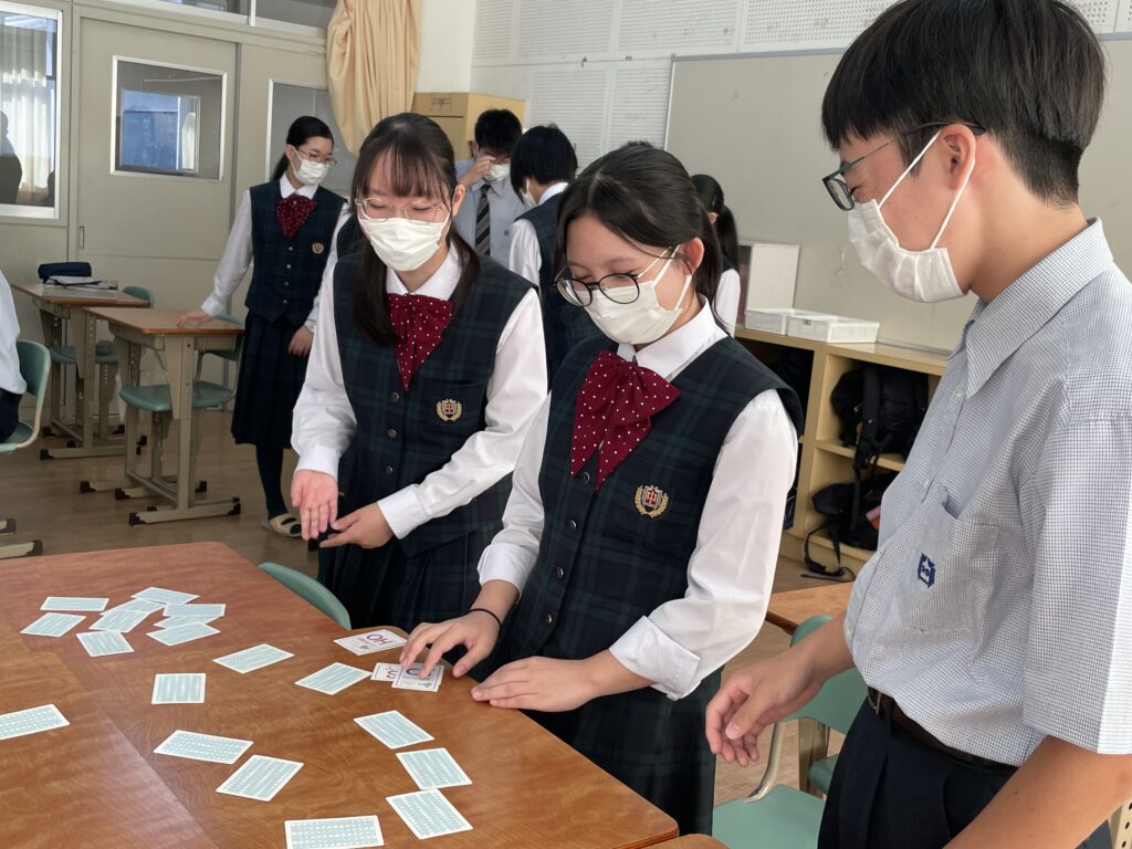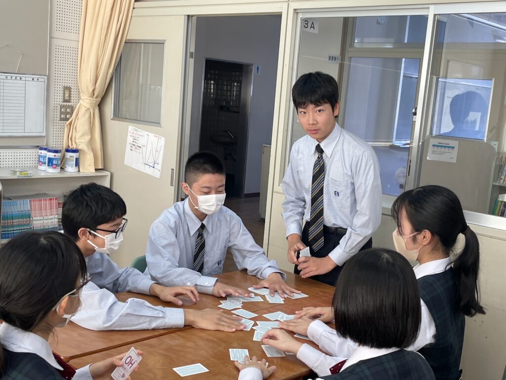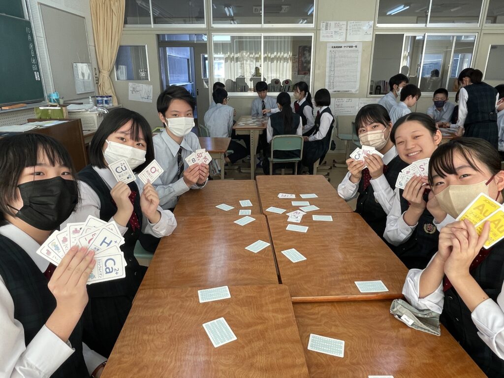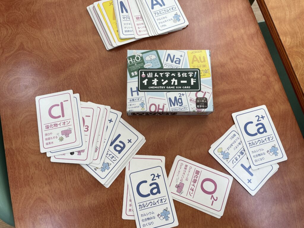 化学基礎の授業では、イオンカードを使って、イオン式・組成式の学習をしました。イオン式が書いてあるカードを神経衰弱の要領でめくっていき、組成式が完成したら、自分の取り分になります。イオン式を覚えており、なおかつ、カードの場所も覚えておかないといけません。何組、ゲットすることができたでしょうか!