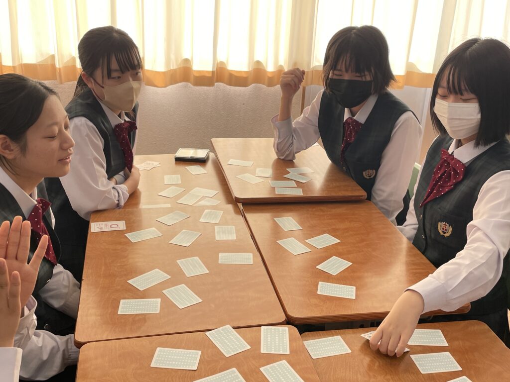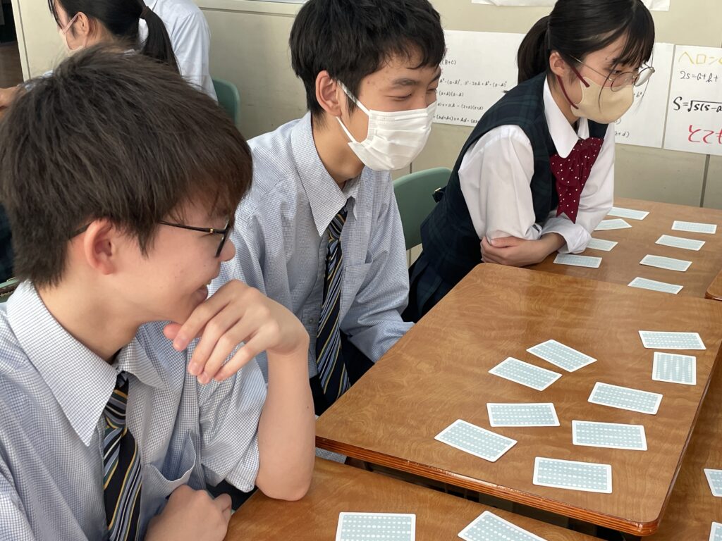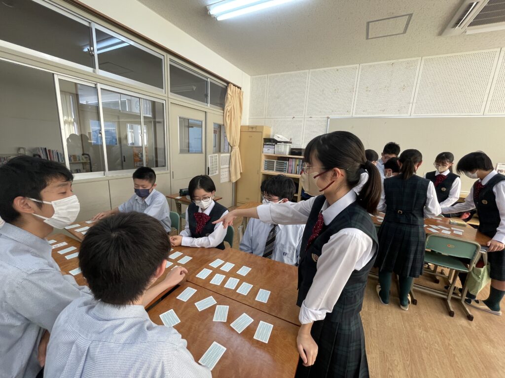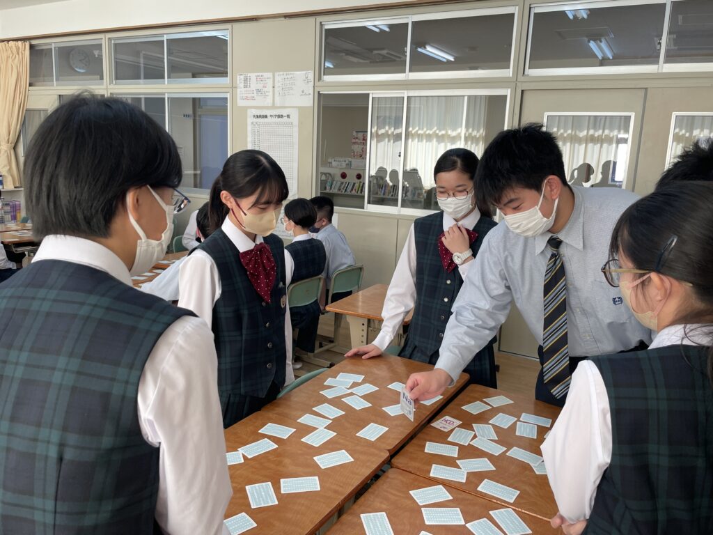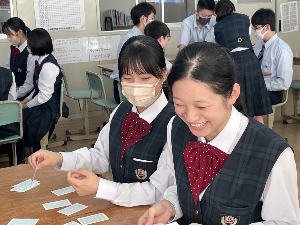 化学基礎の授業では、イオンカードを使って、イオン式・組成式の学習をしました。イオン式が書いてあるカードを神経衰弱の要領でめくっていき、組成式が完成したら、自分の取り分になります。イオン式を覚えており、なおかつ、カードの場所も覚えておかないといけません。何組、ゲットすることができたでしょうか!