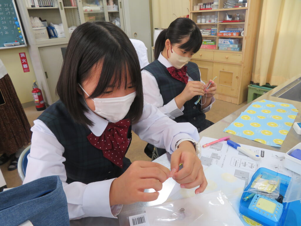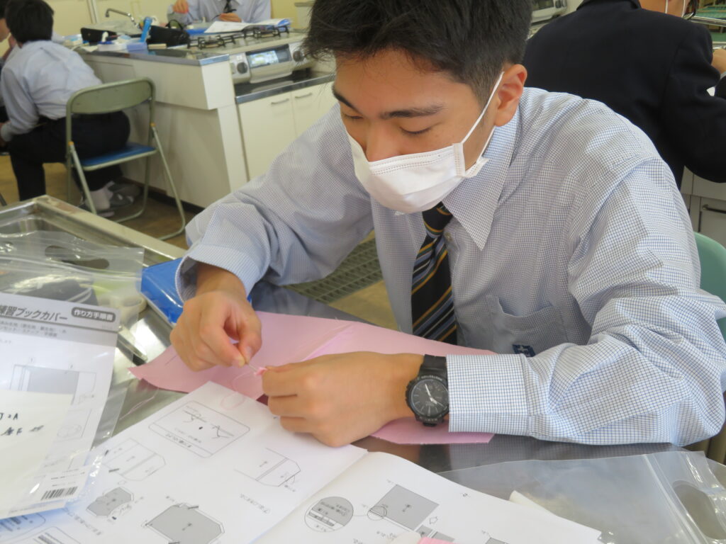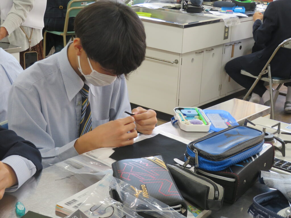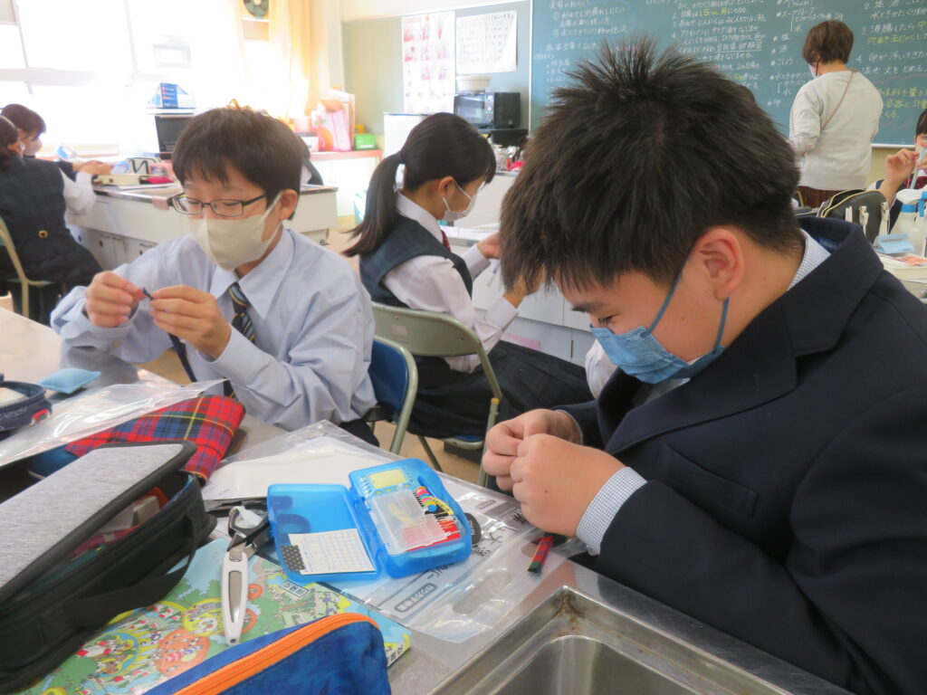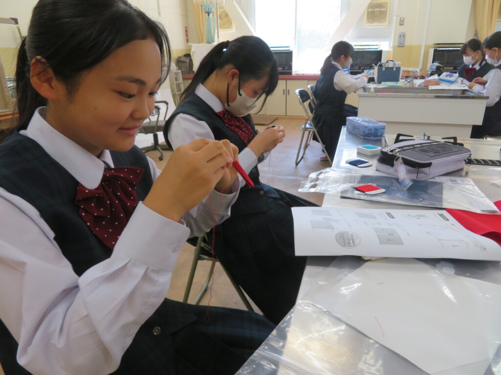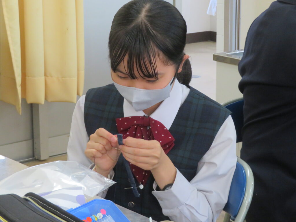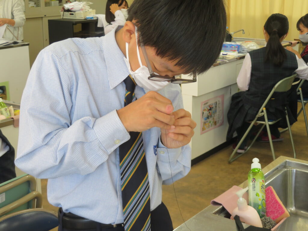 J2-Aは、家庭科の授業で裁縫をしていました。生徒の中には糸通しや珠止めに苦戦している様子、スイスイと波縫いをしている姿が垣間見れました。ブレザーやシャツのボタンが外れた際、保護者の方にお願いするのではなく、自分で挑戦してみるのもいいですね!