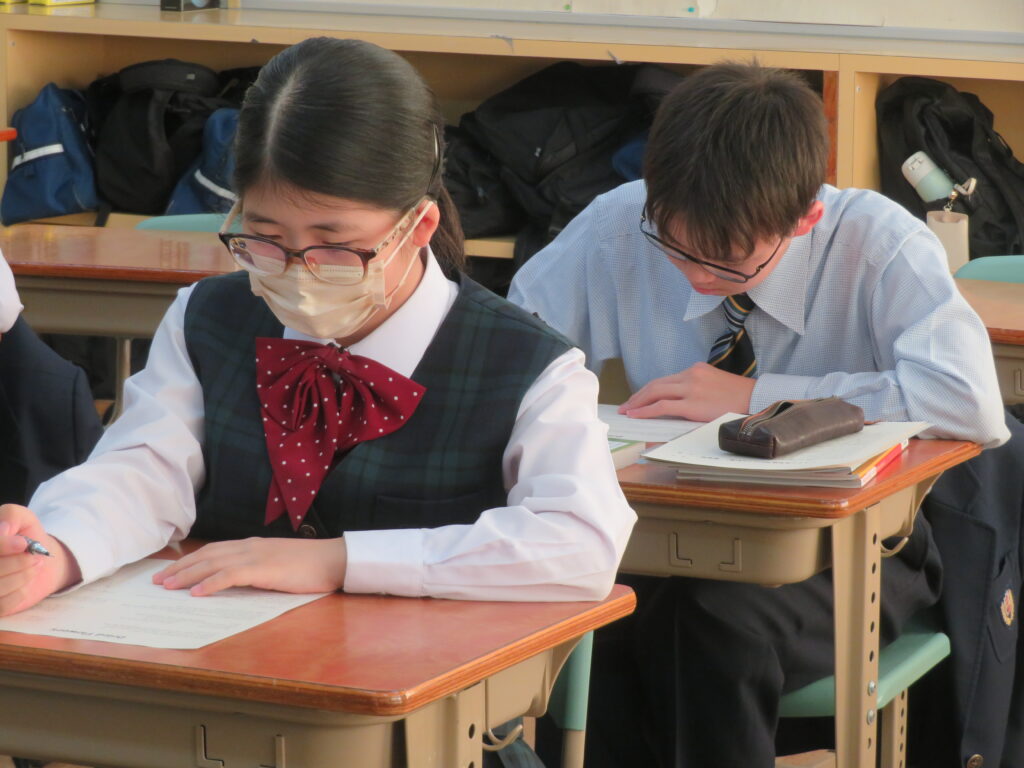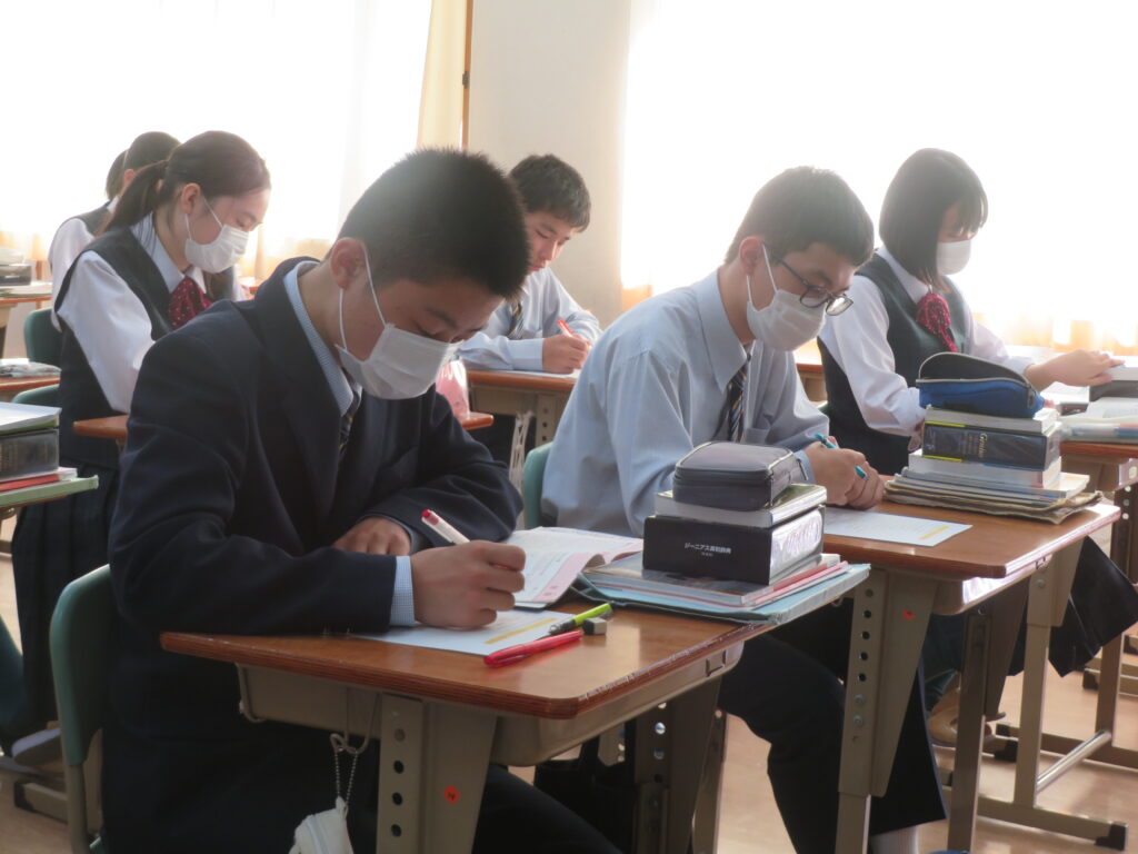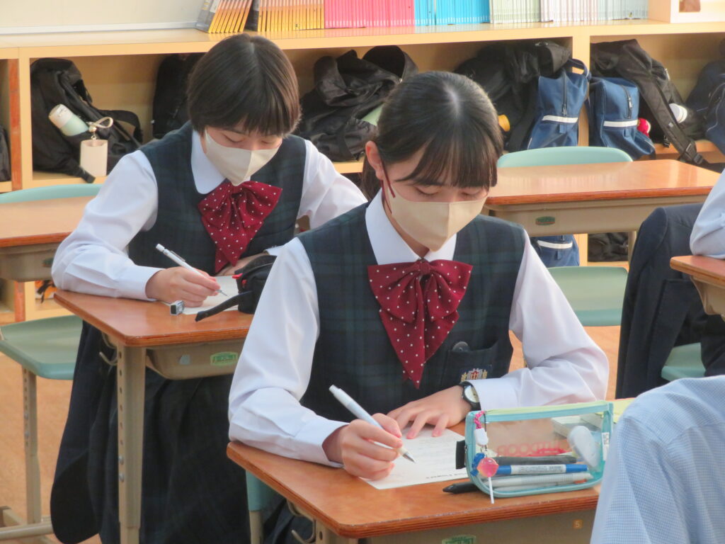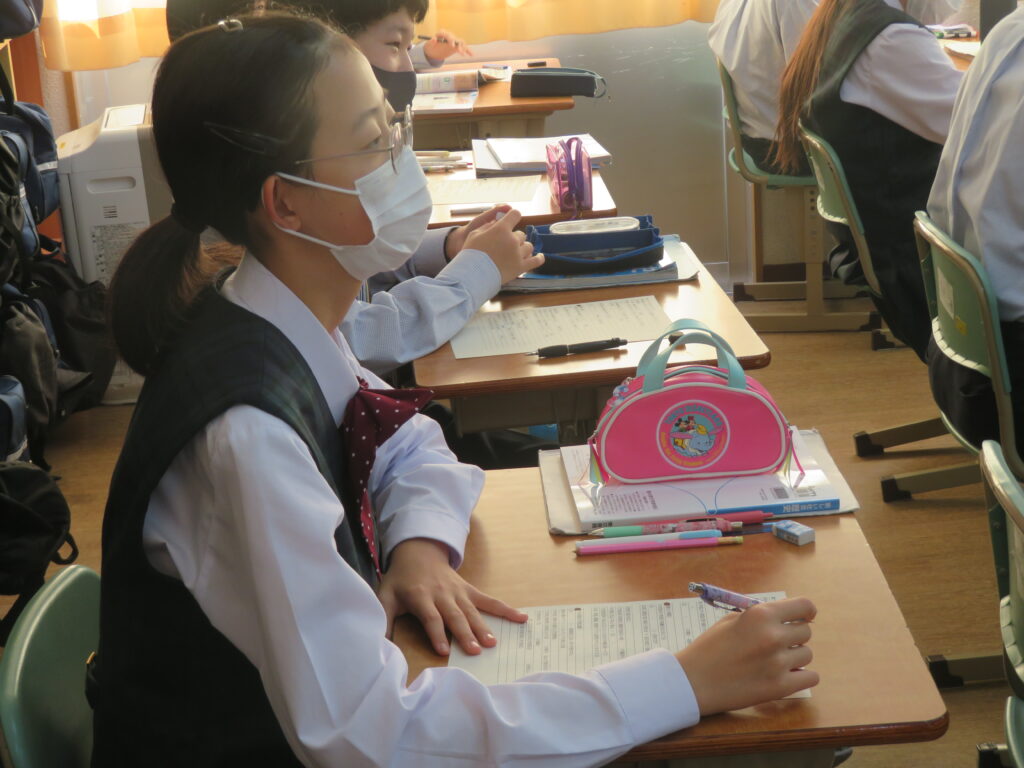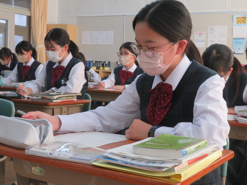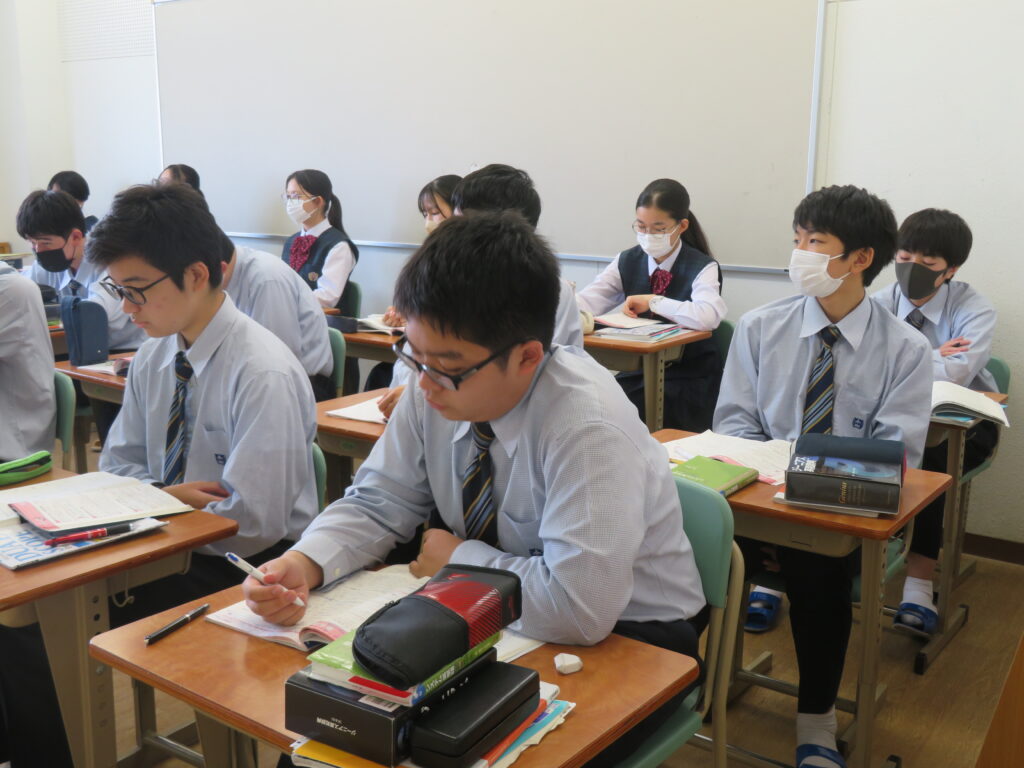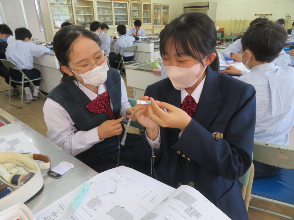 J2-Aは、家庭科の授業で裁縫をしていました。生徒の中には糸通しや珠止めに苦戦している様子、スイスイと波縫いをしている姿が垣間見れました。ブレザーやシャツのボタンが外れた際、保護者の方にお願いするのではなく、自分で挑戦してみるのもいいですね!