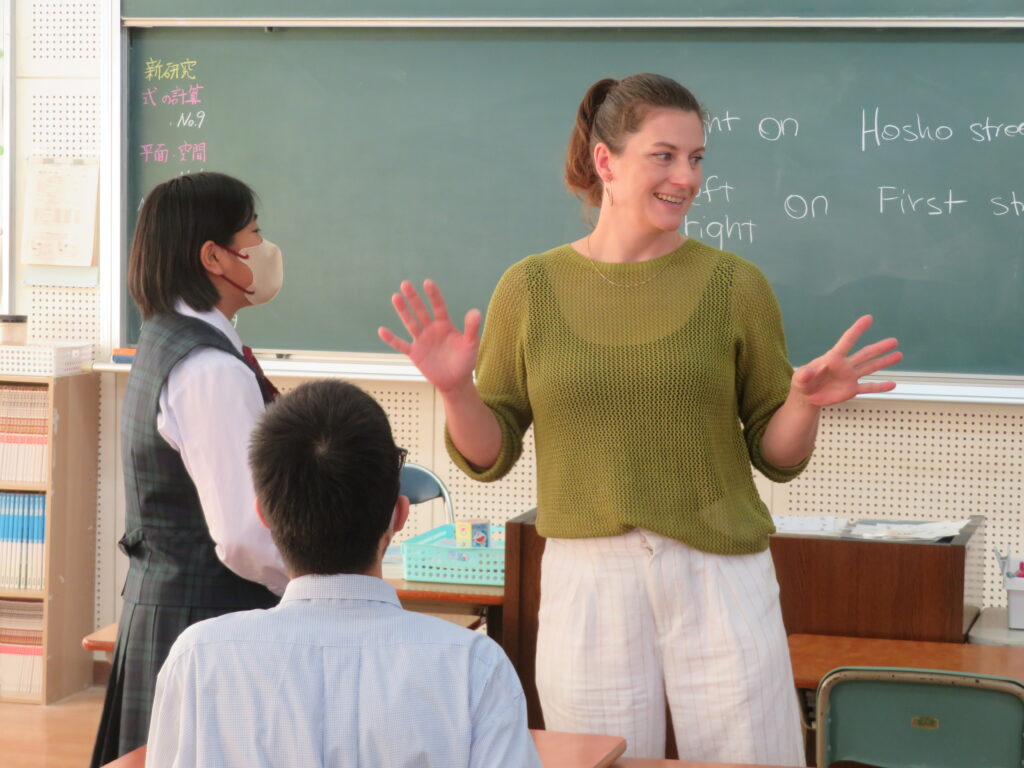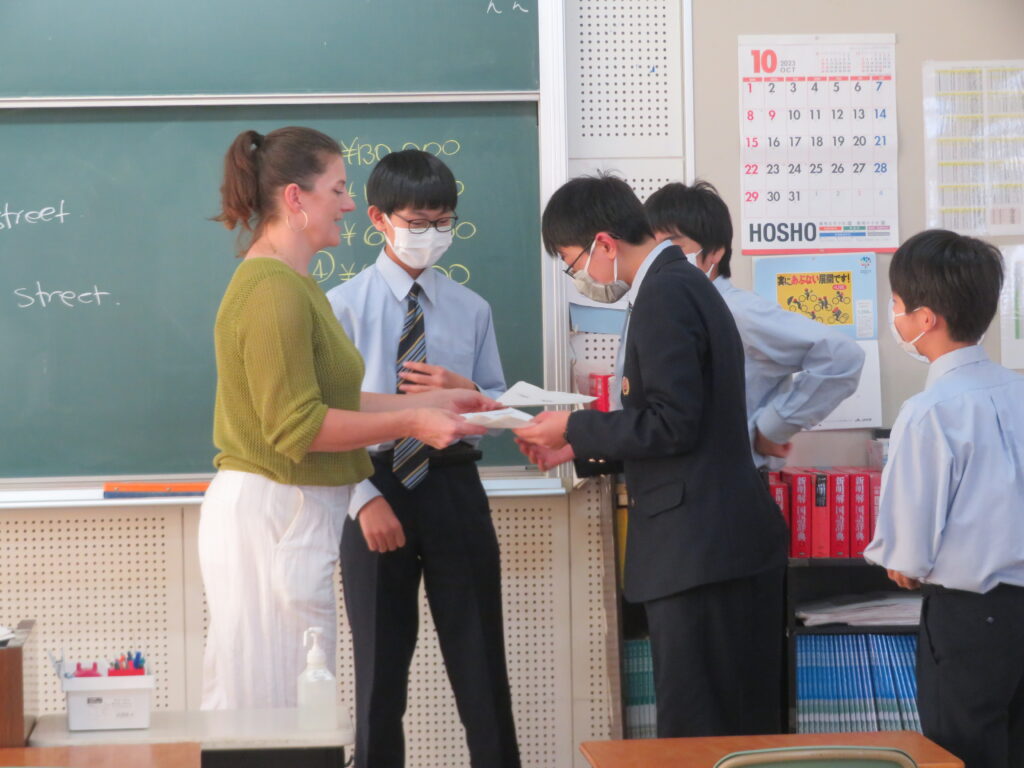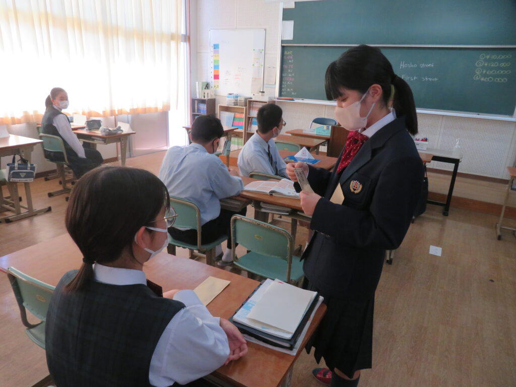 本日2限目、J2-Bは英会話の授業です。教室内を宮崎市内の街と想定し、英語で道案内をし、お店まで行きます。たどり着いたお店では、お店の人とじゃんけんをして、お金が貰えます。もらったお金が多いチームが勝ちです。ゲームをしながら、ジェニファー先生と楽しく英会話の授業が行われていました。