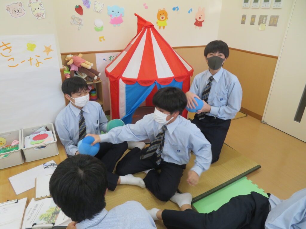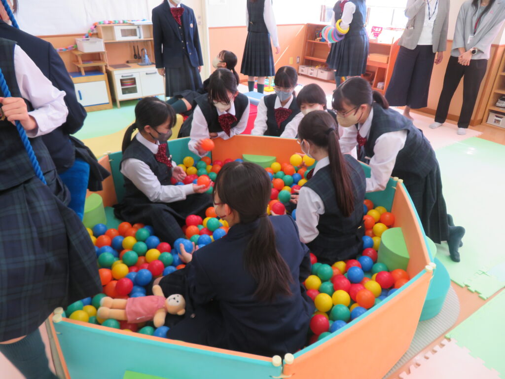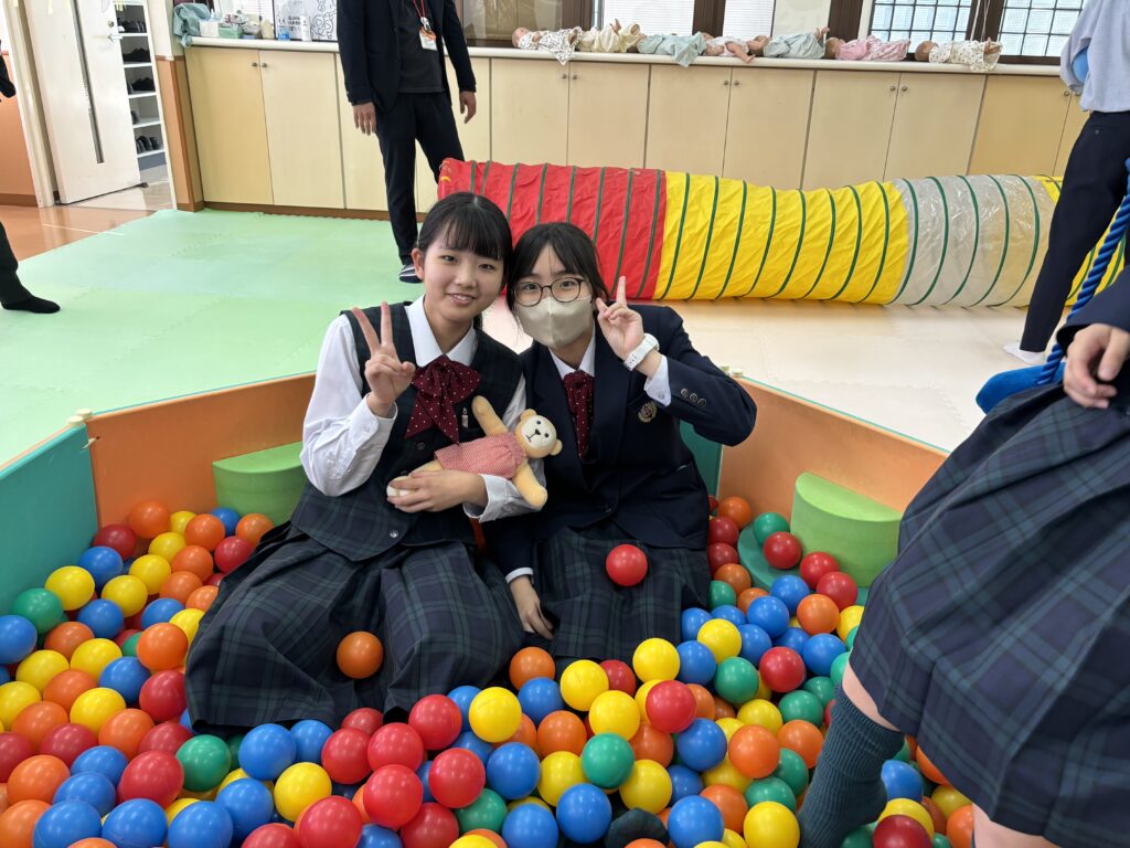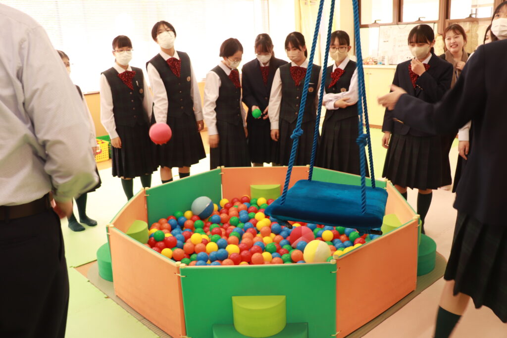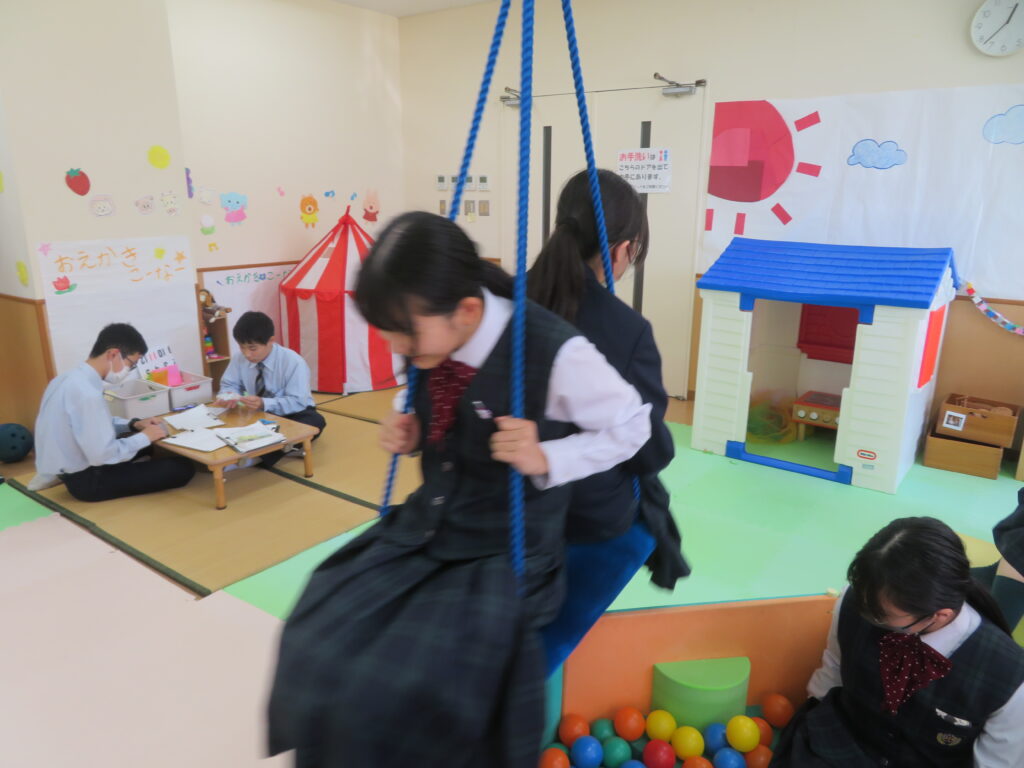 その後、キャンパス内の散策を行いました。小児保健実習室で実際に遊具で遊んだり、模型室で大学生が作成した作品を見たりと、自分たちで直接見て触れる良い時間になりました。