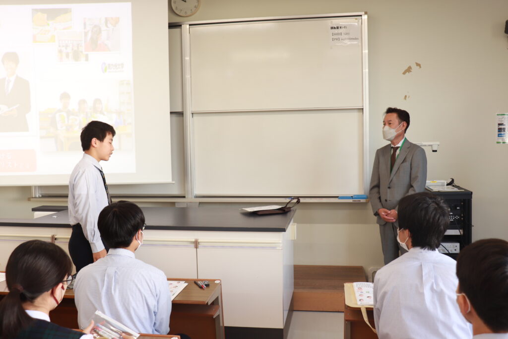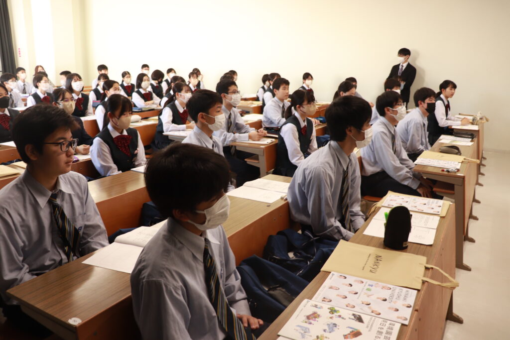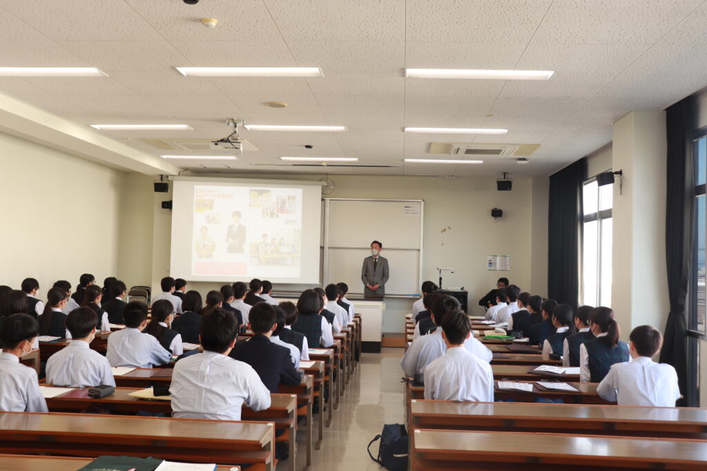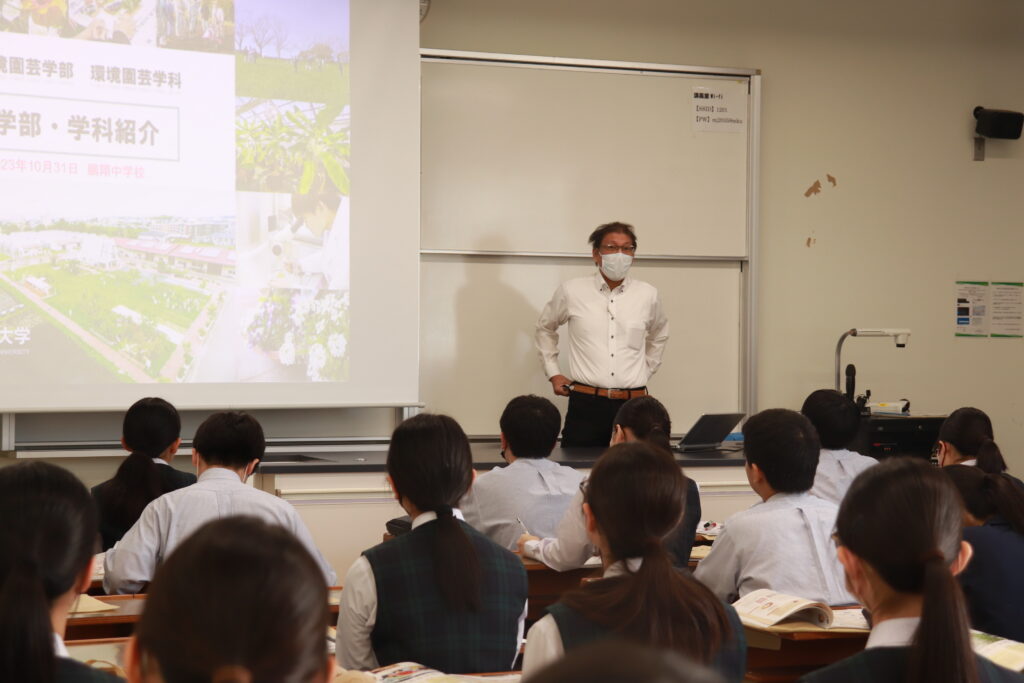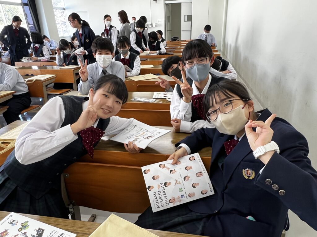 本日は、昨日のJ3校外学習の様子をお届けします。まず、南九州大学(都城キャンパス)に向かいました。子ども教育学科や環境園芸学科の紹介があり、生徒たちは耳を傾けていました。大学の先生方からお話しを頂き、将来の選択を広げる良い機会になったのではないかと思います。