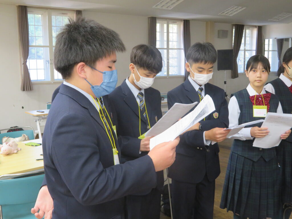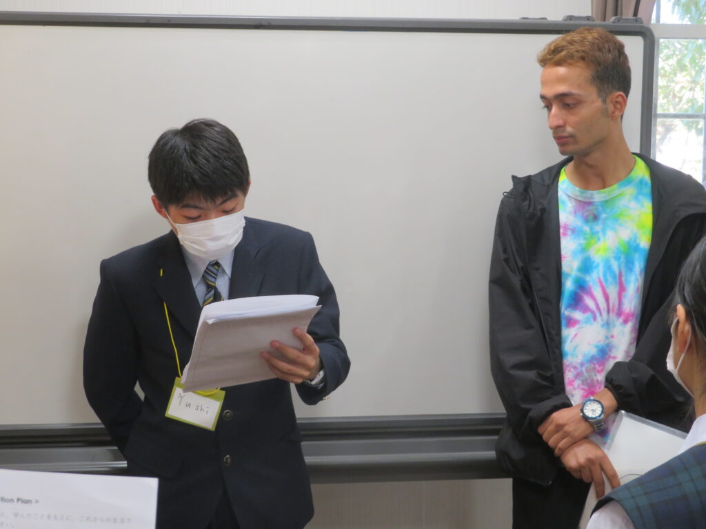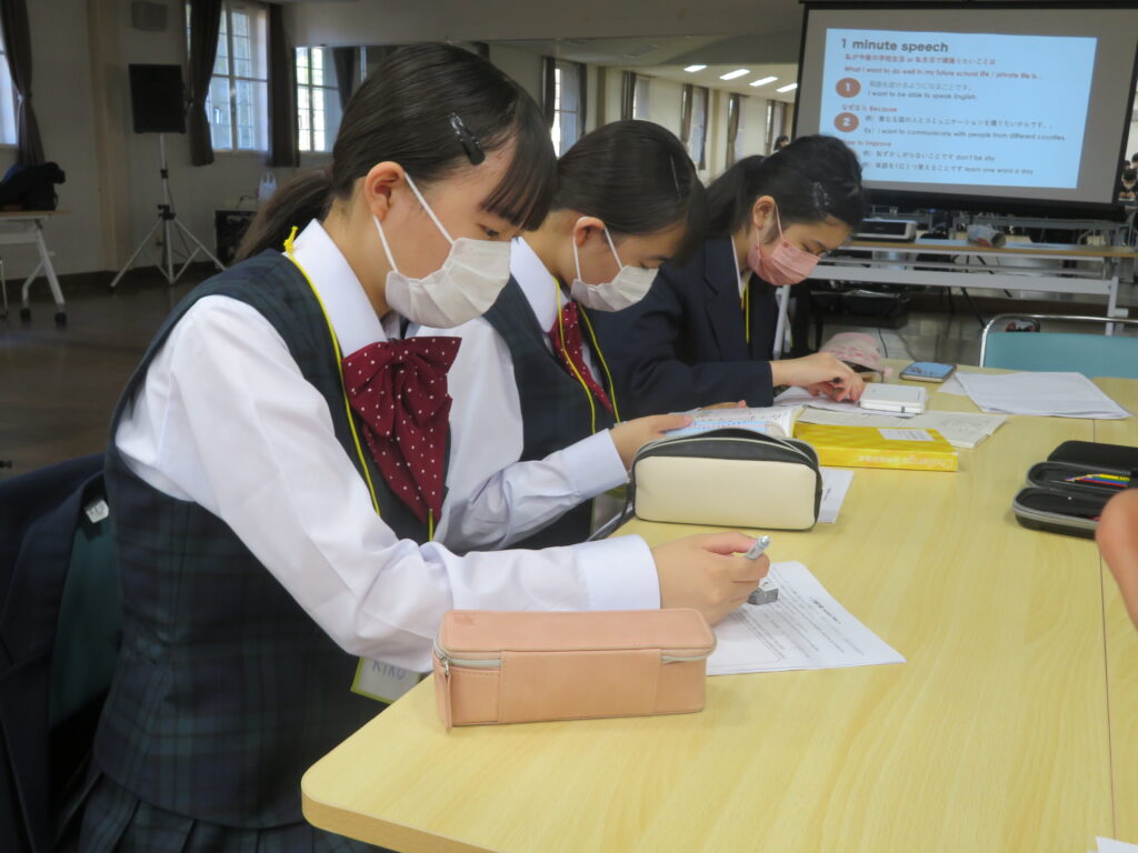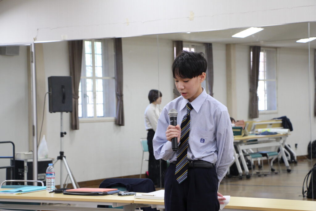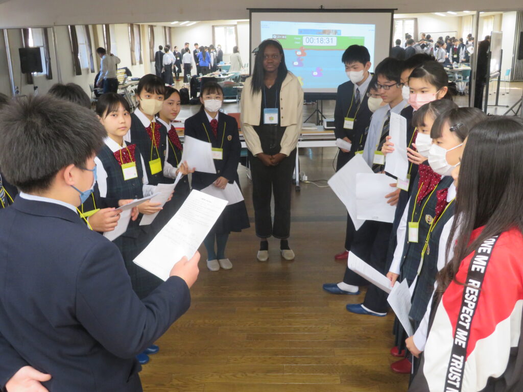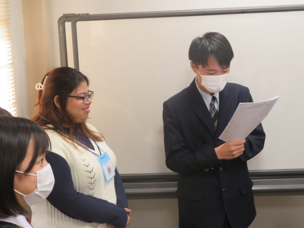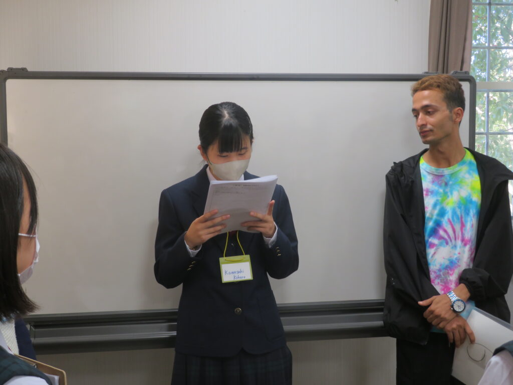 発表の様子です。緊張した様子でしたが、リーダーと一緒に考え昨日から英語に触れ続けている生徒たちは、一生懸命に自分の想いをスピーチしていました。