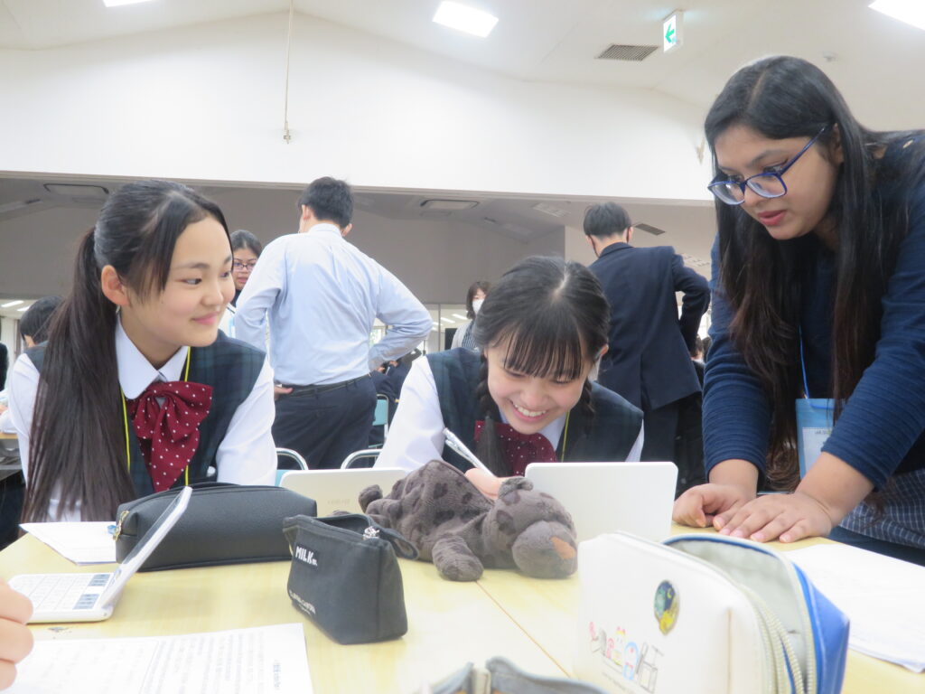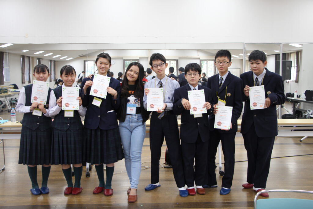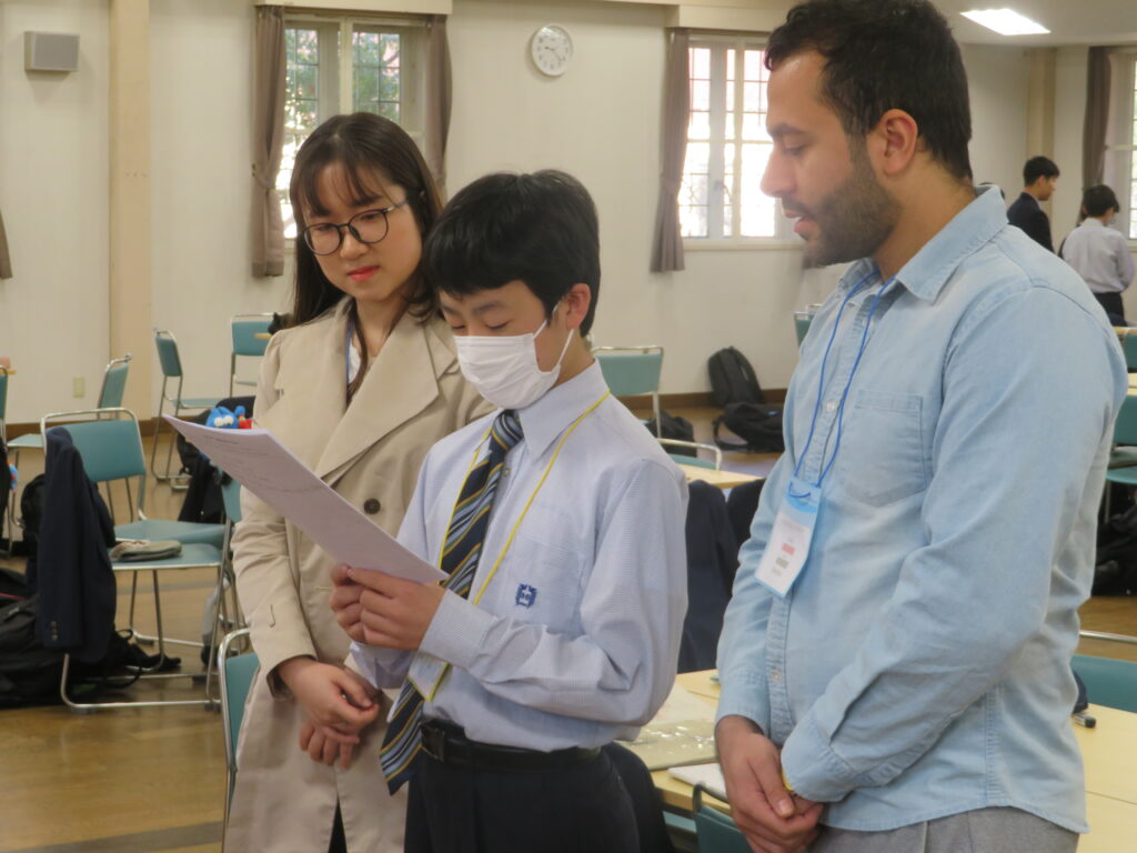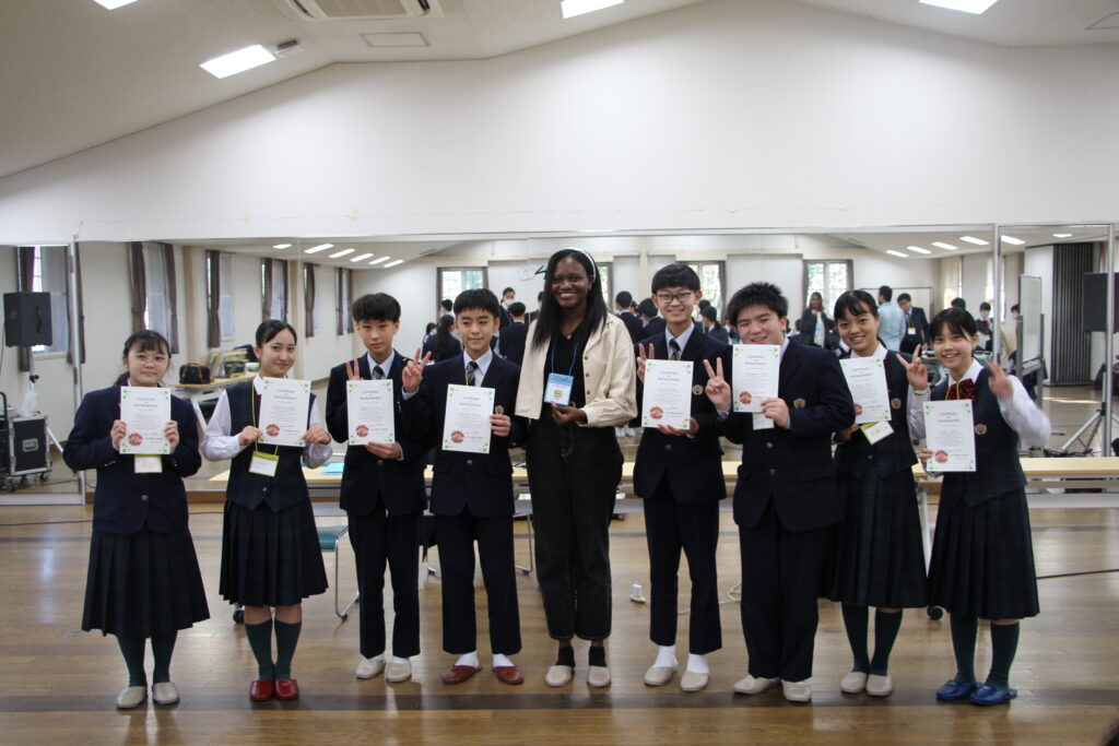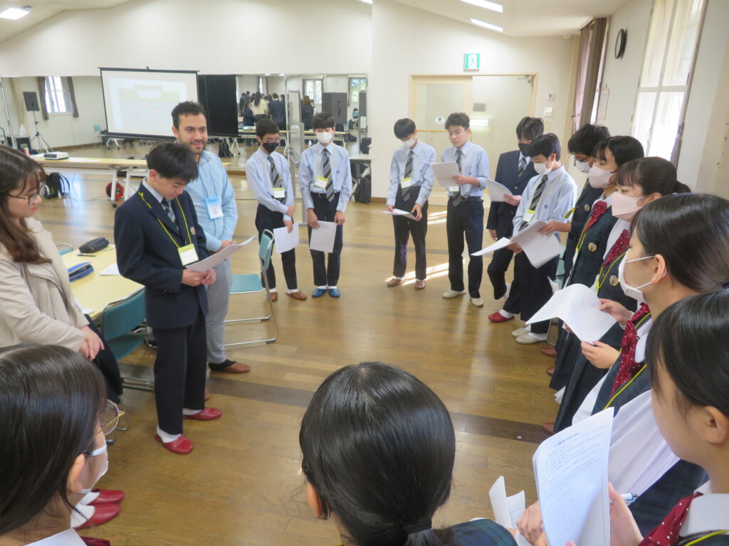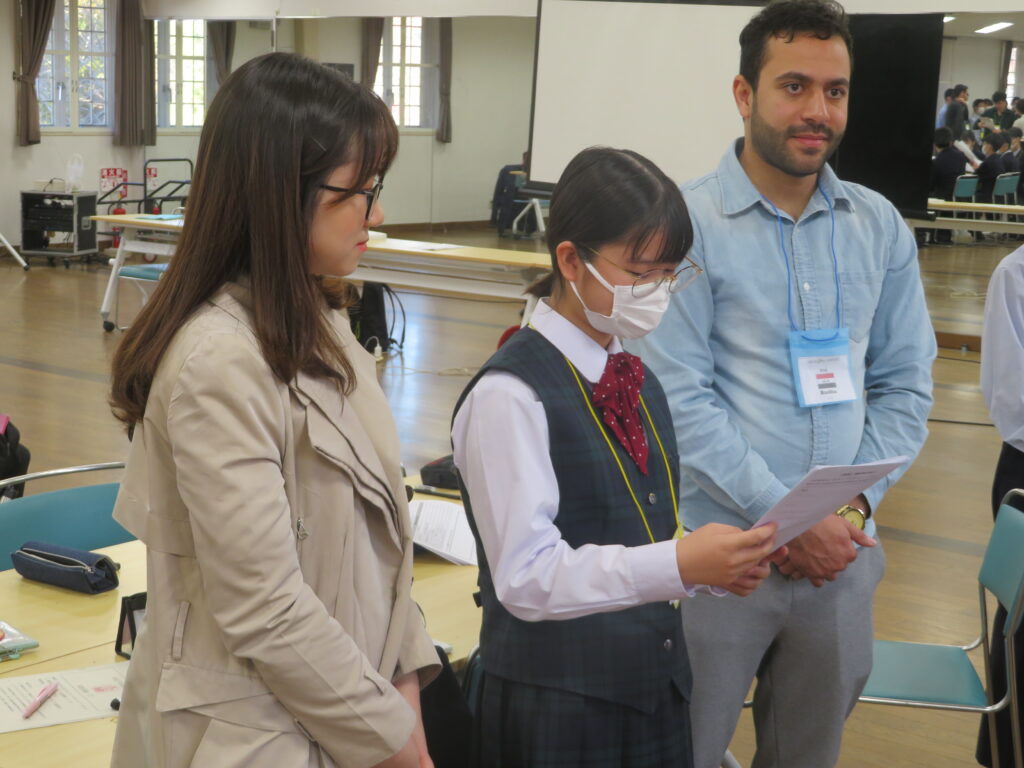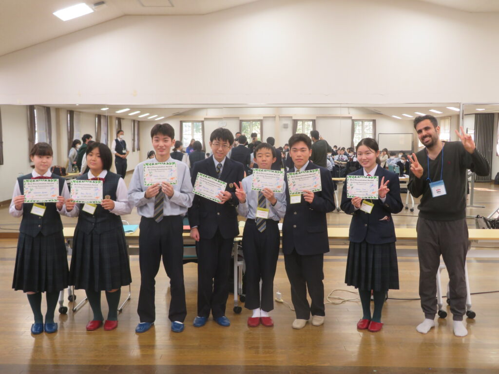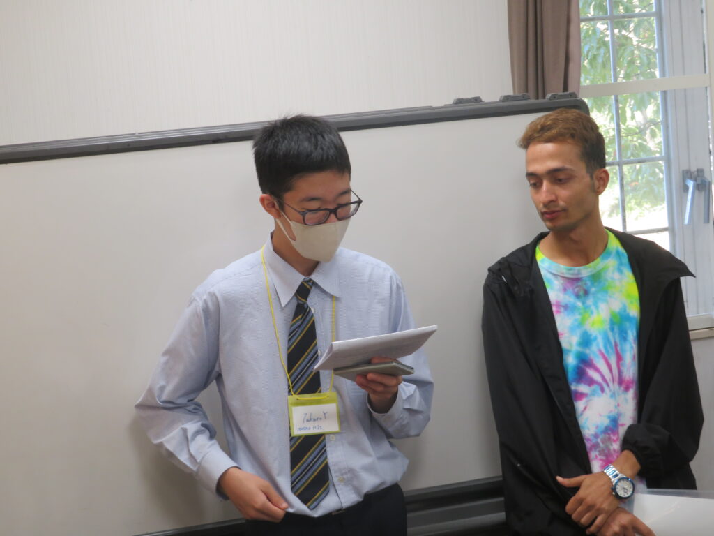 発表の様子です。緊張した様子でしたが、リーダーと一緒に考え昨日から英語に触れ続けている生徒たちは、一生懸命に自分の想いをスピーチしていました。