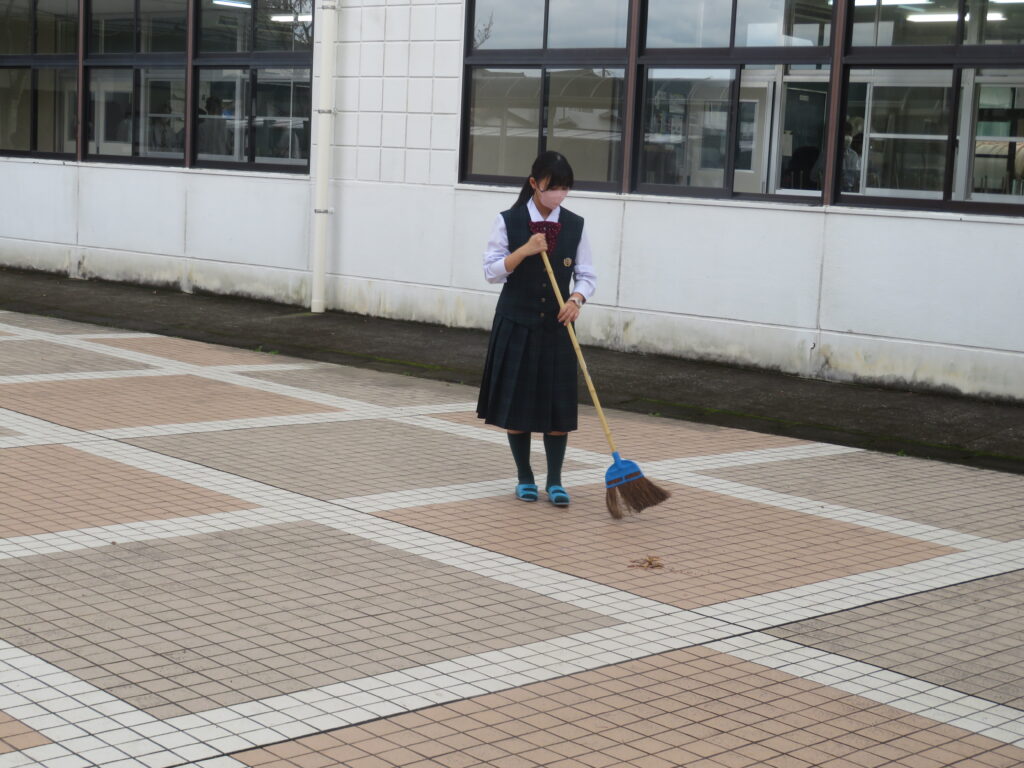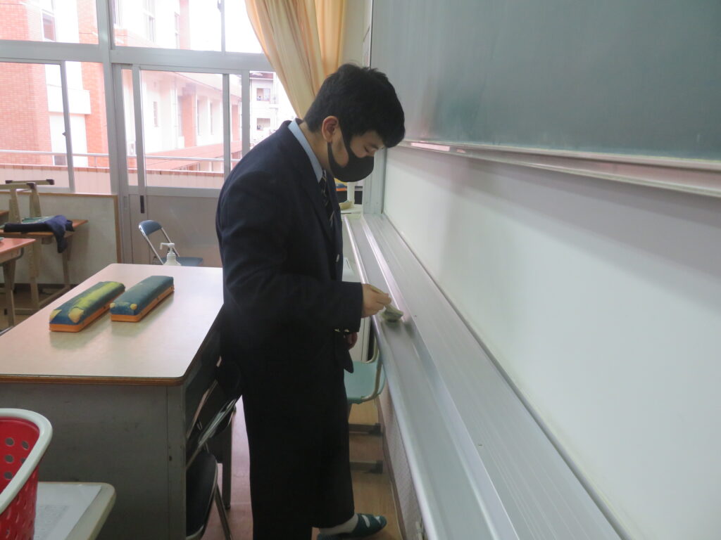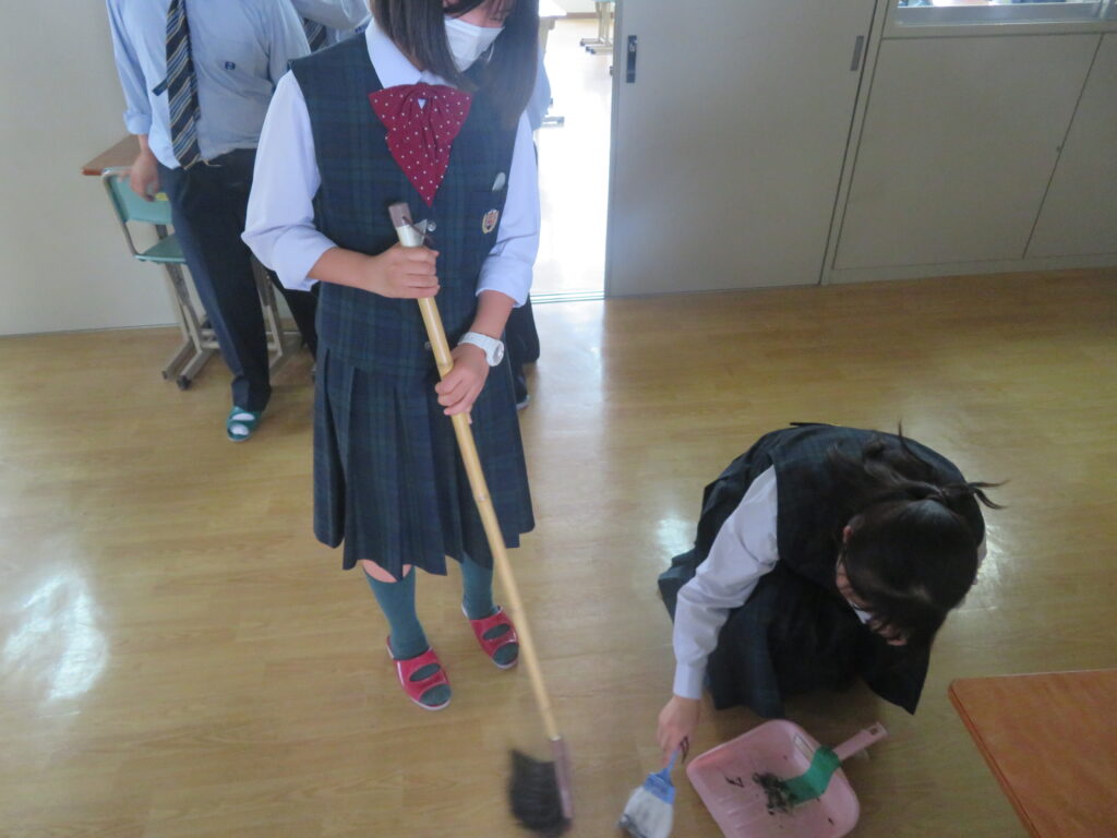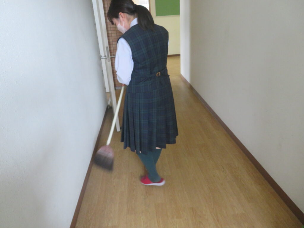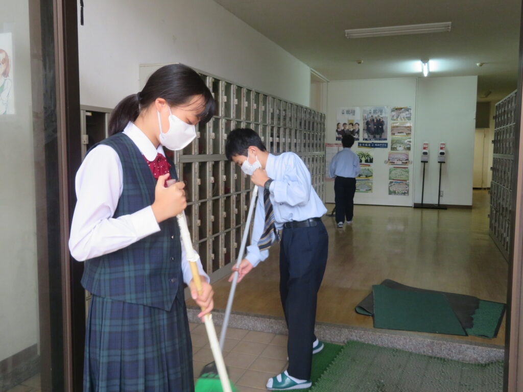 今日は、清掃のようすをお届けします。中学生の清掃区域は、中学棟の1号館を中心に8号館の多目的ホールや中庭となっています。来客のある事務室や応接室、会議室も中学生が担当します。教室以外の清掃場所は、学年をまぜて組んでありますので、先輩後輩で協力し合って清掃に取り組んでいます。