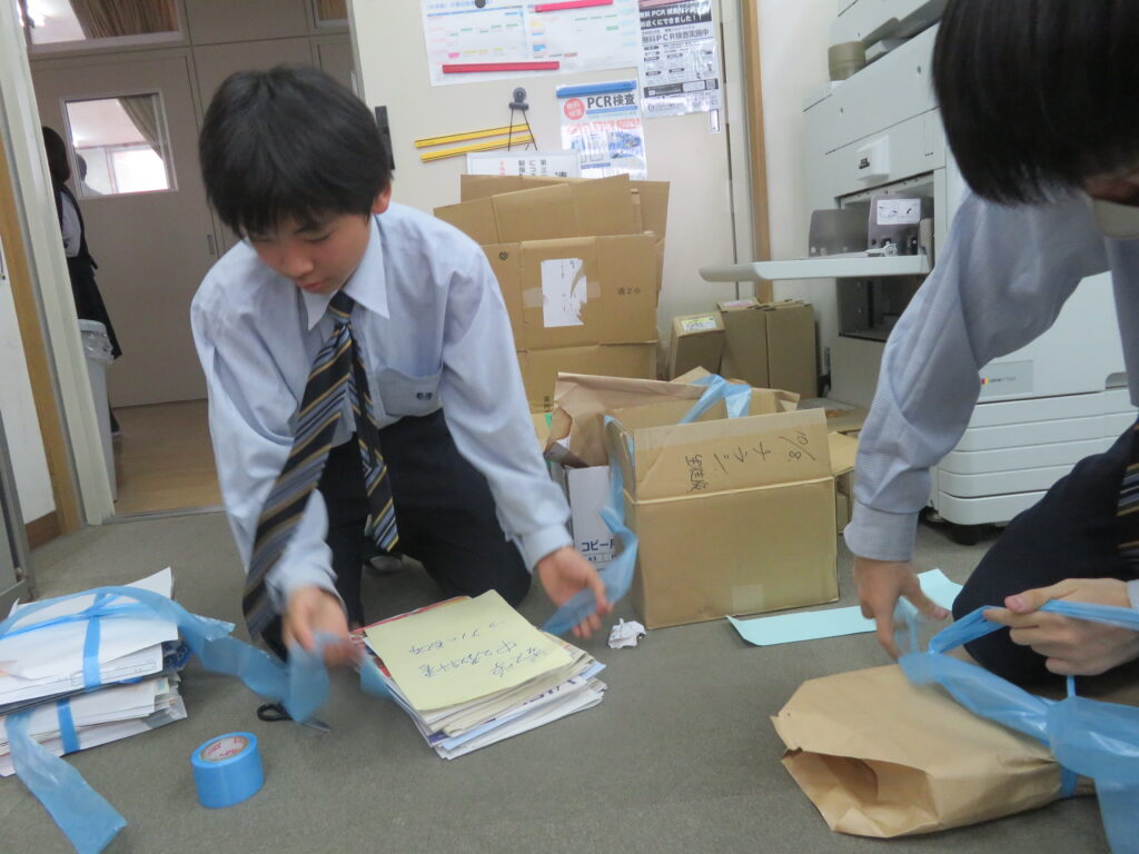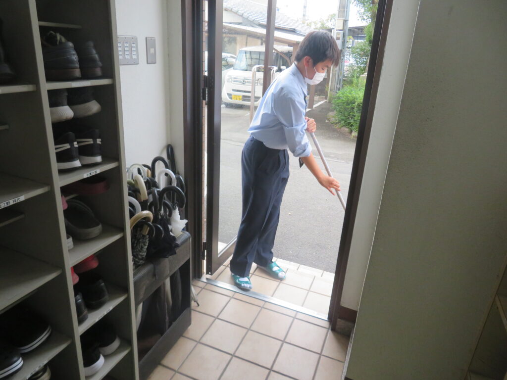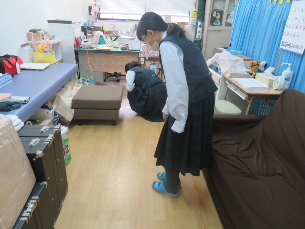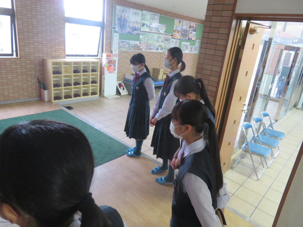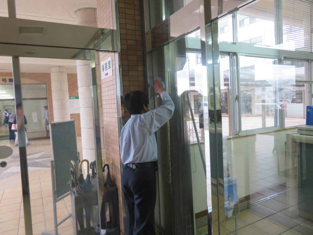 今日は、清掃のようすをお届けします。中学生の清掃区域は、中学棟の1号館を中心に8号館の多目的ホールや中庭となっています。来客のある事務室や応接室、会議室も中学生が担当します。教室以外の清掃場所は、学年をまぜて組んでありますので、先輩後輩で協力し合って清掃に取り組んでいます。