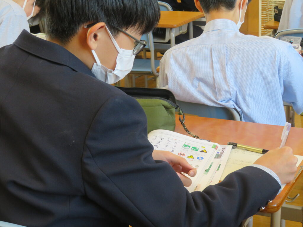 前半では、ピクトグラムについて学習しました。私たちの生活の中にも様々なピクトグラムを見ることができます。毎日過ごす教室や美術室などのピクトグラムを考える時間もあり、友だちや先生と話しながら作成する様子が見られました。