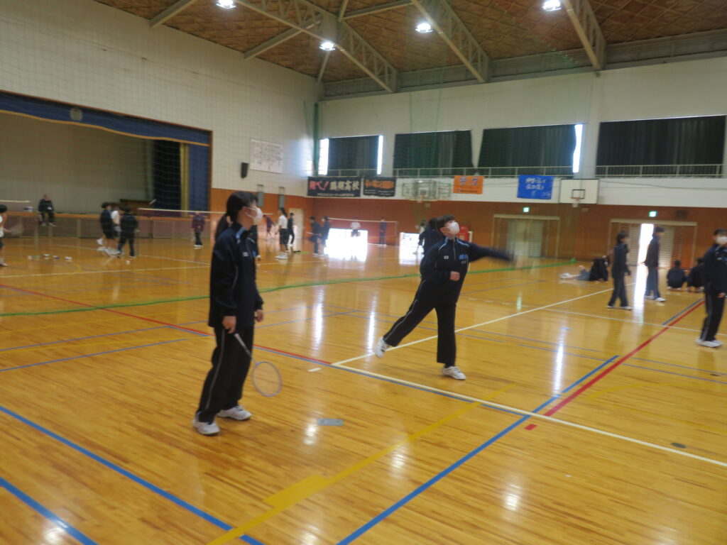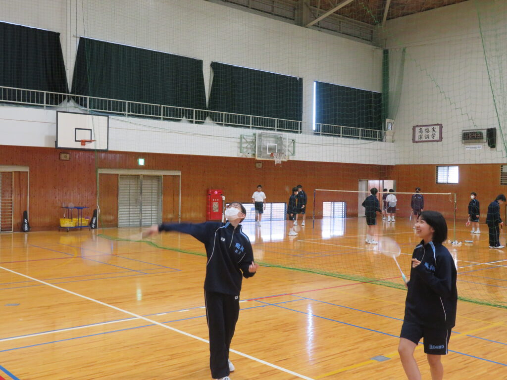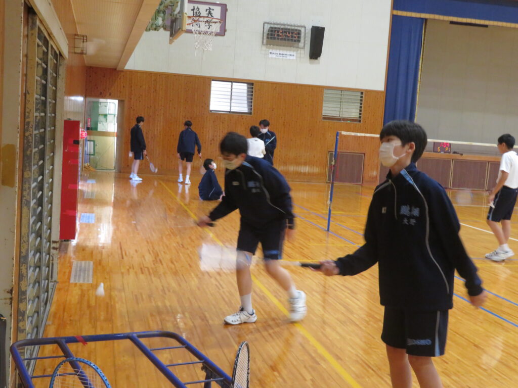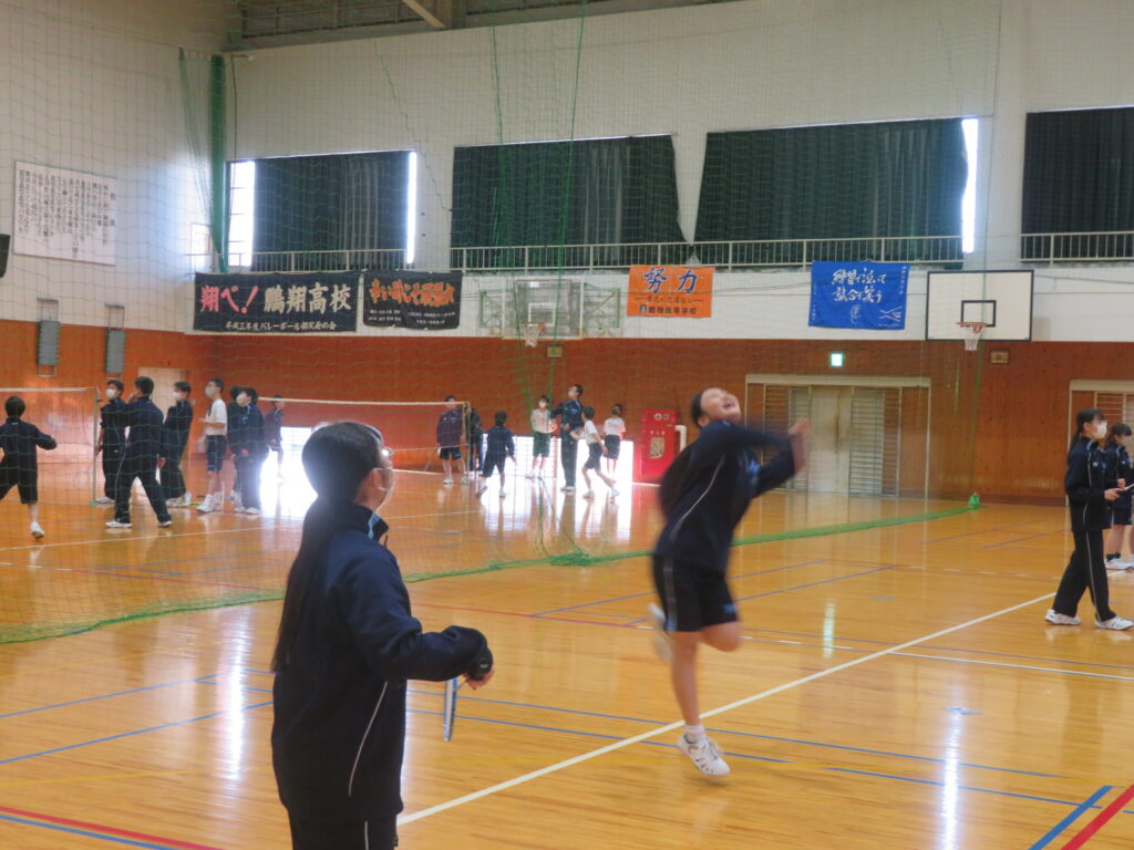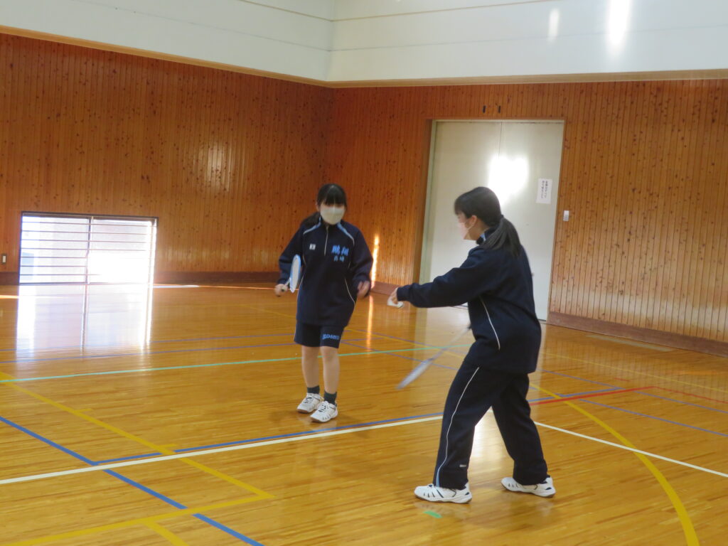 現在、体育の時間ではバドミントンを行っています。男女それぞれダブルスの試合をしていました。自分たちの試合が行われていない時間帯は他の子の応援をしたり、壁打ちをしたりしていました。