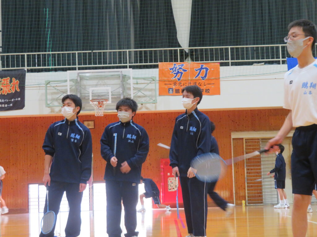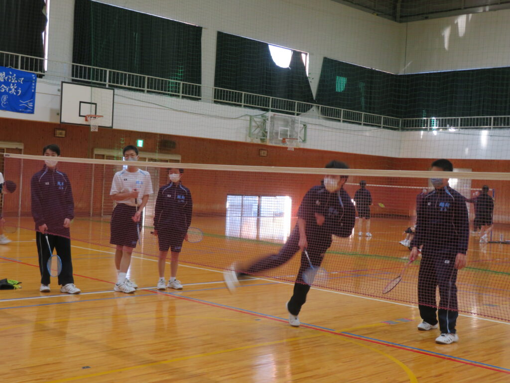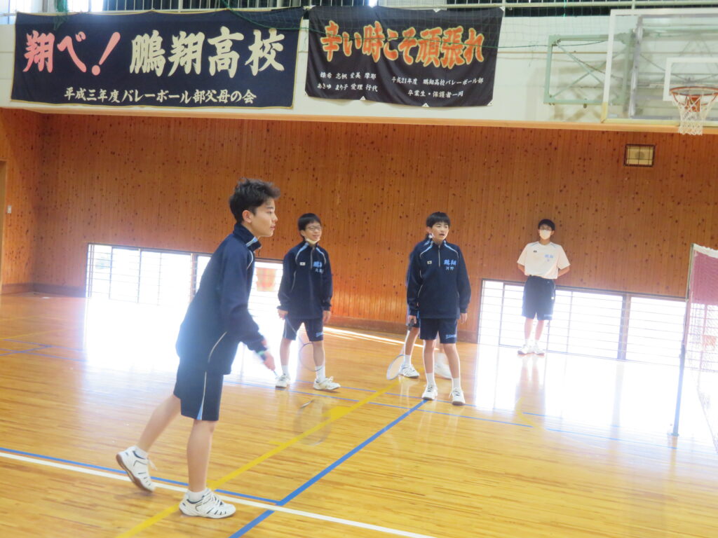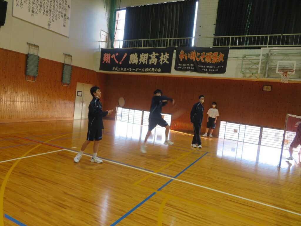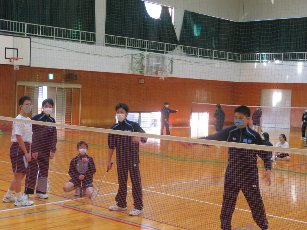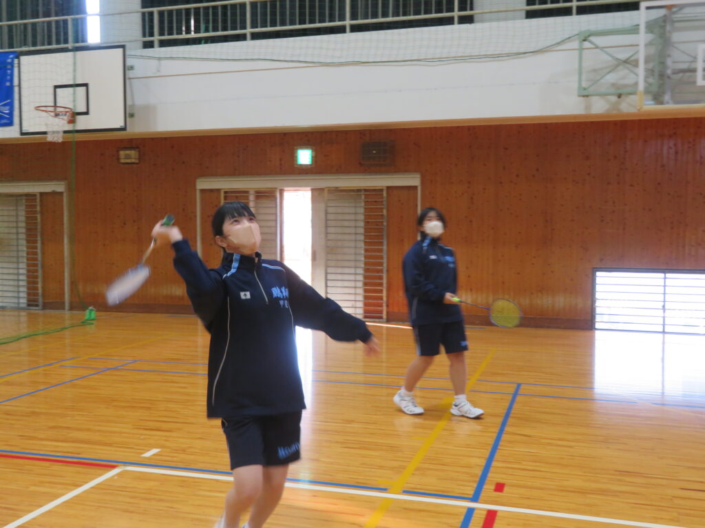 現在、体育の時間ではバドミントンを行っています。男女それぞれダブルスの試合をしていました。自分たちの試合が行われていない時間帯は他の子の応援をしたり、壁打ちをしたりしていました。