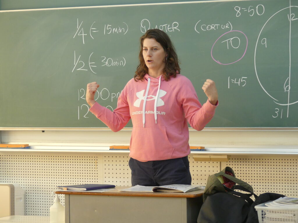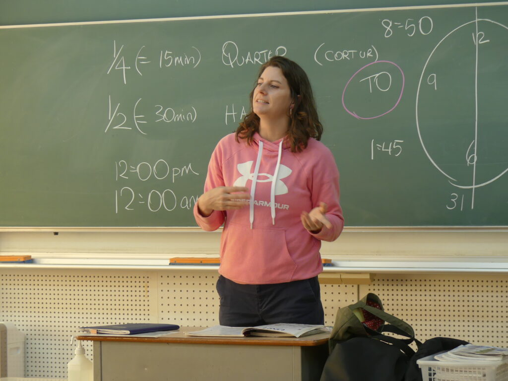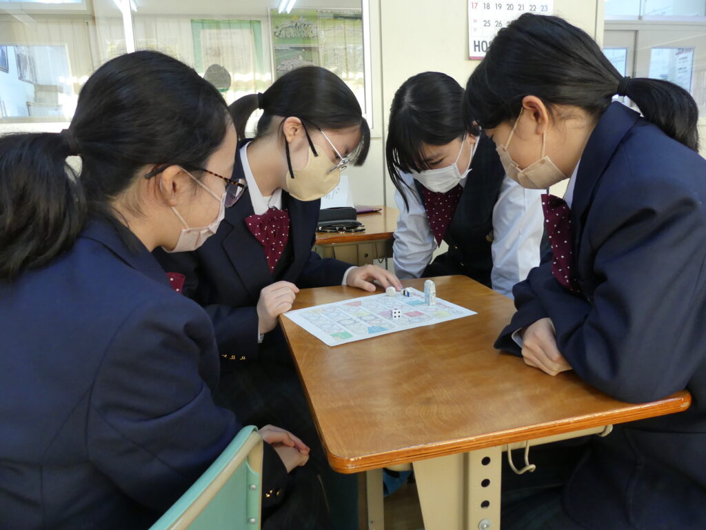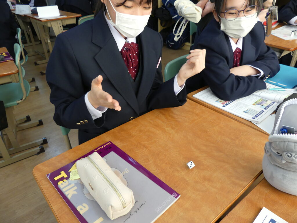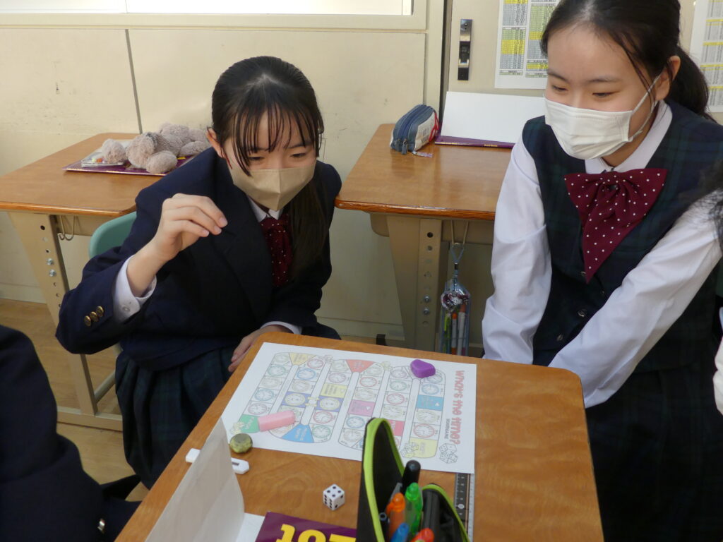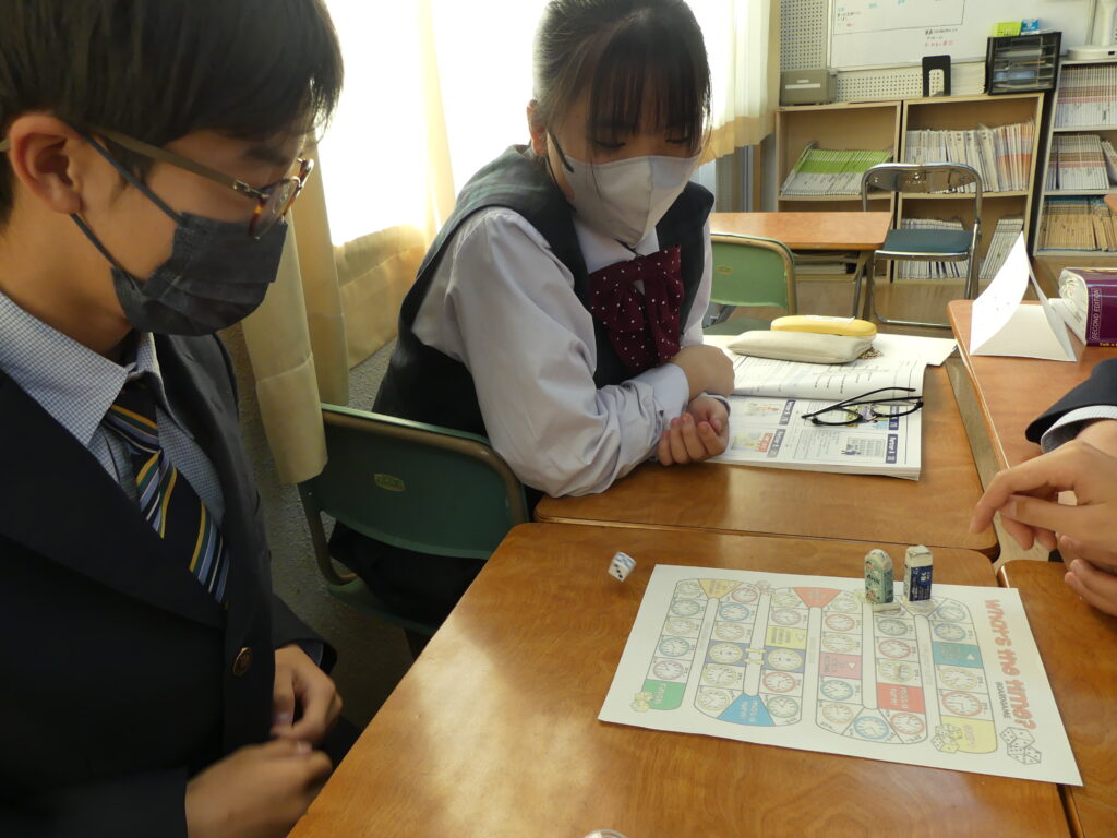 ルールは、すごろくで出た目に書いてある時刻を英語で言うもので、3人~4人を一班としてゲームが行われました。すごろくでは、1回休みや、2マス戻るなどのマスもあり、そうしたマスも、英語で指示が書かれ、生徒たちは英語で読んでいました。