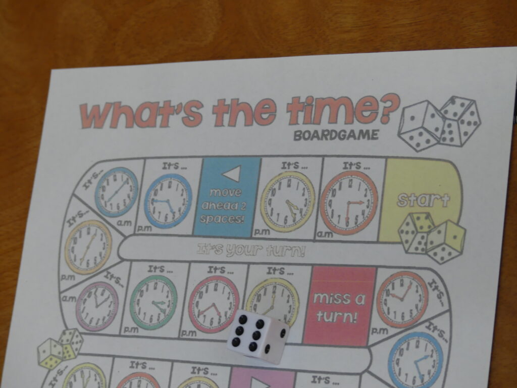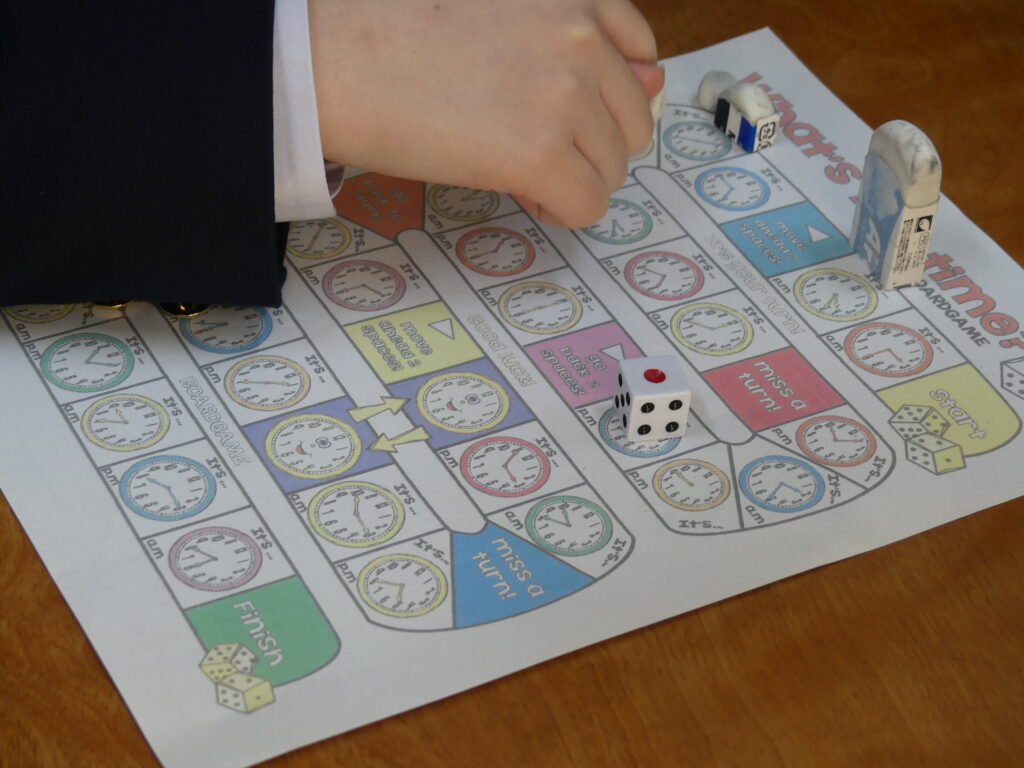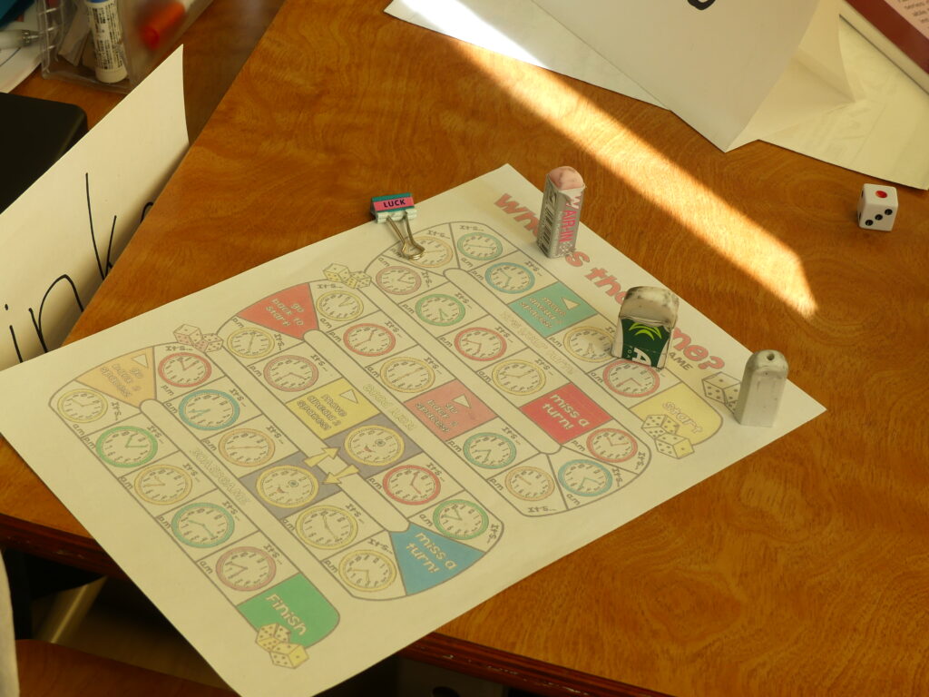 今日の1年生のALTの授業では、What’s the time?というボードゲームが行われました。