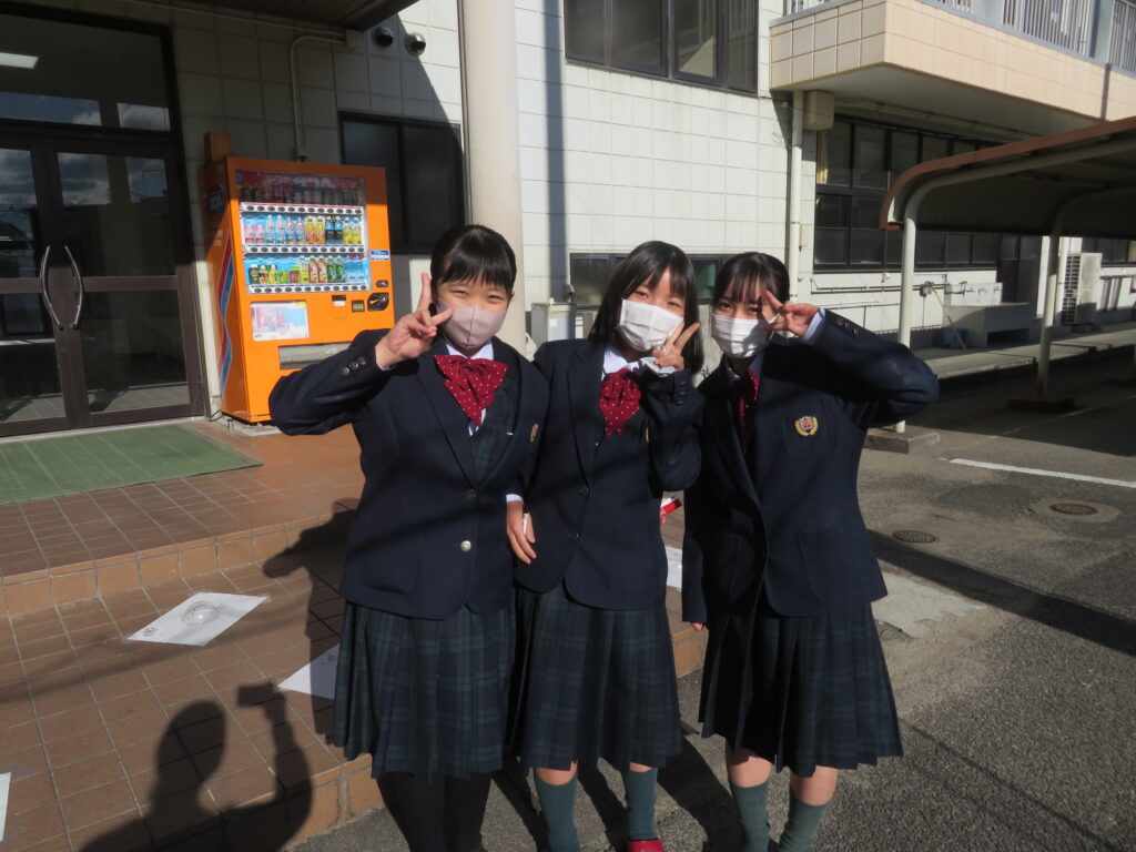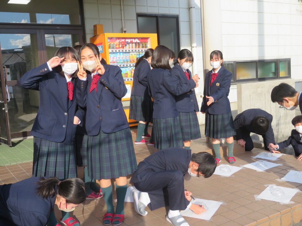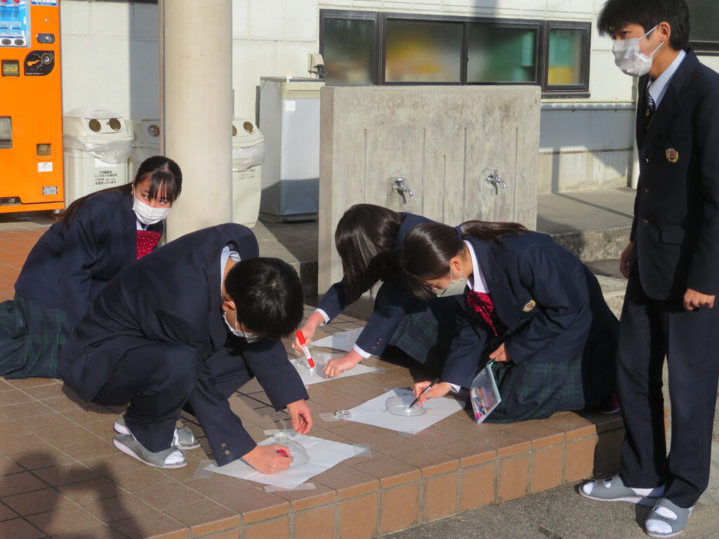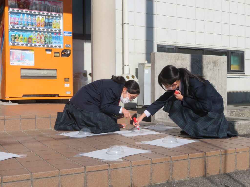 観測は、毎休み時間各班の担当生徒が記録に行きます。最初は、事務室前で観測をしていましたが、2限目休み時間からグラウンド前へ移動しました。とても冷たい風が吹く中、欠かさず観測を続けました。