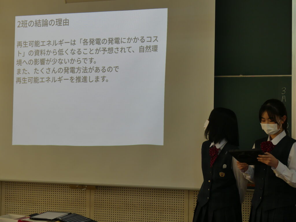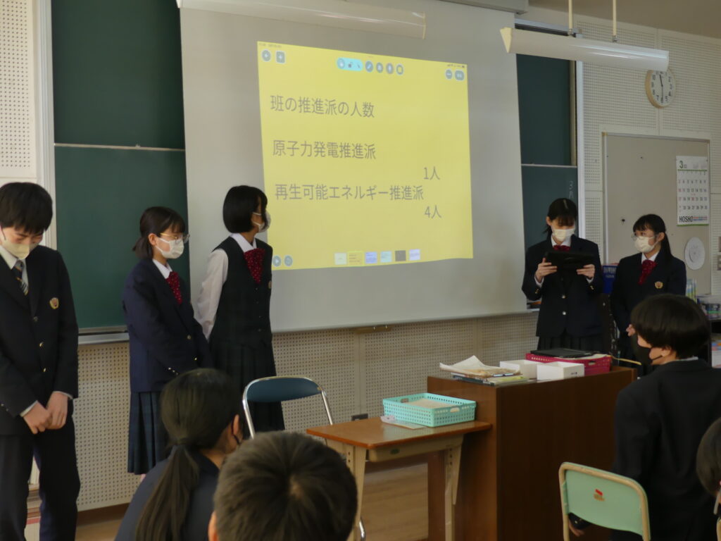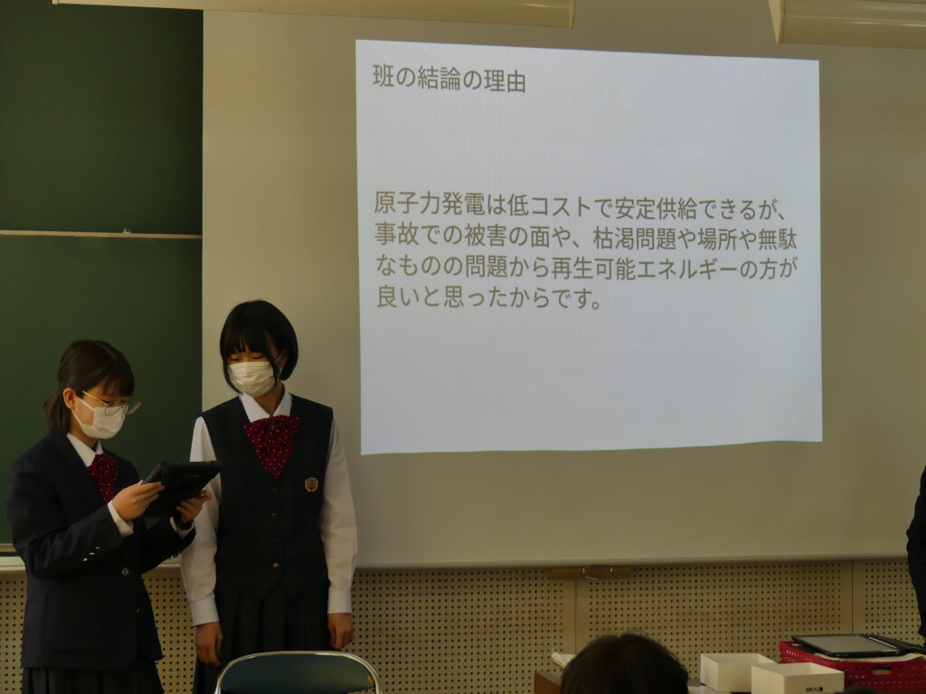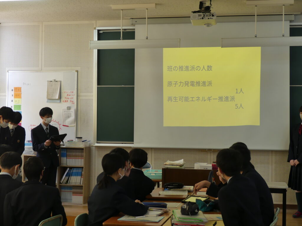 今回発表した3つの班はそれぞれ、原子力発電推進派が1グループ、再生可能エネルギー推進派が2グループといった結論にいたったようです。今後2年生全体で議論し、現代の課題の学びをより深めていくみたいです。