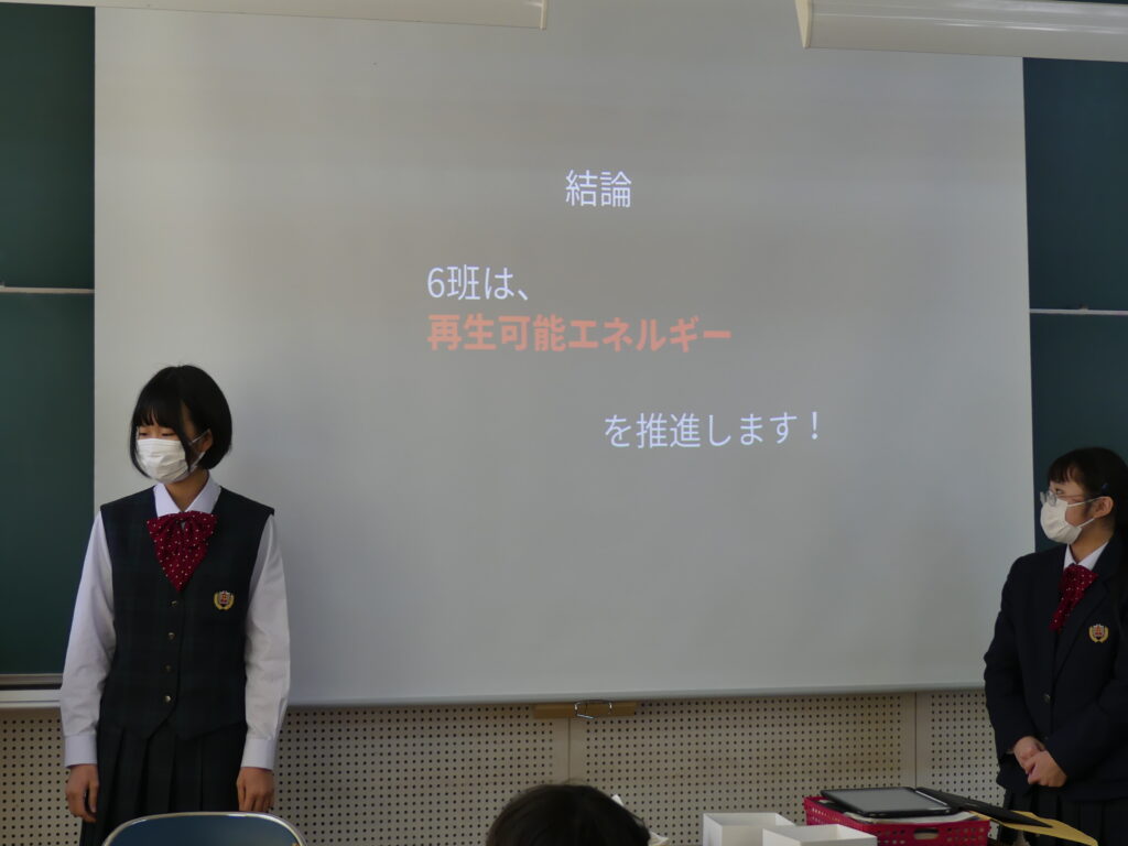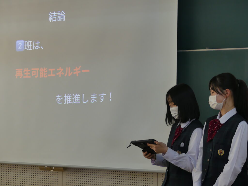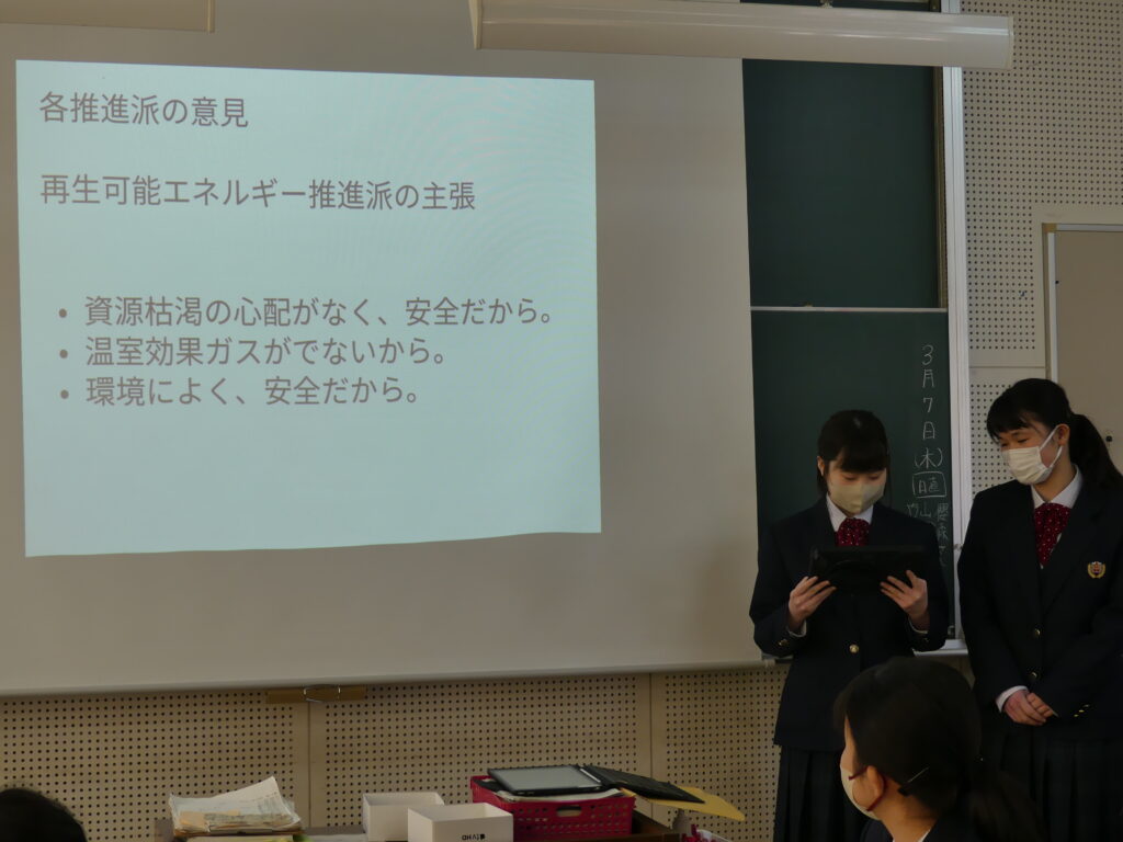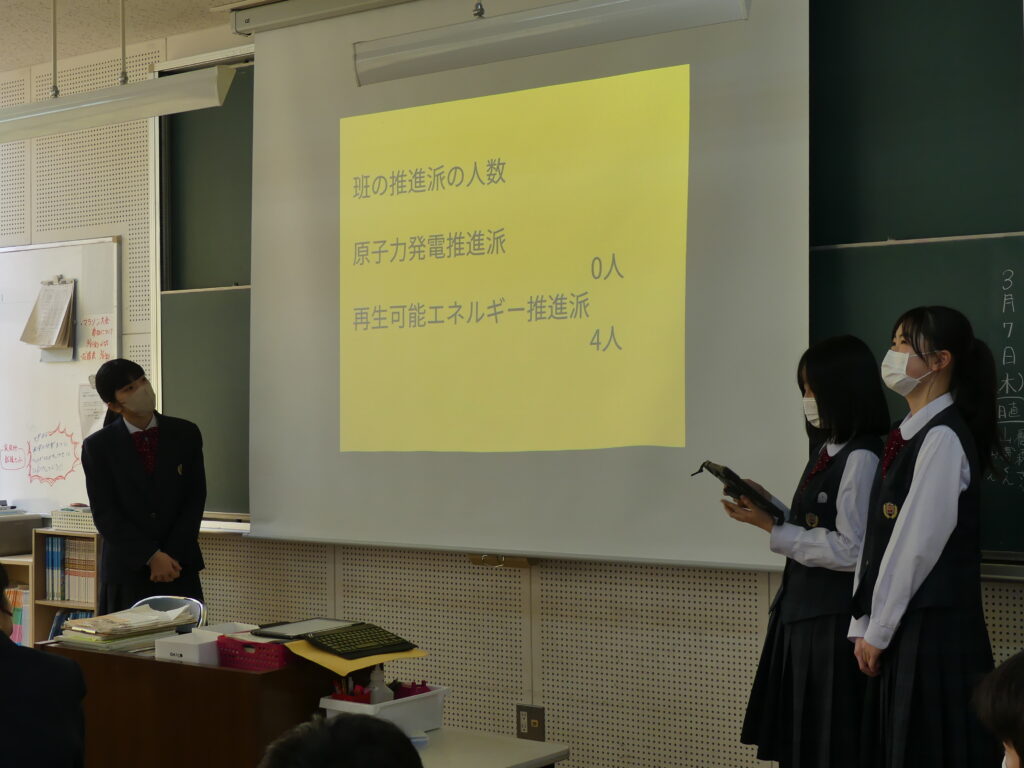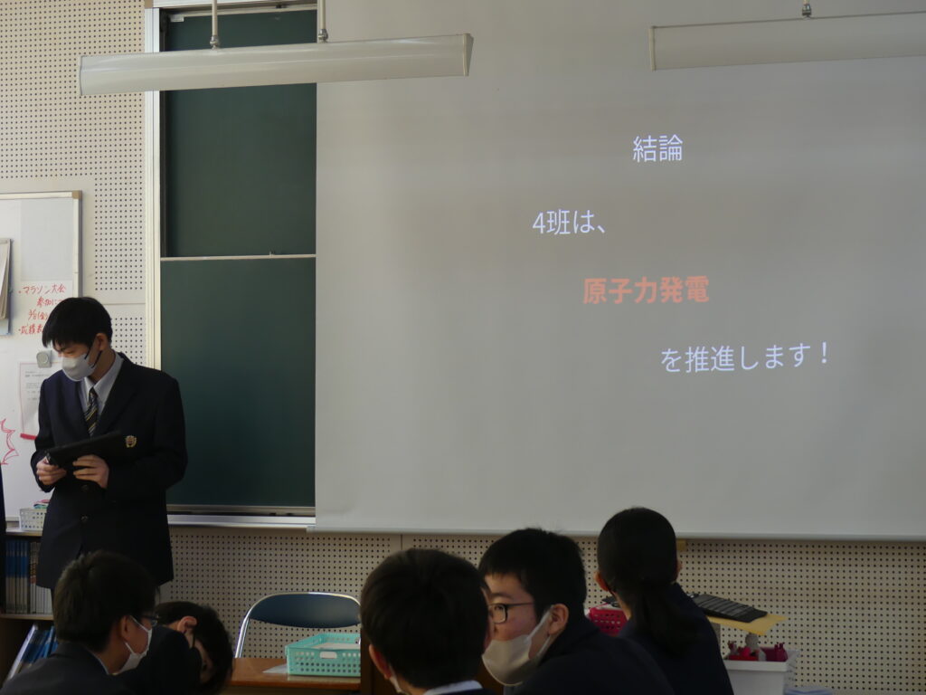 今回発表した3つの班はそれぞれ、原子力発電推進派が1グループ、再生可能エネルギー推進派が2グループといった結論にいたったようです。今後2年生全体で議論し、現代の課題の学びをより深めていくみたいです。