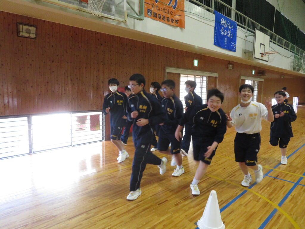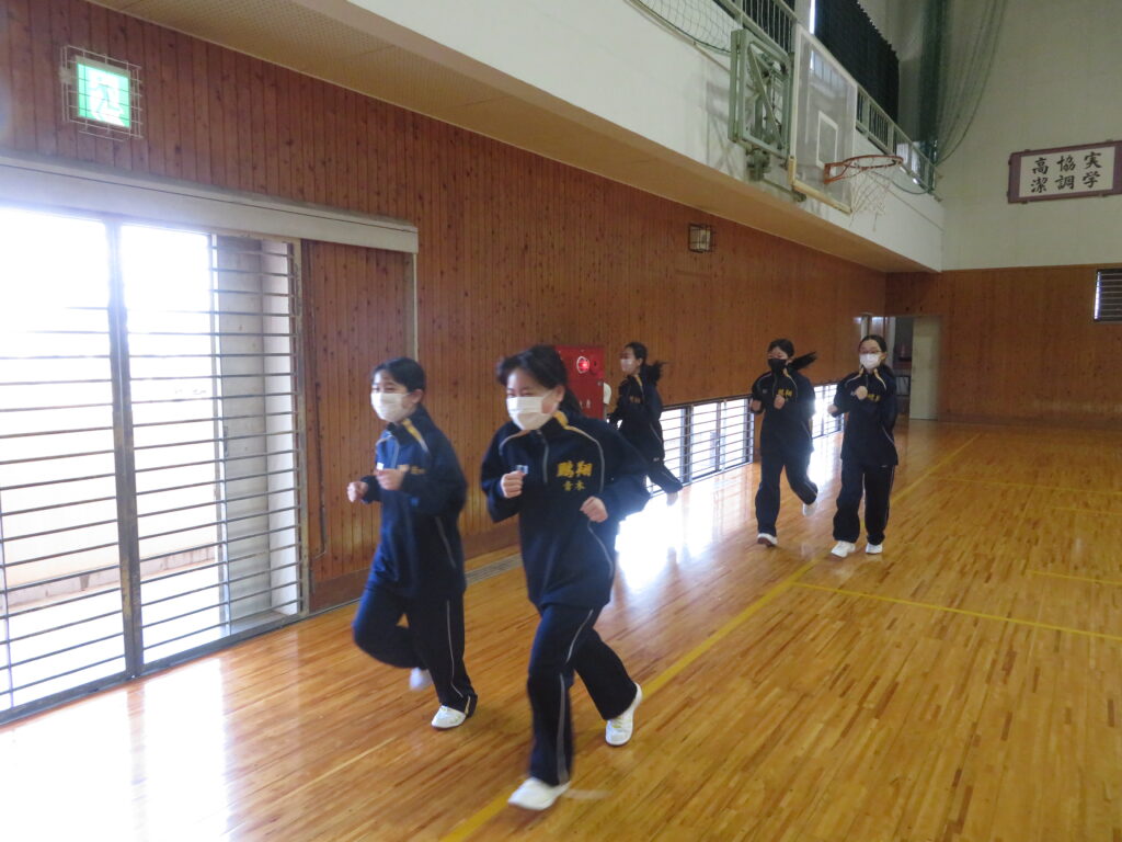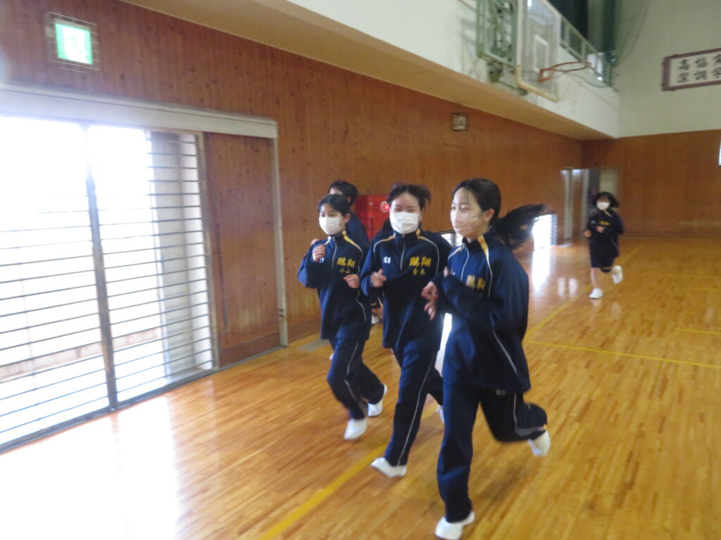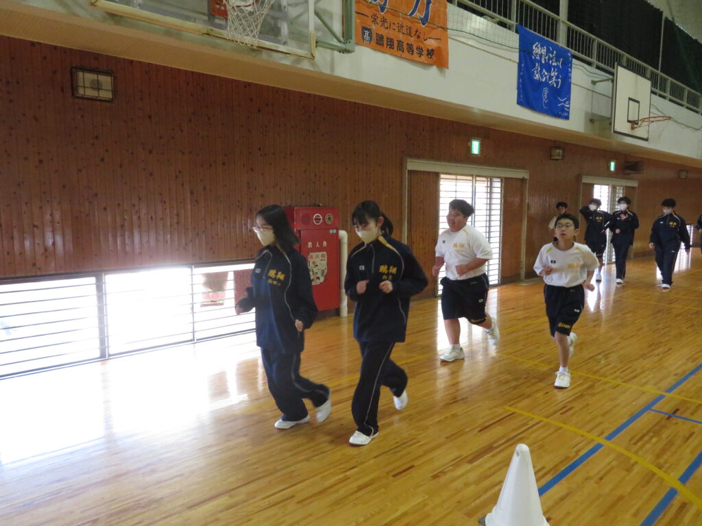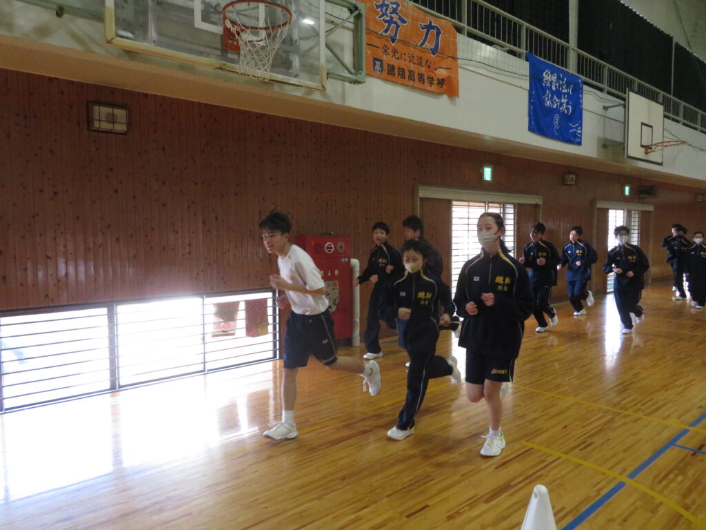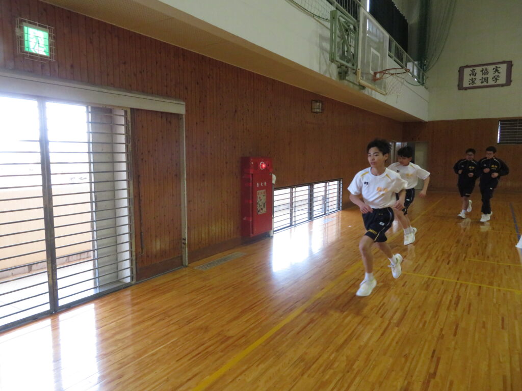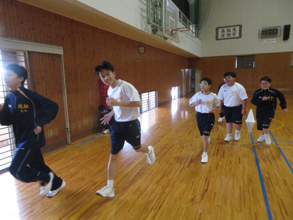 明日のマラソン大会に向けて、J1生は最後の時間走に挑戦していました。この写真は、10分間走の様子です。
