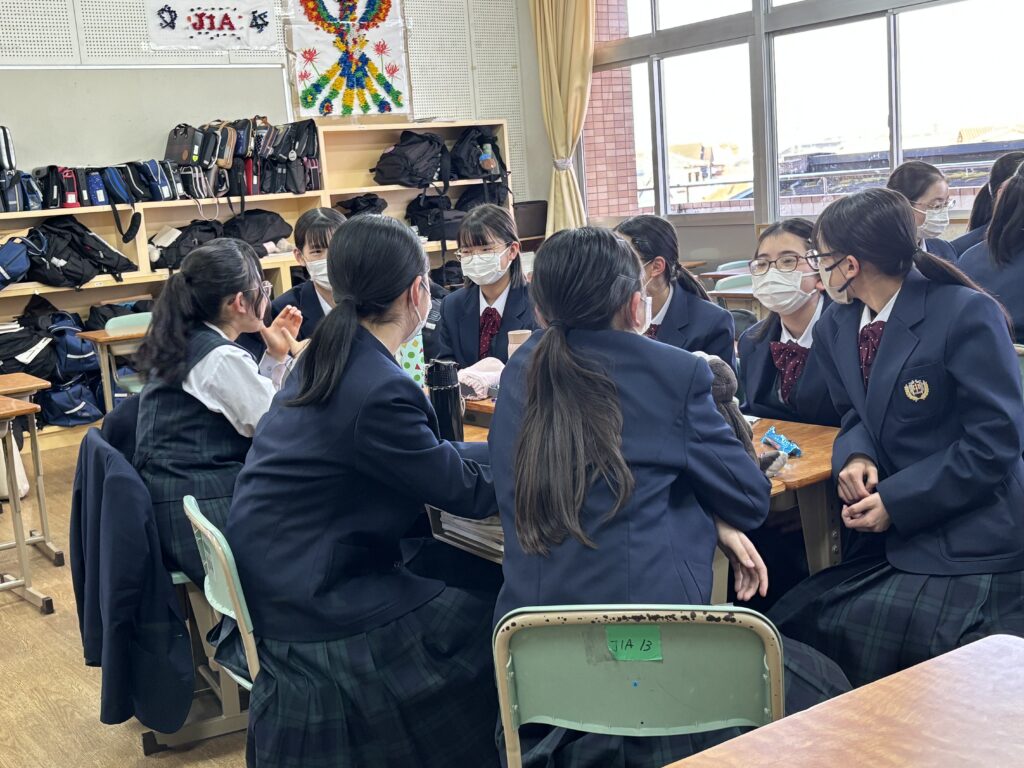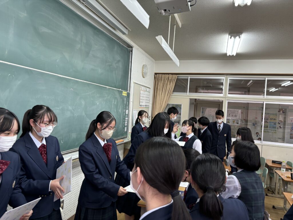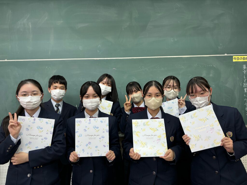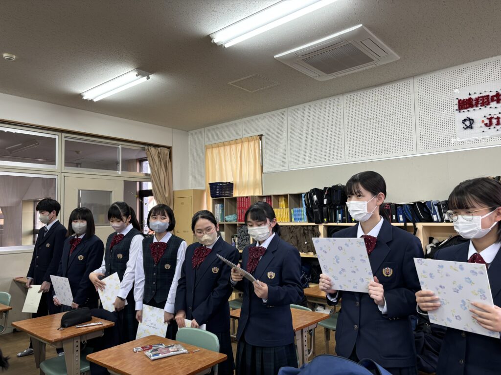 J1生とJ2生から、色紙のプレゼントがありました。英語を通して、様々なゲームに取り組んだり、先生と会話をしたりと楽しく活動に取り組んできました。その中で、どんな時でも率先して行動するJ3生の姿は、後輩の目にはとても凛々しく映っていたのではないでしょうか。後輩から受け取った色紙を大事に抱え、嬉しそうな表情を浮かべていました。