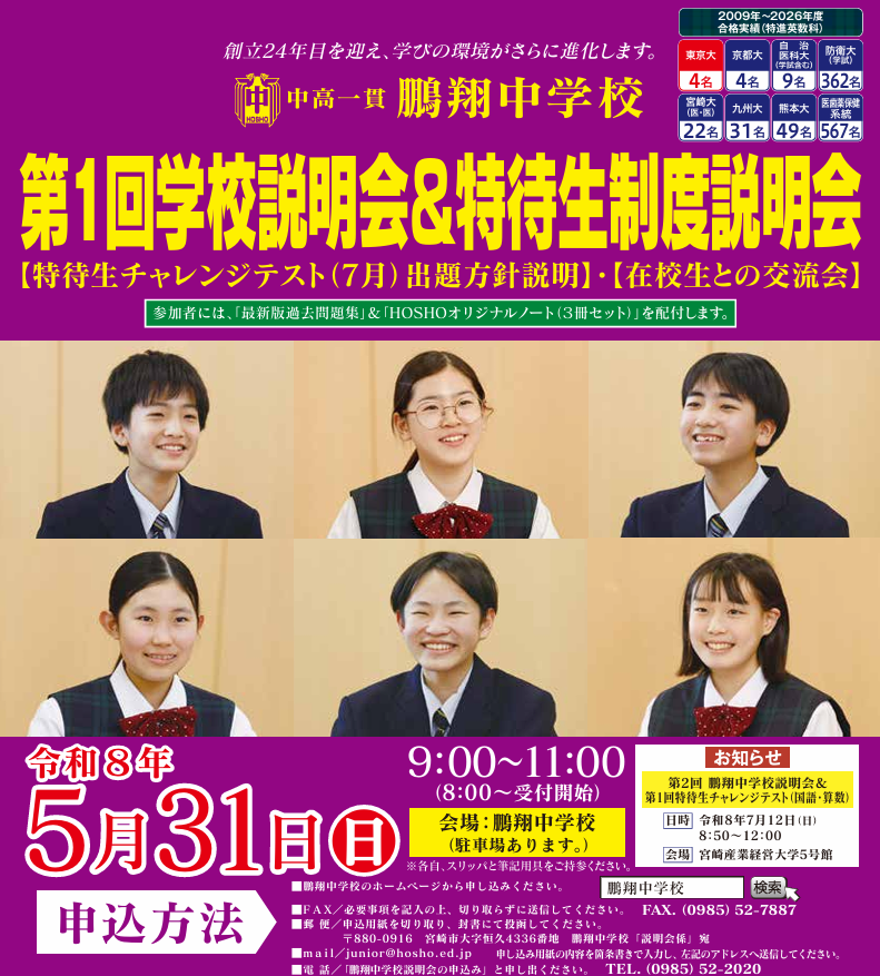 今回の鵬翔中学校の学校説明会で、受験のスタート、中学校進学への意識作り。そして特待生チャレンジテストに向けた対策をしていただければと思います。