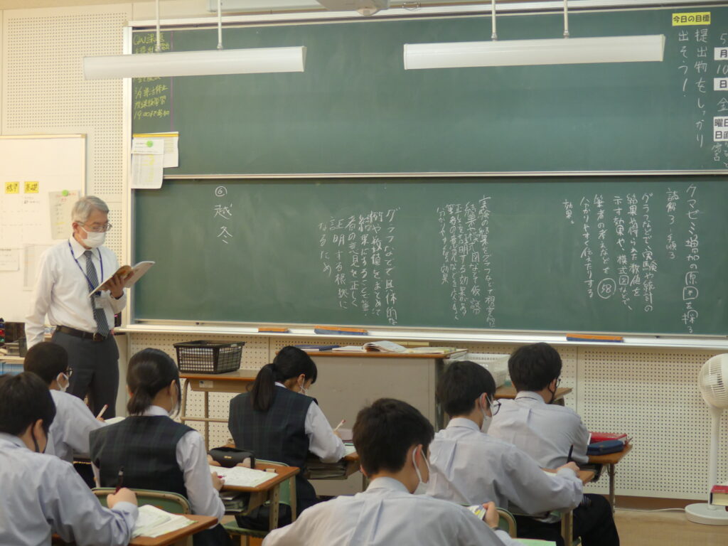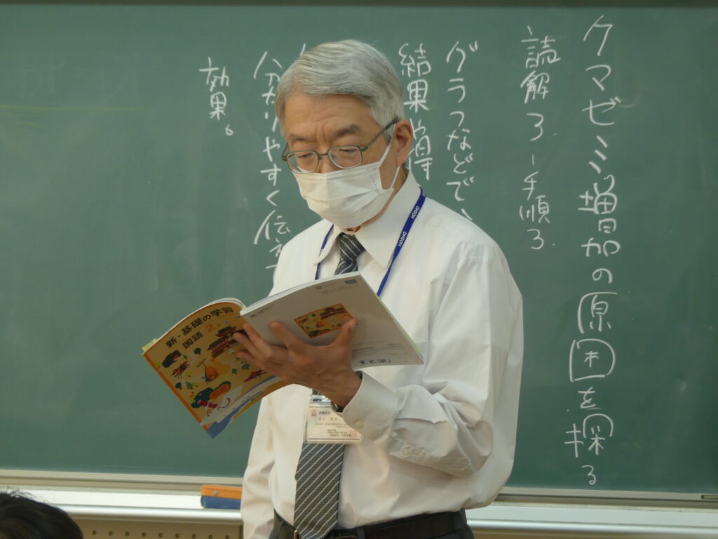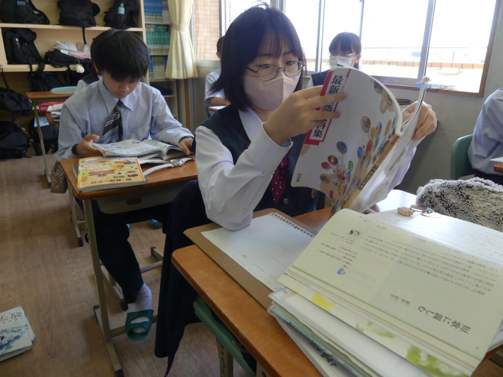 3クラスに分かれて行われる国語の授業では「クマゼミ増加の原因を探る」と「短歌」の内容をそれぞれで学習している様子が見られました。