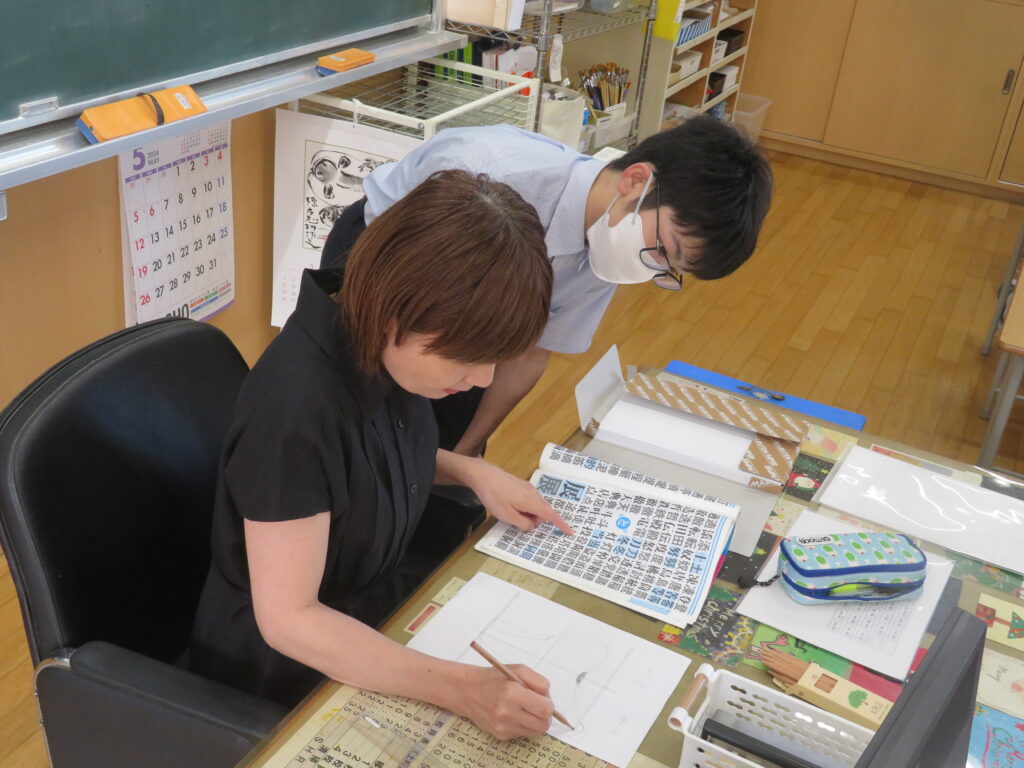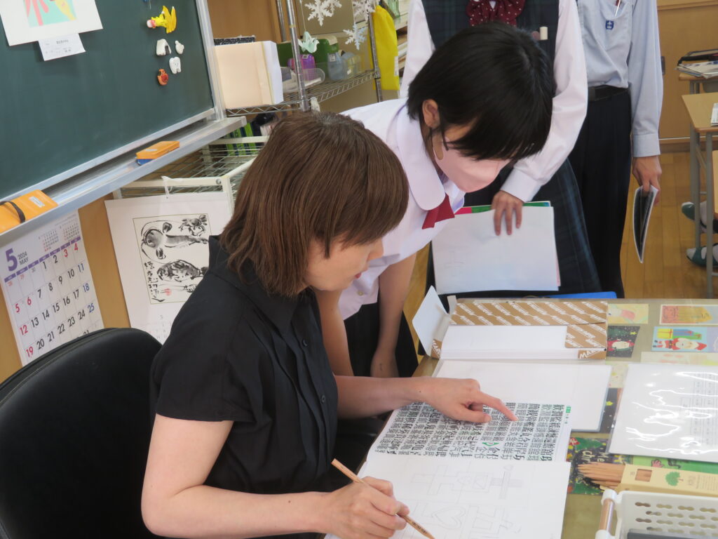 下書きを終えた生徒は金子先生にアドバイスをもらいながらより良い作成を作るためにデザインを行っていました。