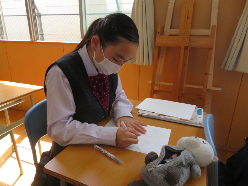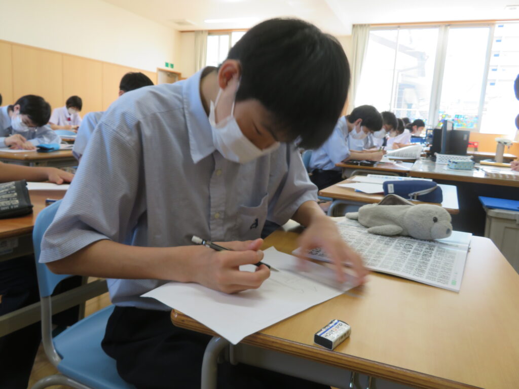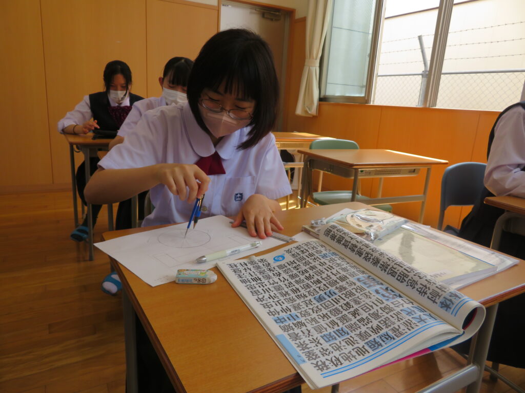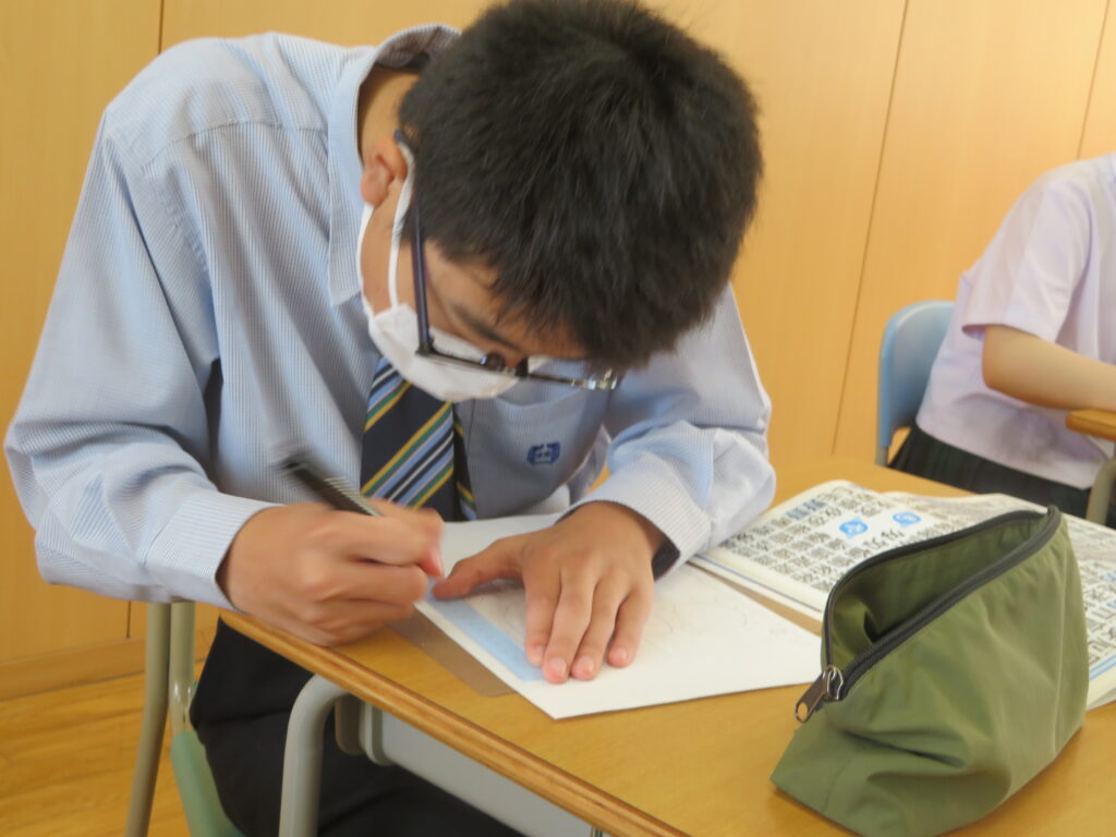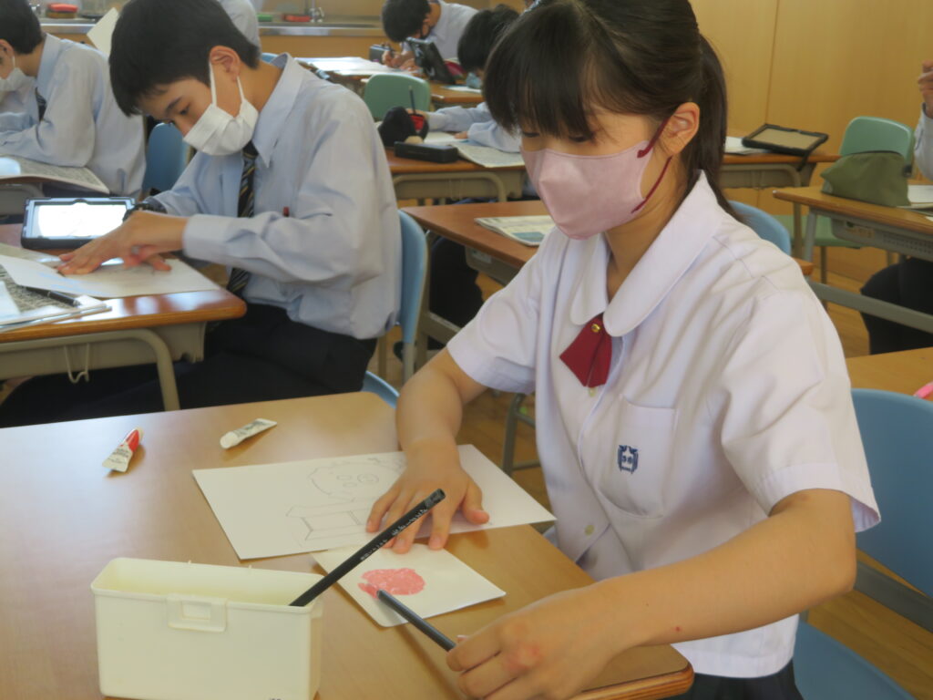 J 2の美術ではレタリングを行っています。基本となるレタリングから発展させた学習をしています。漢字を1字選び、その漢字からイメージをふくらませて絵文字を制作しています。