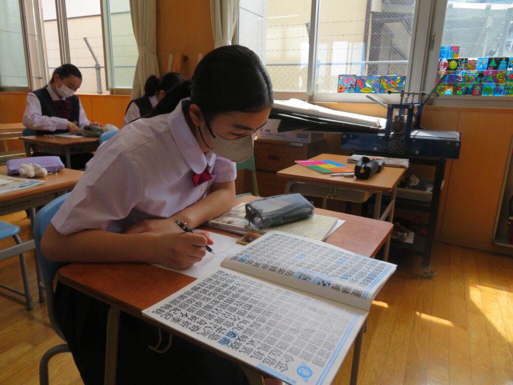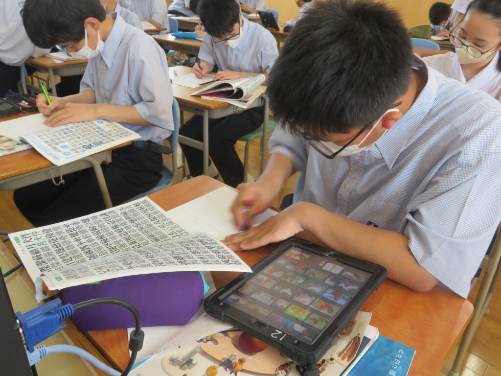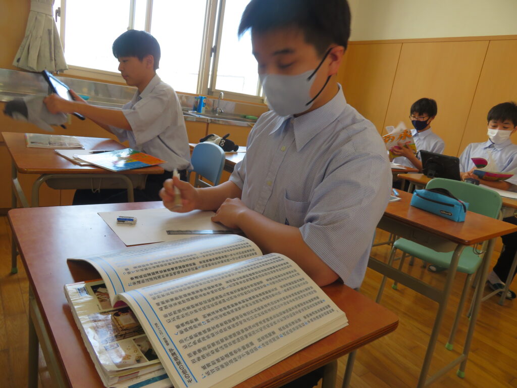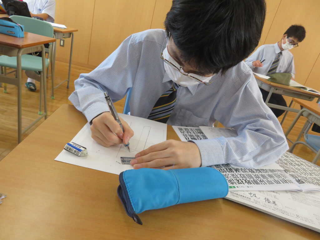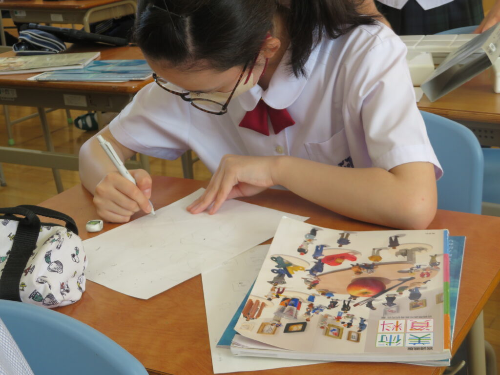 J 2の美術ではレタリングを行っています。基本となるレタリングから発展させた学習をしています。漢字を1字選び、その漢字からイメージをふくらませて絵文字を制作しています。