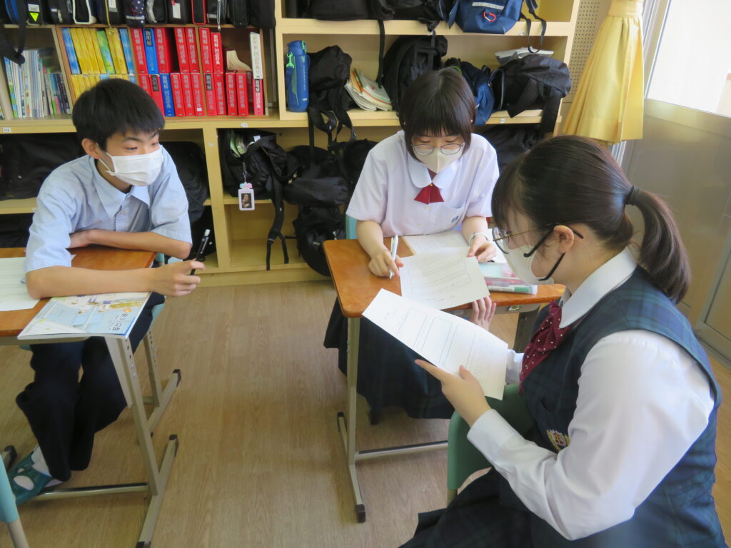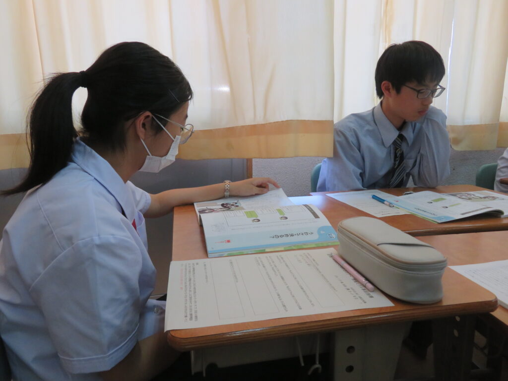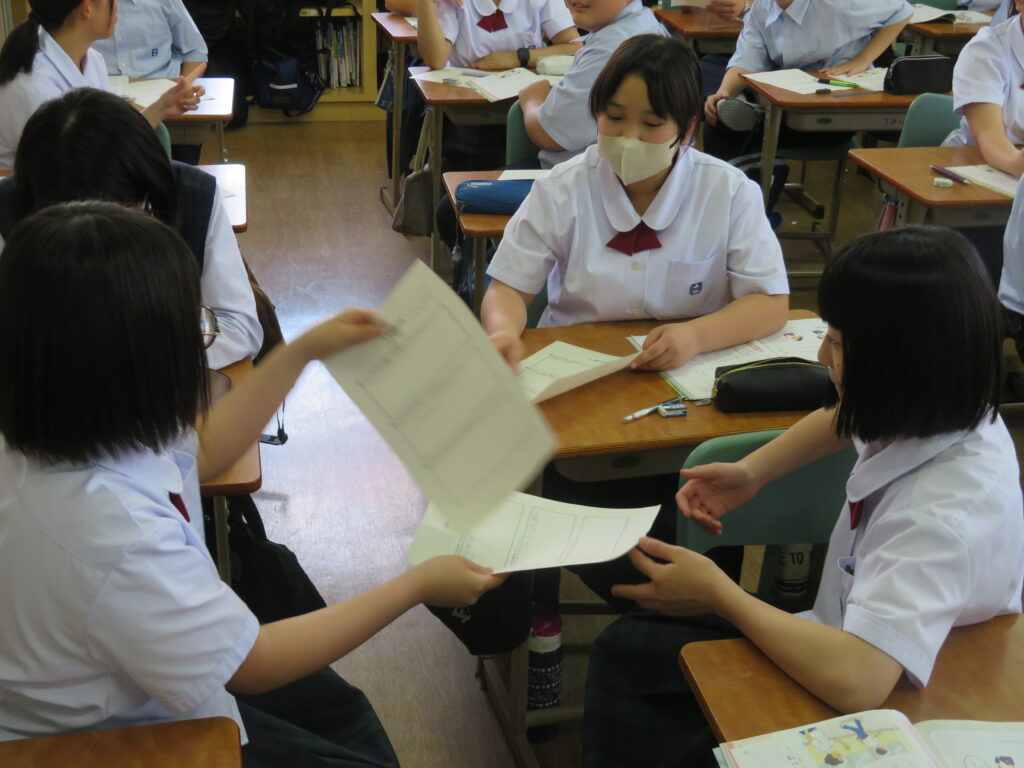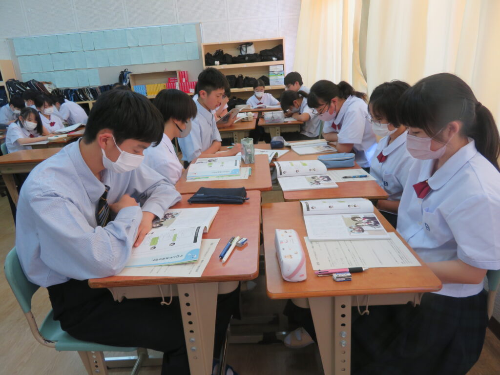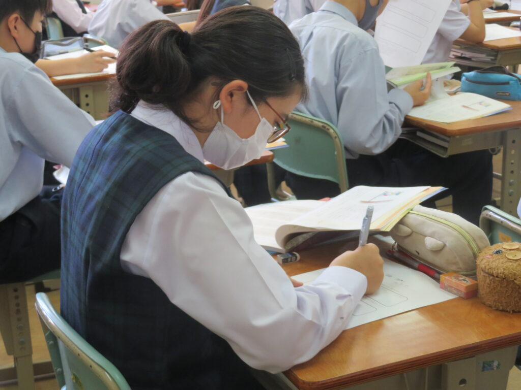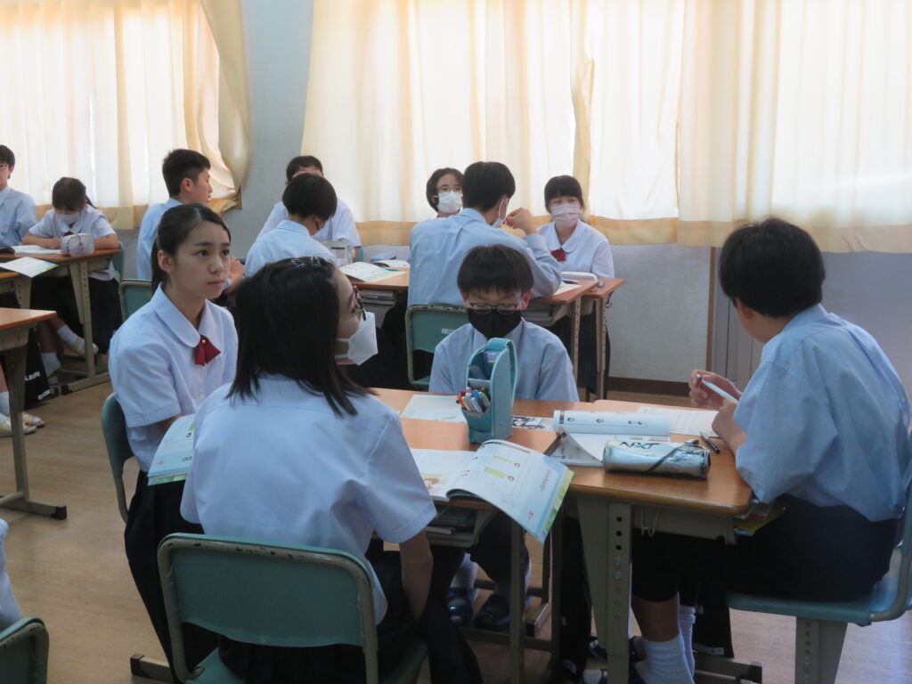 グループ討論をしたり、自分の考えを発表したりして、クラスみんなで今日の題材について考えていました。J1-Aは、たくさんの生徒が挙手をし、積極的に自分の意見を述べていました。友人の意見を聞き、いろんな気づきをもらい、新しい価値観等に気づく貴重な時間となっています。