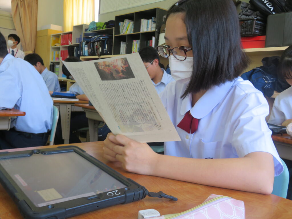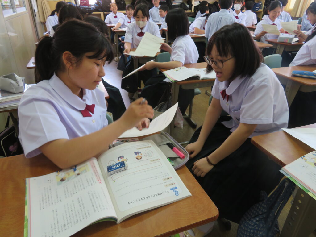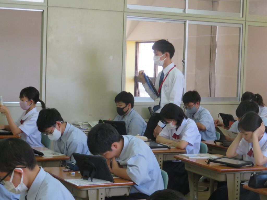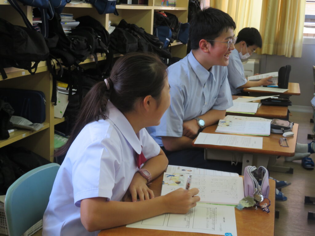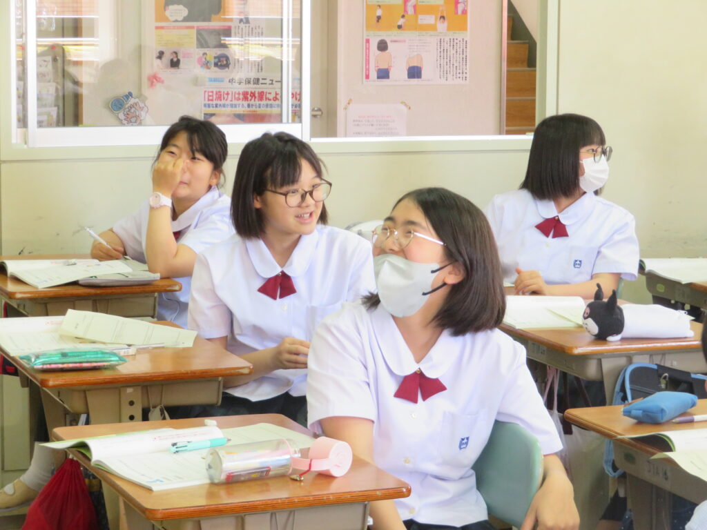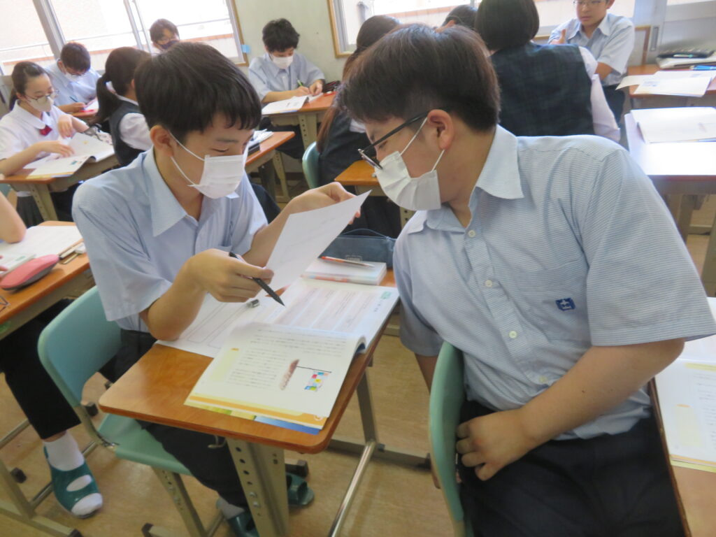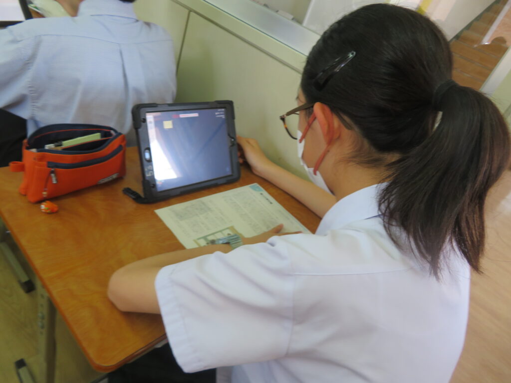 グループ討論をしたり、自分の考えを発表したりして、クラスみんなで今日の題材について考えていました。J1-Aは、たくさんの生徒が挙手をし、積極的に自分の意見を述べていました。友人の意見を聞き、いろんな気づきをもらい、新しい価値観等に気づく貴重な時間となっています。