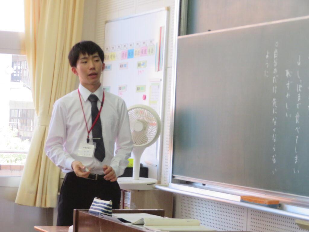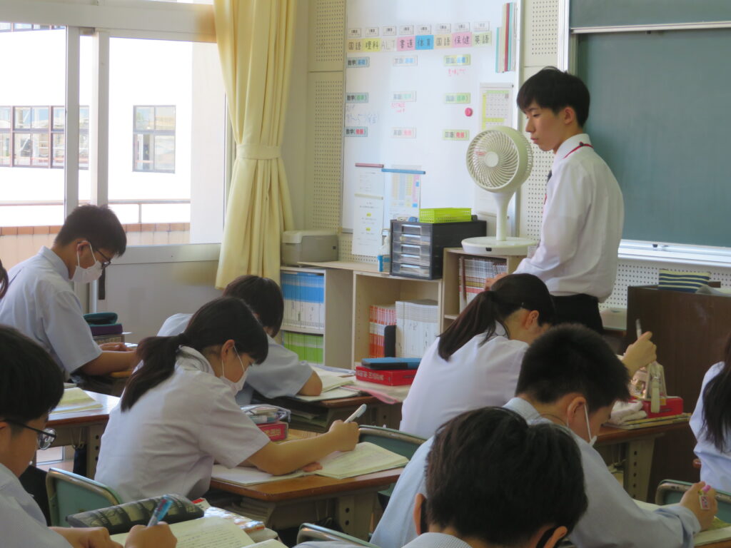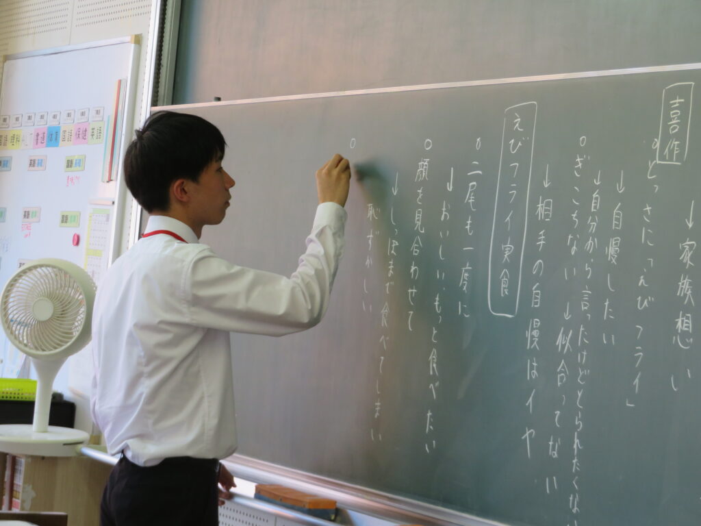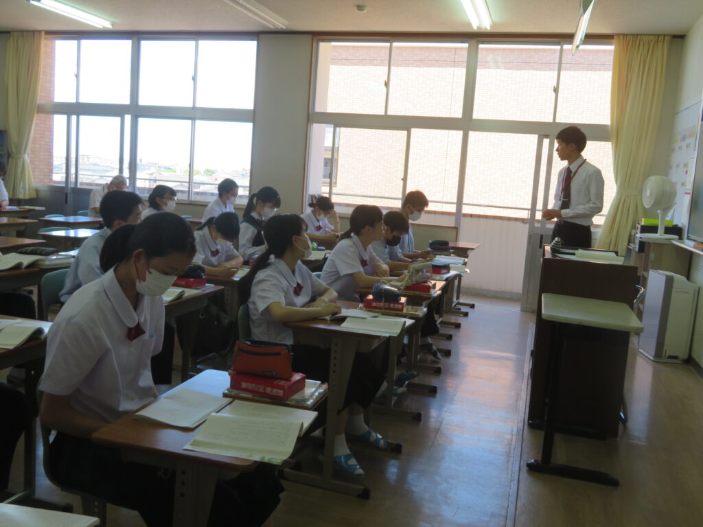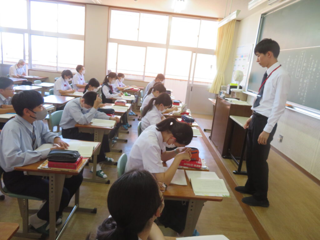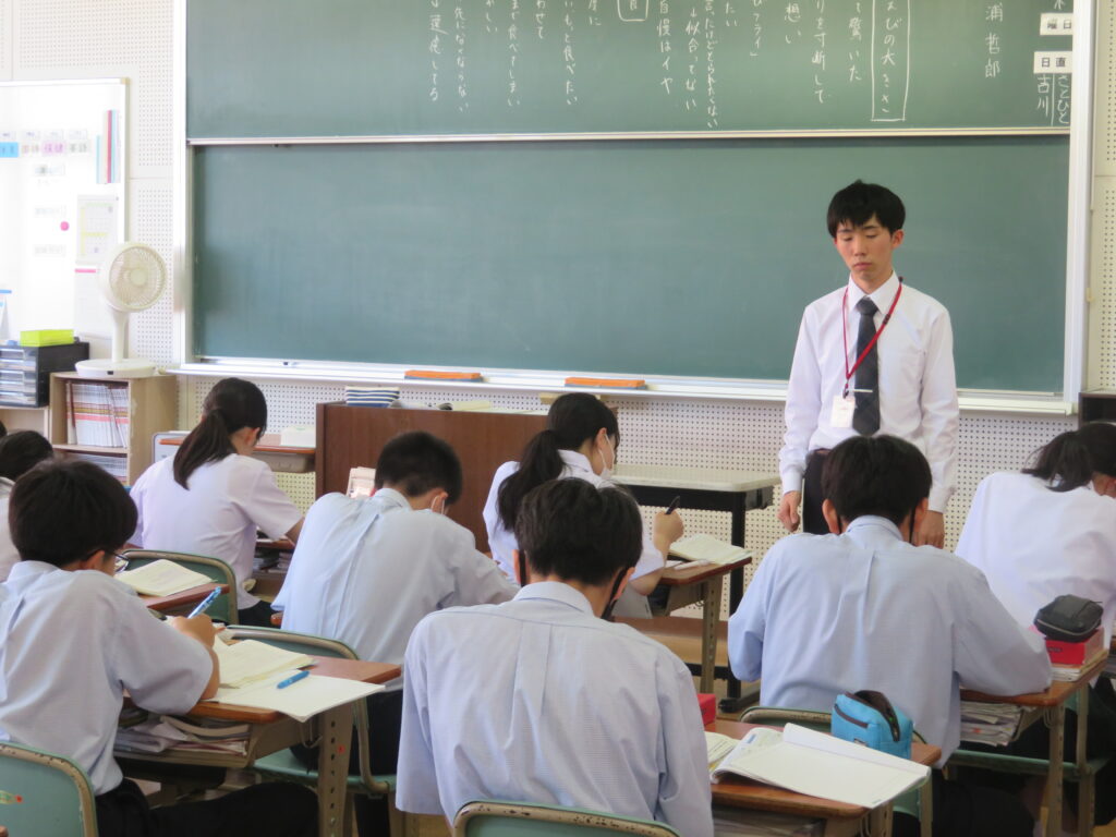 5月末から教育実習生として、鵬翔中学校の卒業生(第13期生)である二見亘俊先生(九州大学・文学部)が来てくれています。今日は、J2で国語の研究授業を行いました。