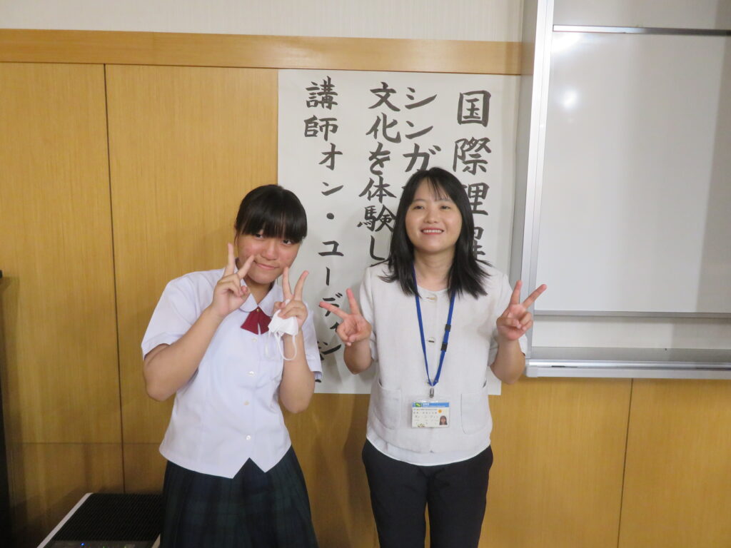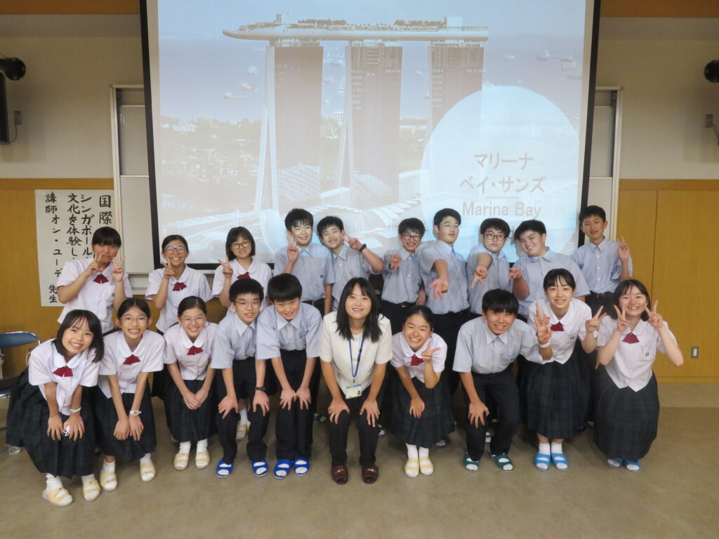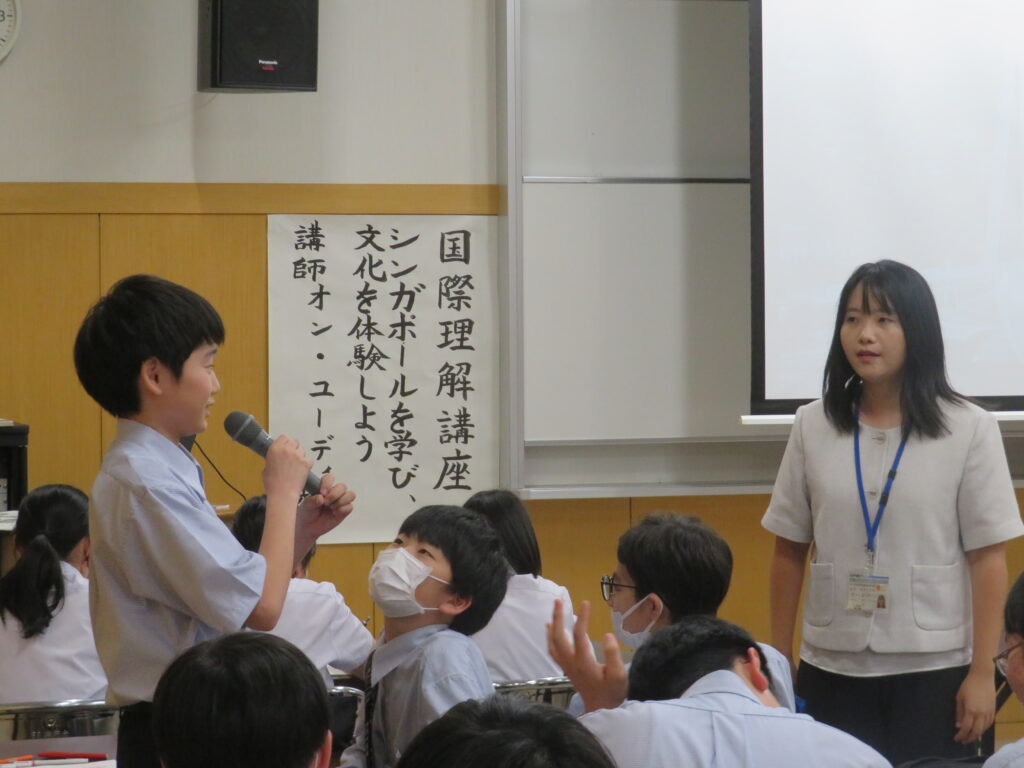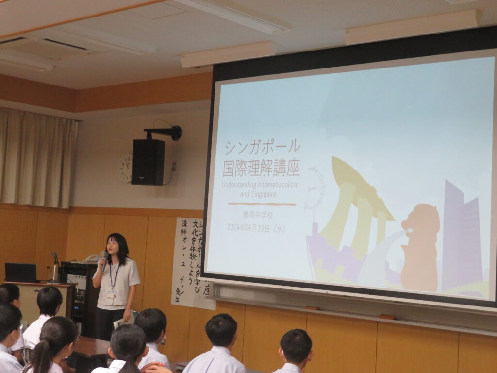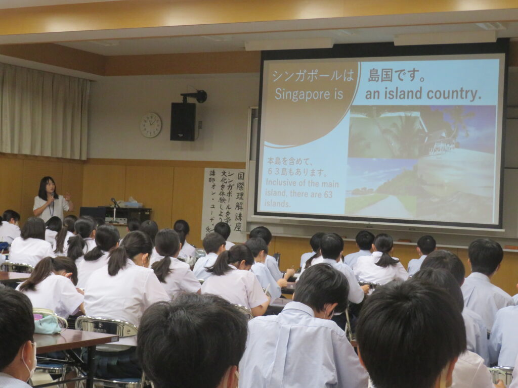 本日、J1・J2生を対象に国際理解講座を実施しました。今年はシンガポールについて学びました。国際交流員のオン・ユーディン先生に来ていただき、講話をしていただきました。