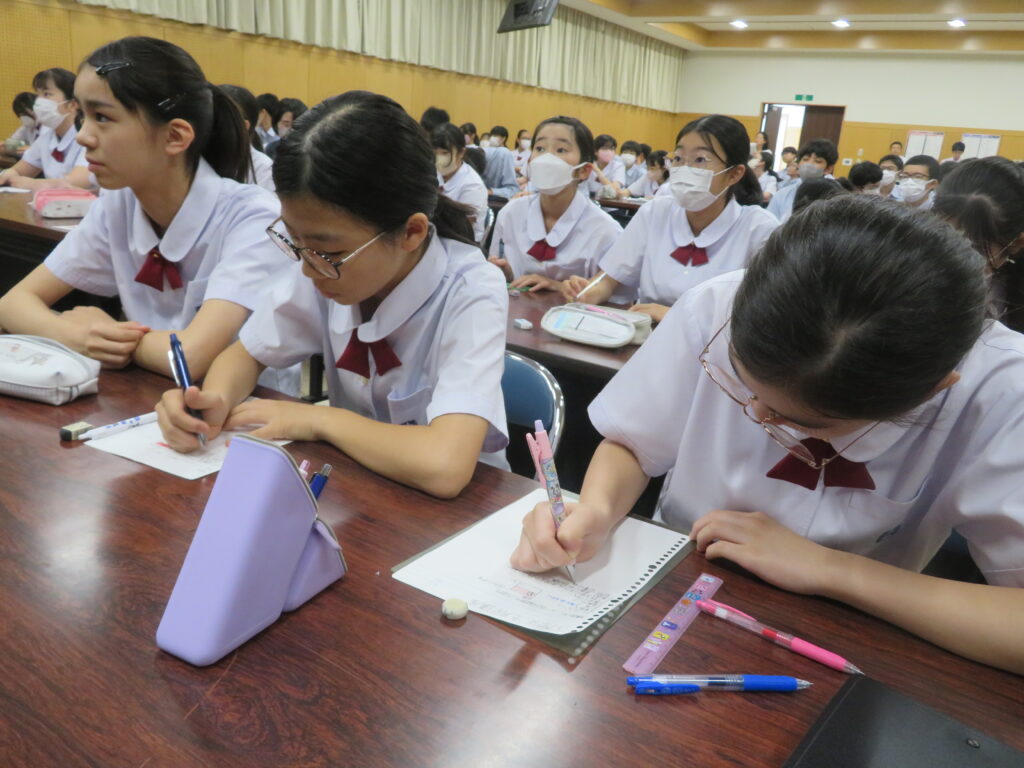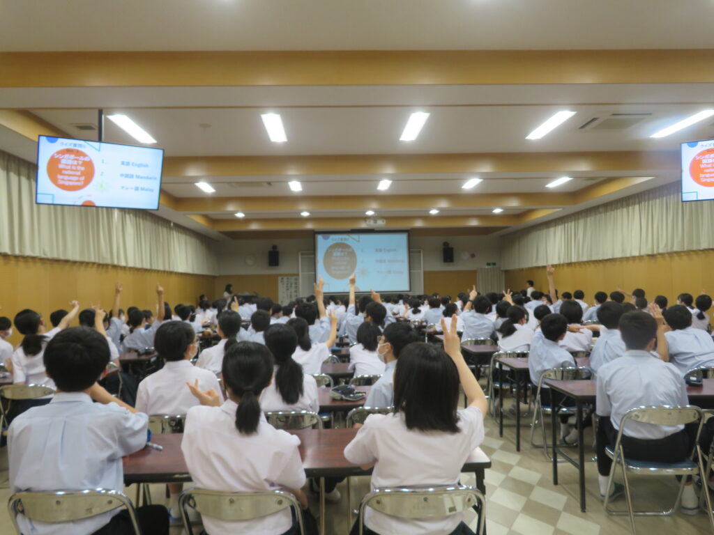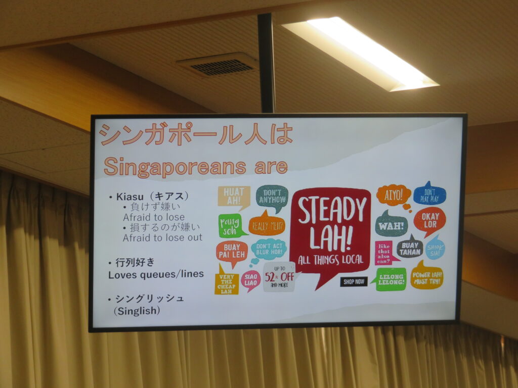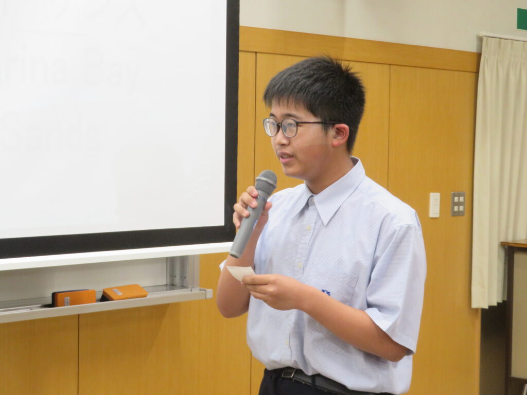 シンガポールの歴史やシングリッシュなどクイズを交えながら楽しく学ぶことができました。生徒たちは大切なところはメモを取りながら興味津々に耳を傾けていました。