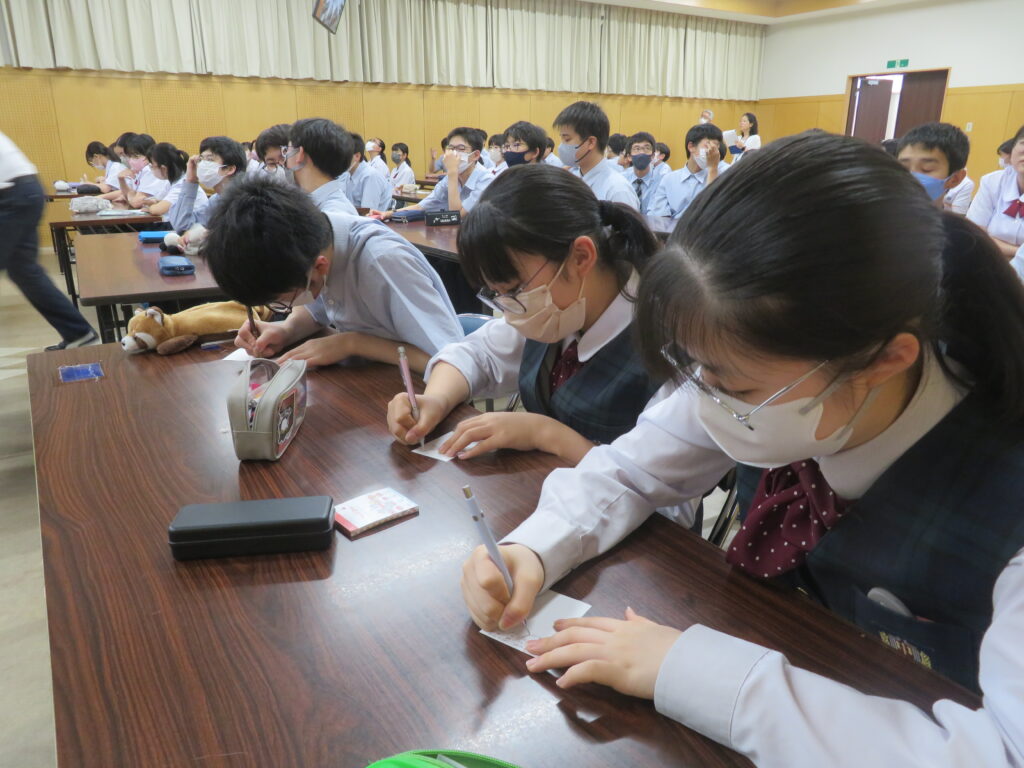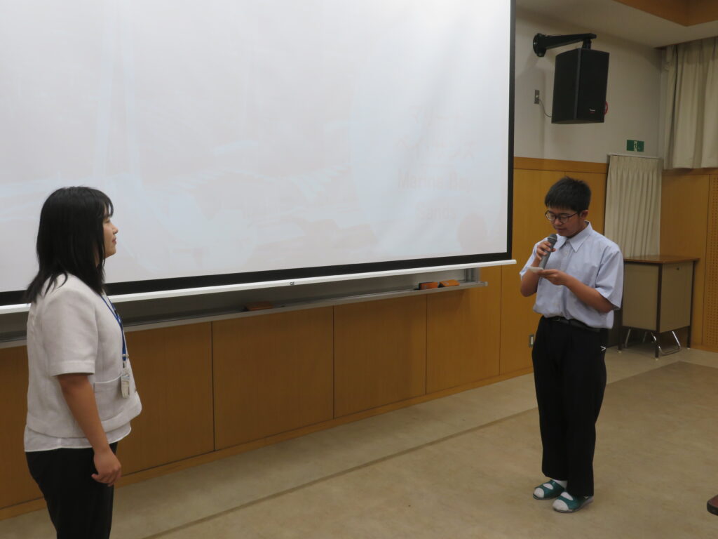 最後に生徒を代表してJ2A吉田琉星さん(瓜生野小出身)がお礼の言葉を述べてくれました。また、演題をJ2B床次香織さん(恒久小出身)が作成してくれました。