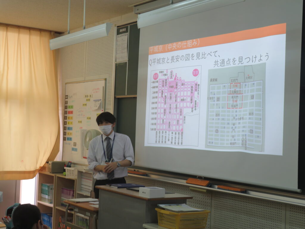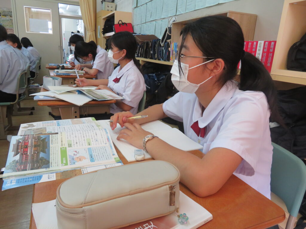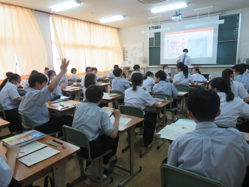 本日はJ1生の歴史の授業を紹介いたします。歴史の授業では生徒が積極的に発表する姿と真剣にスライドを見て書きとる姿がありました。