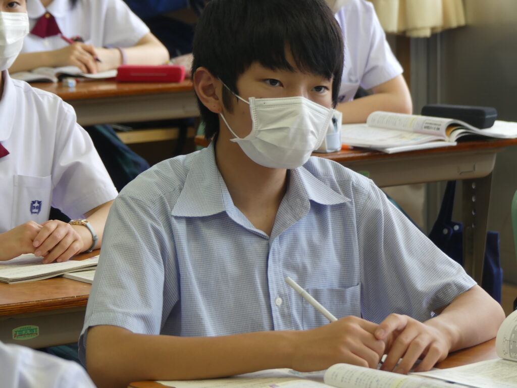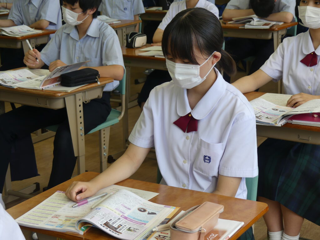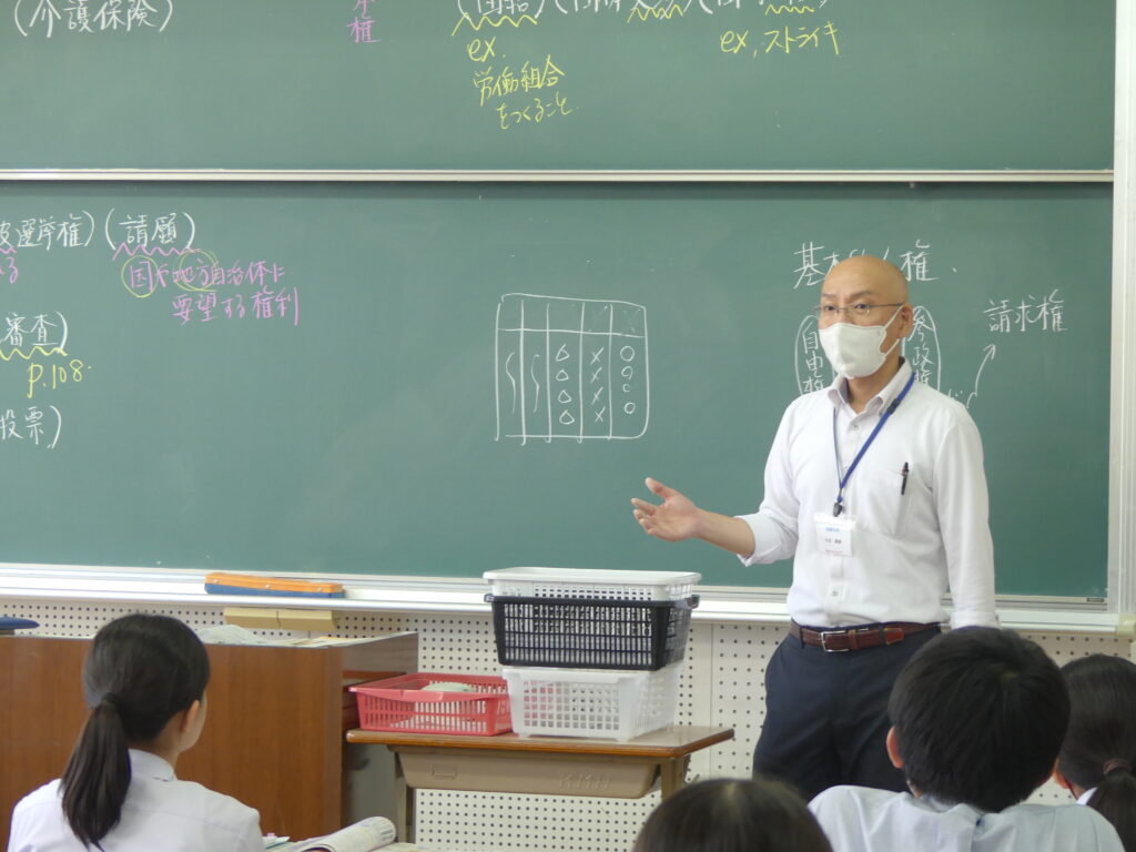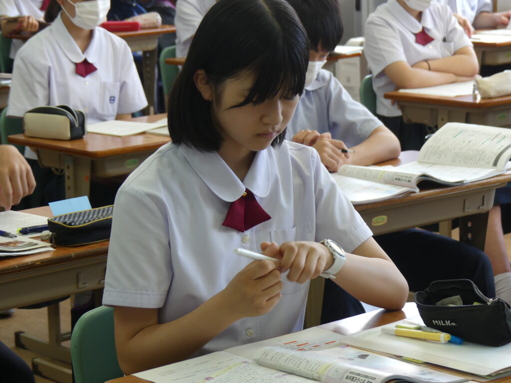 生徒と対話する中で、最近の話題などをからめて行う授業展開がなされていました。