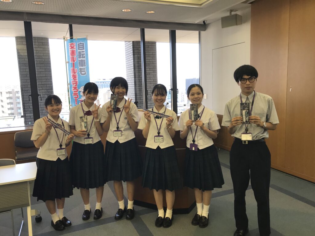 本日は「第4回宮崎県警察自転車等総合対策検討委員会」が8月1日(木)に県警本部で開かれ、本校が参加した時の様子をお届けします。本校からは、生徒会長の中武そらさん、生徒会副会長の上米良ゆいさん、そして生活交通委員会の委員長の大嘉田梨音さんが参加しました。意見交換会の場では、自転車のヘルメットの重要性を主張し、私服でもおしゃれに身に付けることが出来るヘルメットの紹介をしました。