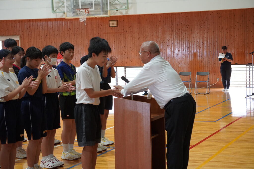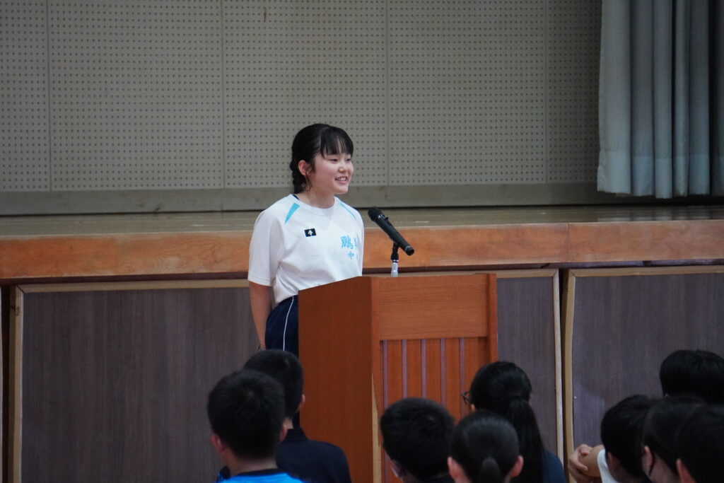 先日の月曜日、今月末から行われる秋の地区中体連壮行式を実施いたしました。土肥隆夫校長先生から激励の言葉をいただきました。生徒会長の中武そらさんからも激励の言葉をいただき、各部活動のキャプテンからの意気込みなど、力強く語ってくれました。