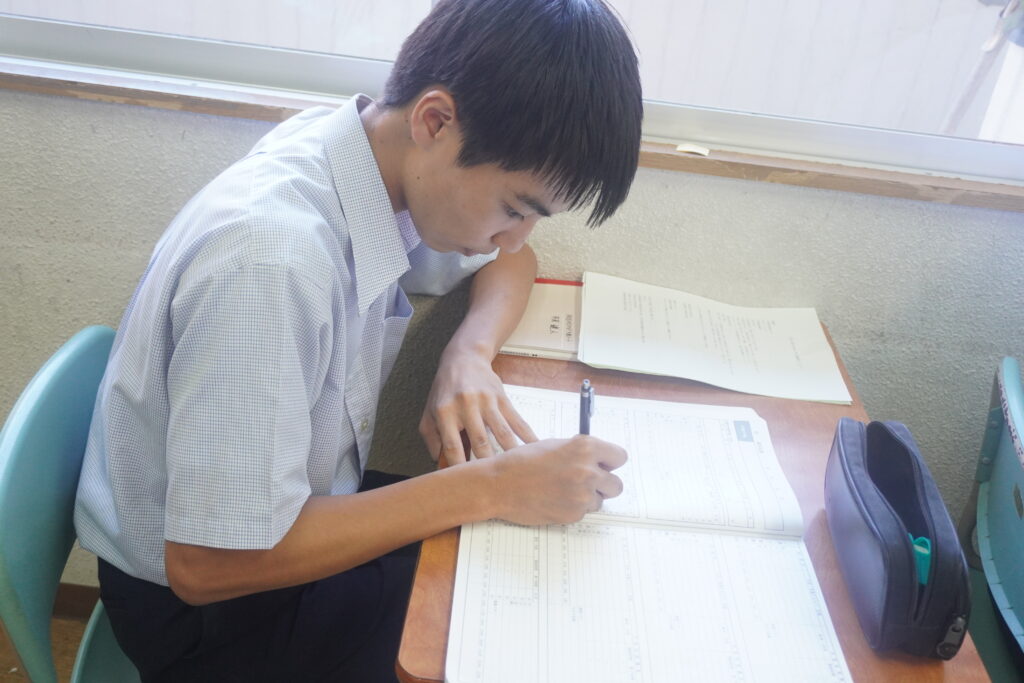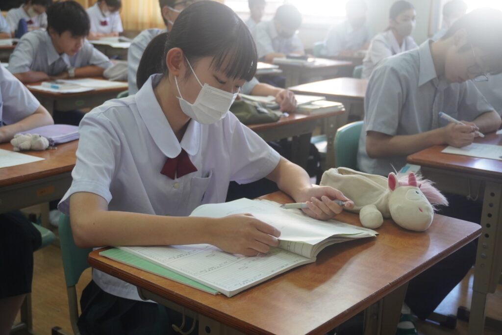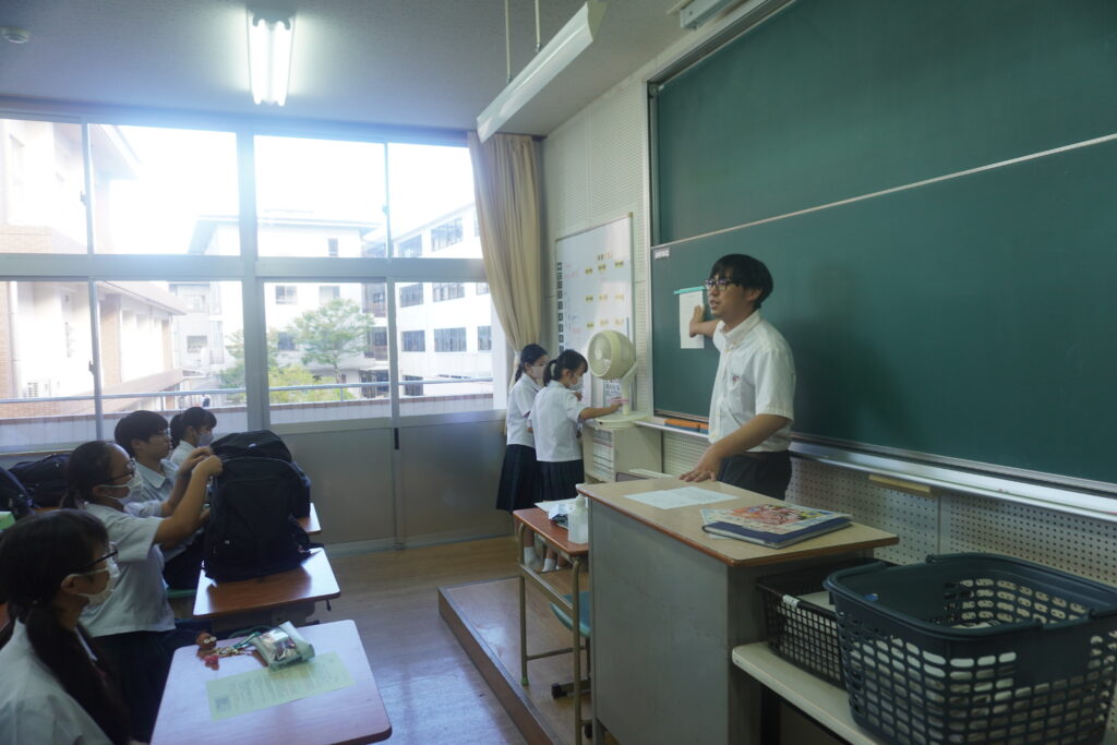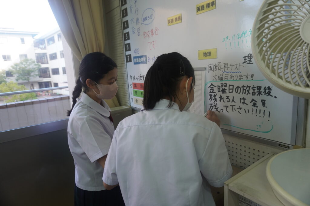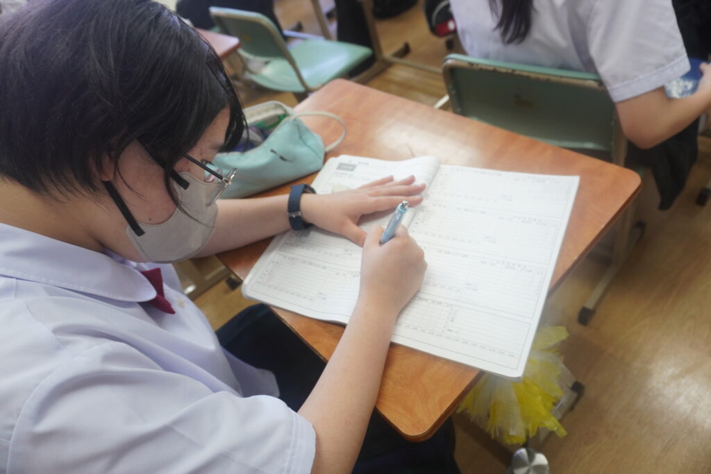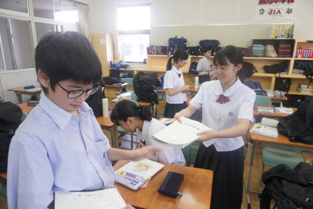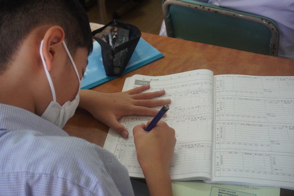 帰りの会の様子です。帰りの会では、今日がどんな一日だったのかを振り返り、明日へとつなげる大切な時間です。係の生徒が配付物を配ったり、連絡事項を伝達します。生徒たちは、忘れないように生活の記録に記入する姿が見られます。