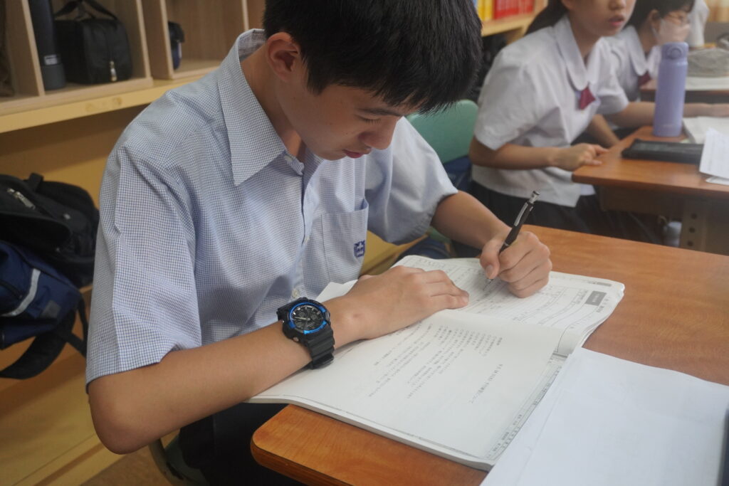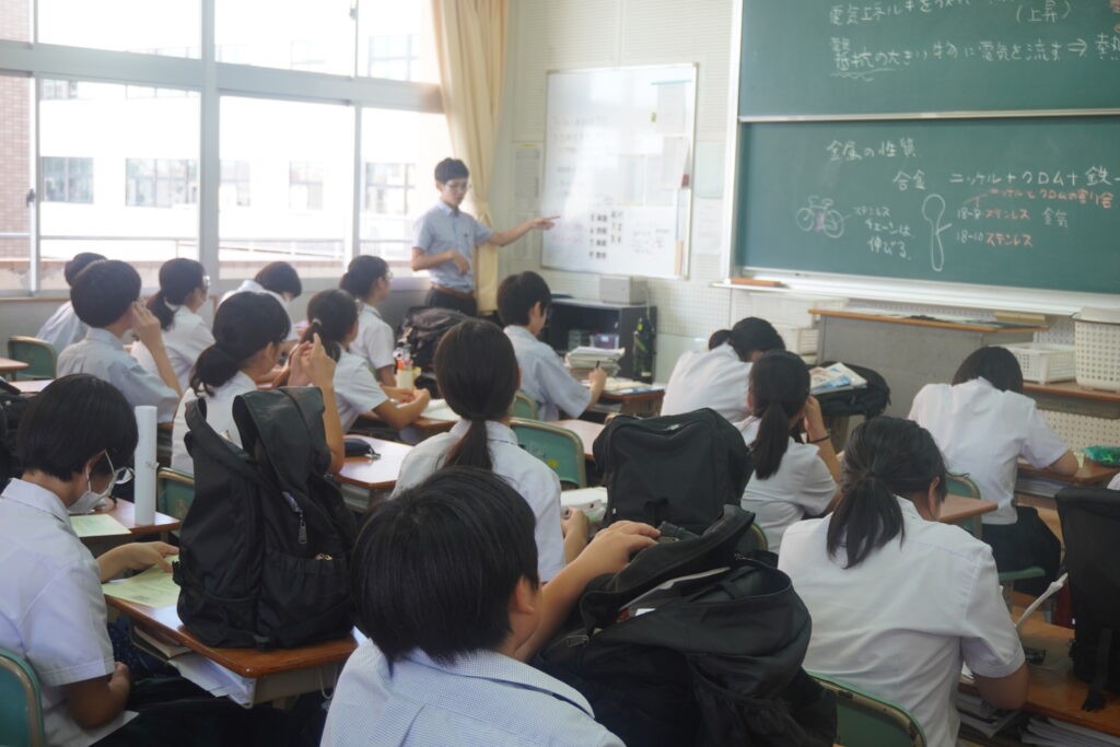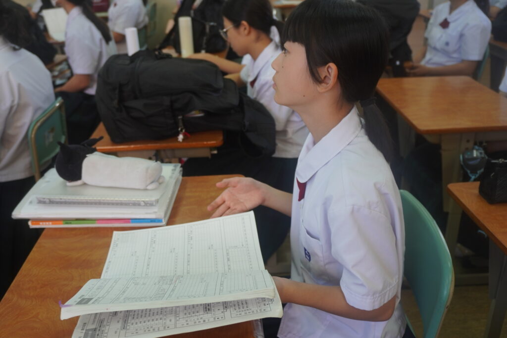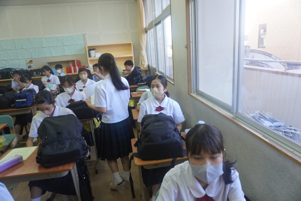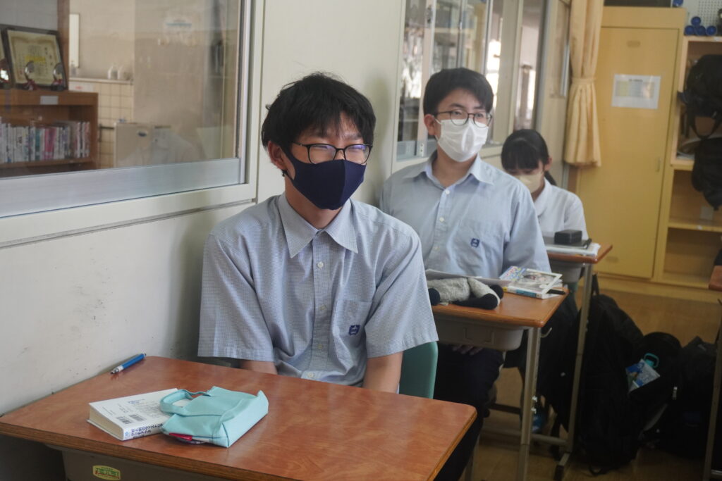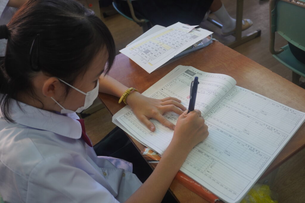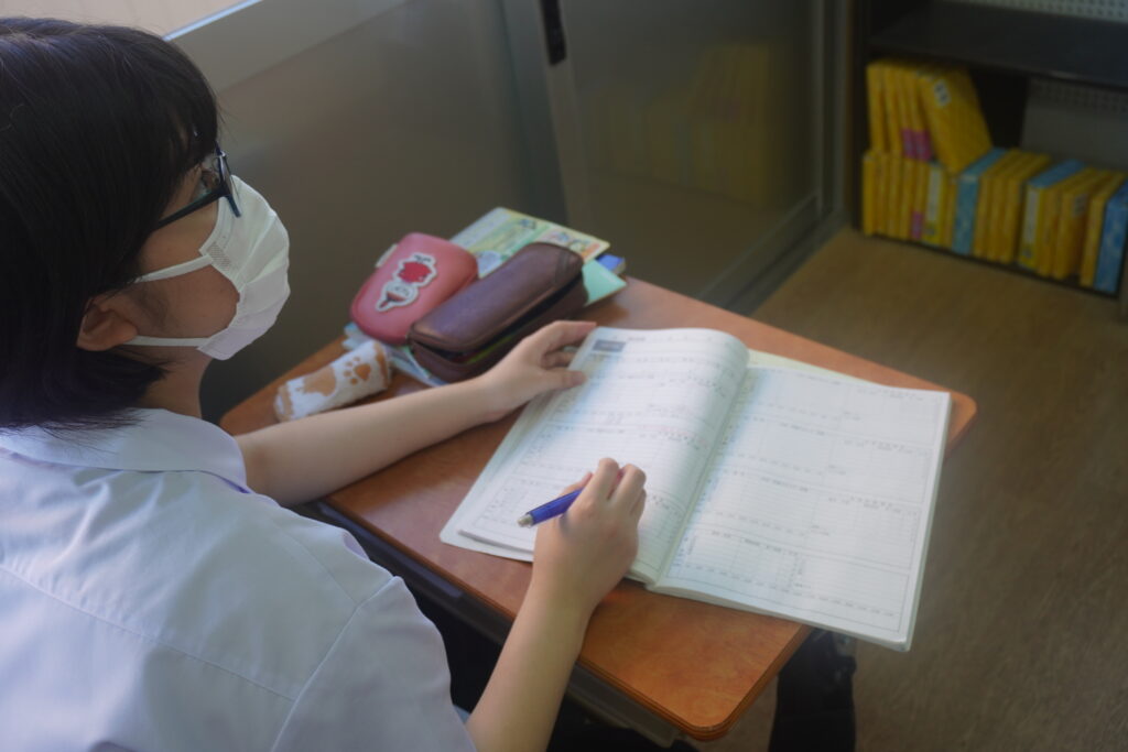 帰りの会の様子です。帰りの会では、今日がどんな一日だったのかを振り返り、明日へとつなげる大切な時間です。係の生徒が配付物を配ったり、連絡事項を伝達します。生徒たちは、忘れないように生活の記録に記入する姿が見られます。