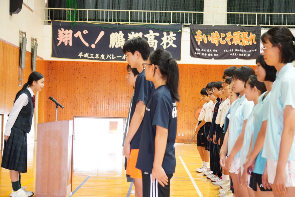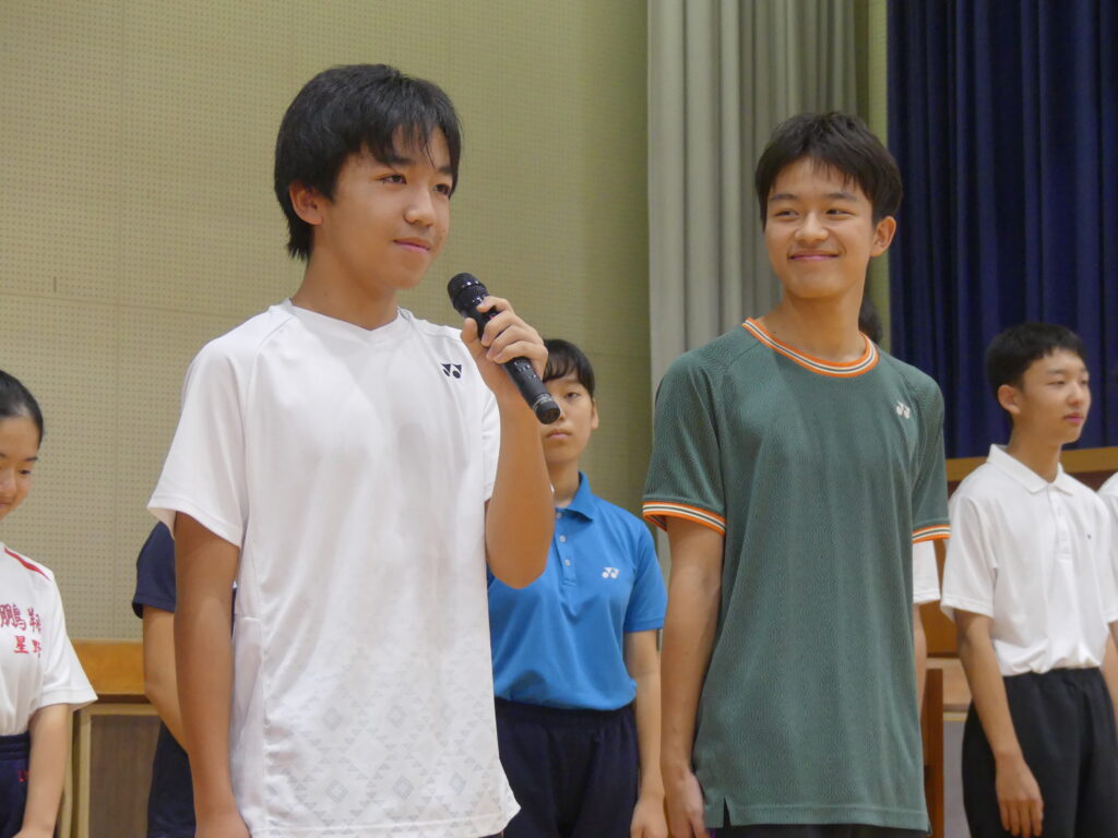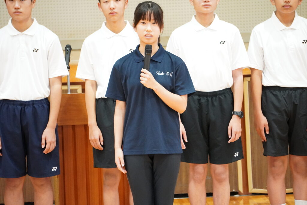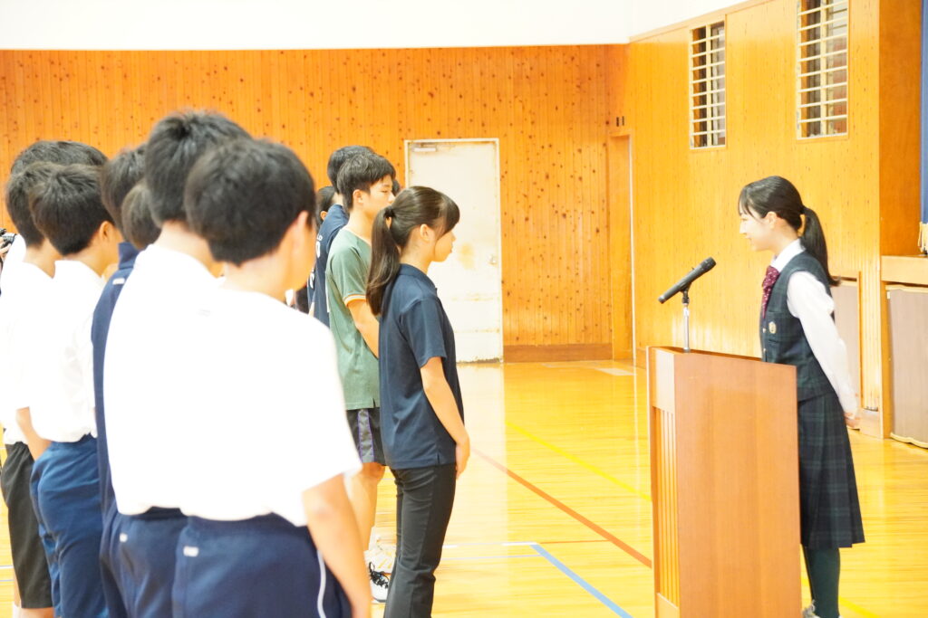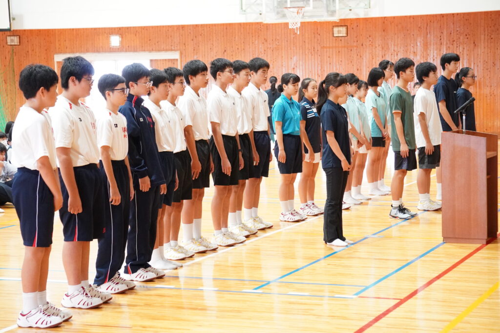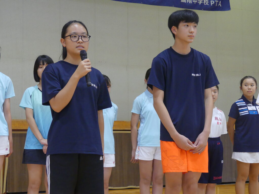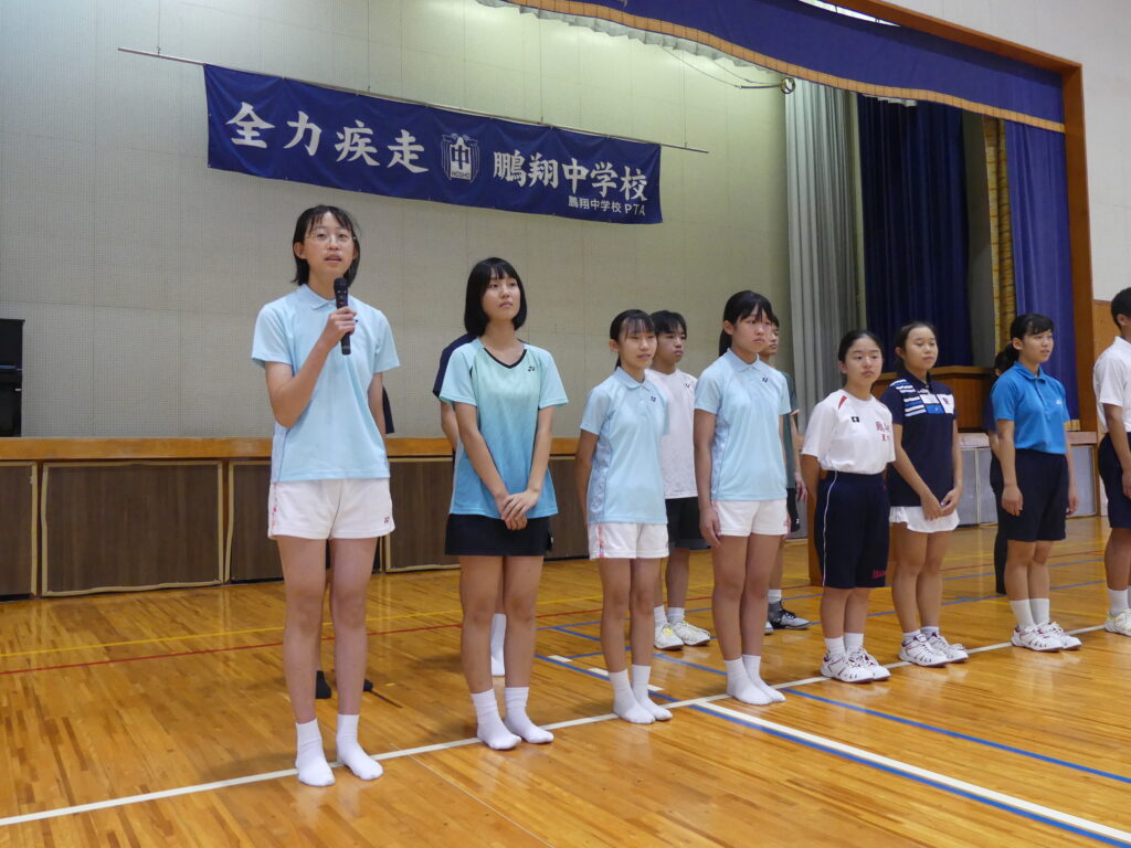 本日の4限目に宮崎県中学校秋季体育大会の壮行式が行われました。県大会に出場するのは、硬式テニス部、陸上部、バドミントン部、新体操部です。 各部全校生徒の前で大会への抱負を述べました。 各部の健闘を祈ります! 女子 硬式テニス部男子 硬式テニス部陸上部バドミントン部新体操部