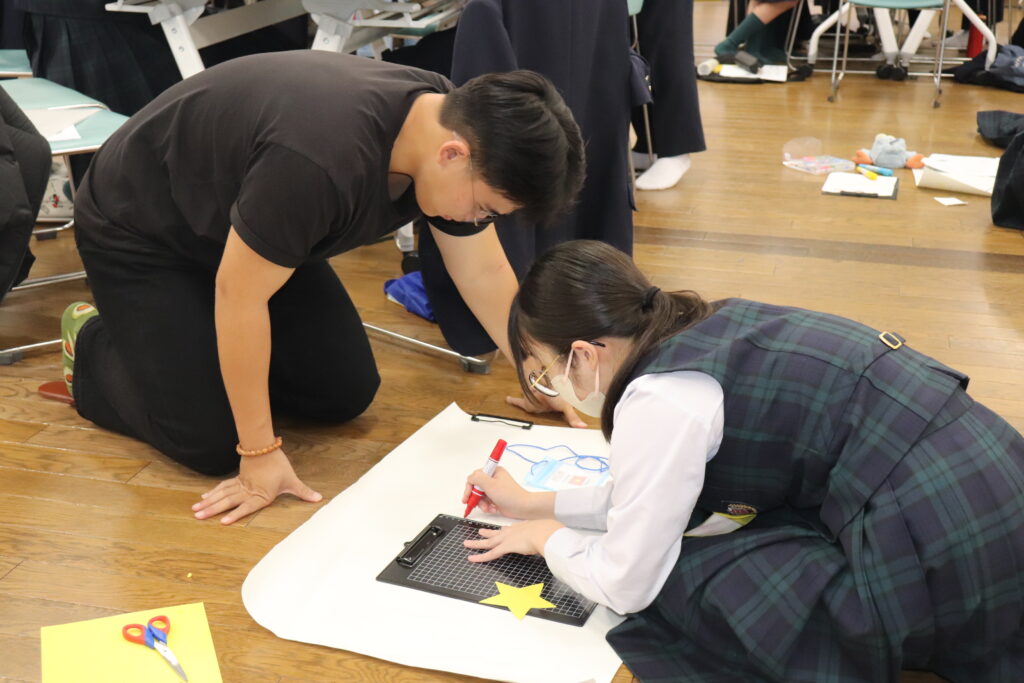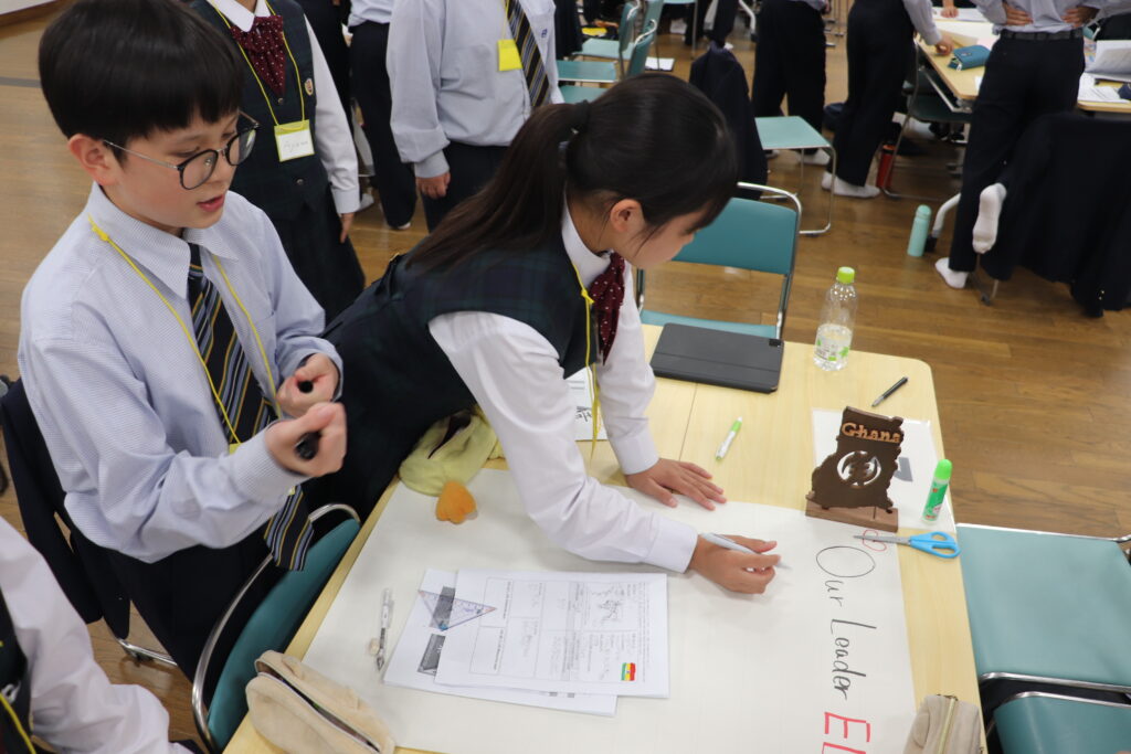 みんなに自分たちのリーダーを知ってもらうために、分かりやすいポスターを作成しようと工夫をしながらポスターを作成します。書き方に迷ったときにはリーダーに聞いてアドバイスをもらいます。
