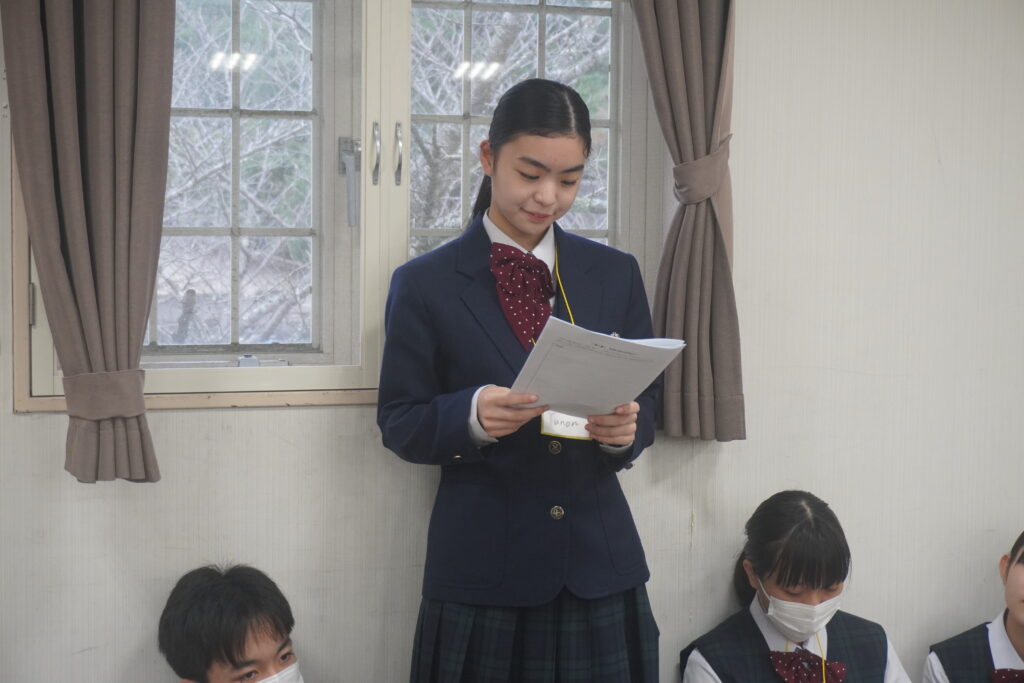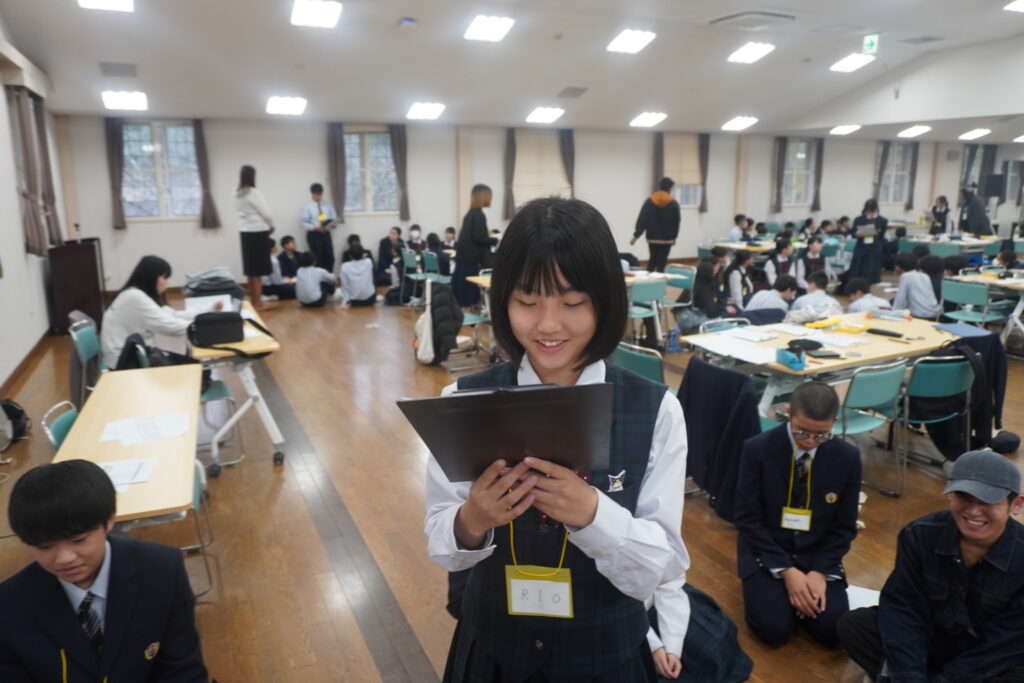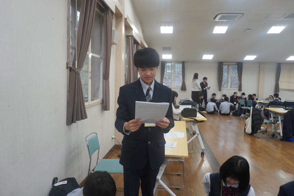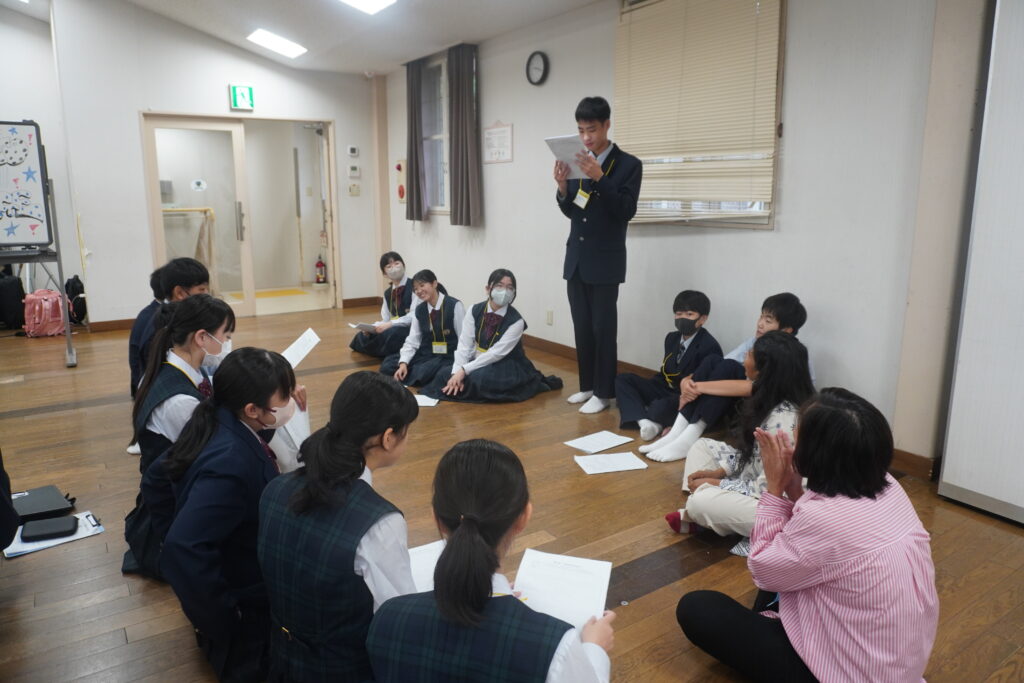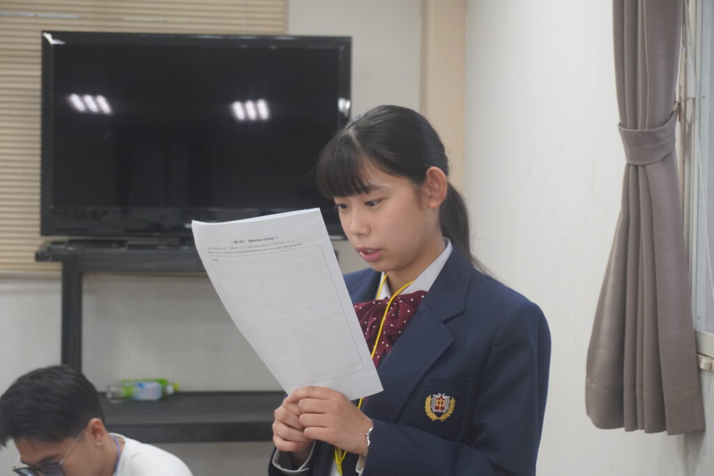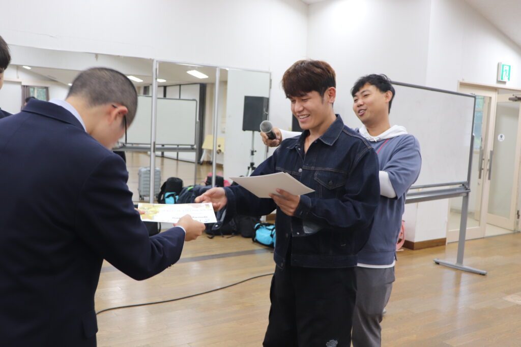 この2日間で感じたことをぜひ今後の学校生活に生かしてほしいと思います。発表後は今回のプログラムの振り返りをして、リーダーから一人一人終了証書をもらいました!J2生を代表して窪田悠人さん(宮崎南小出身)がお礼の言葉を述べました。グローバルリーダーからは今回のプログラムログで学んだことを忘れないでほしい。とメッセージをもらいました!